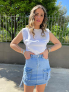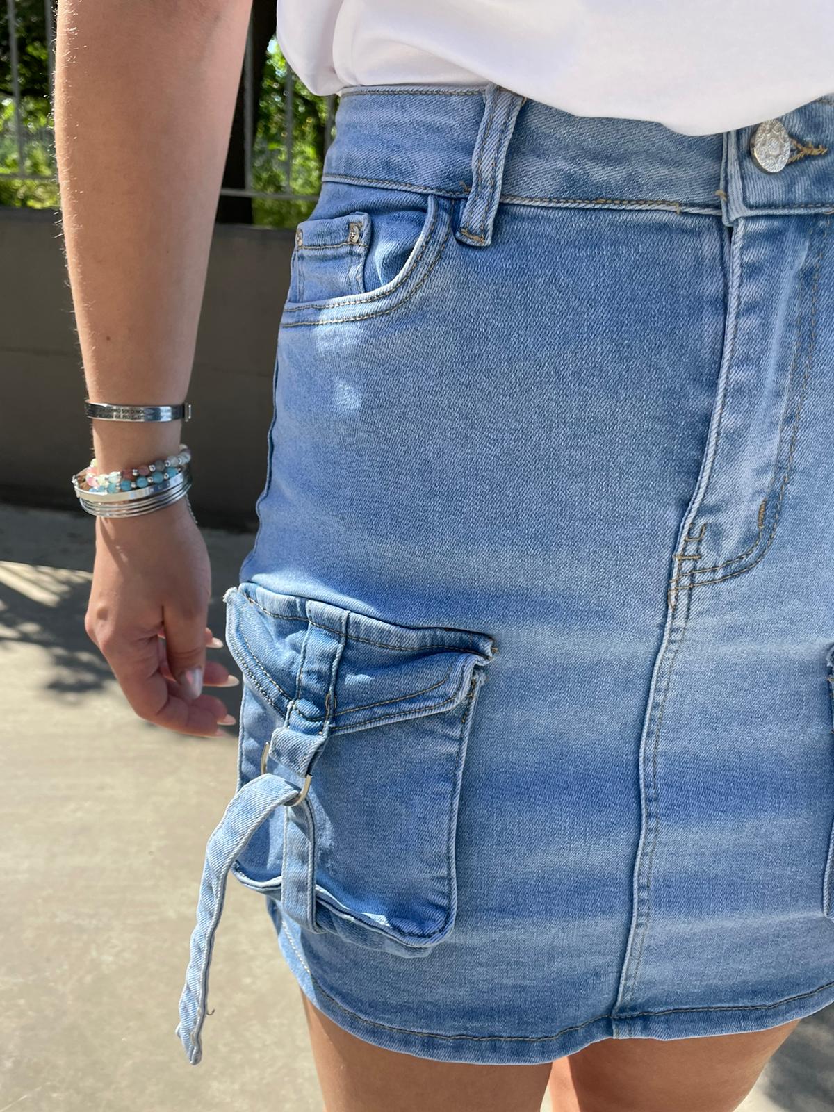 Mini gonna di jeans lavaggio chiaro con tasconi