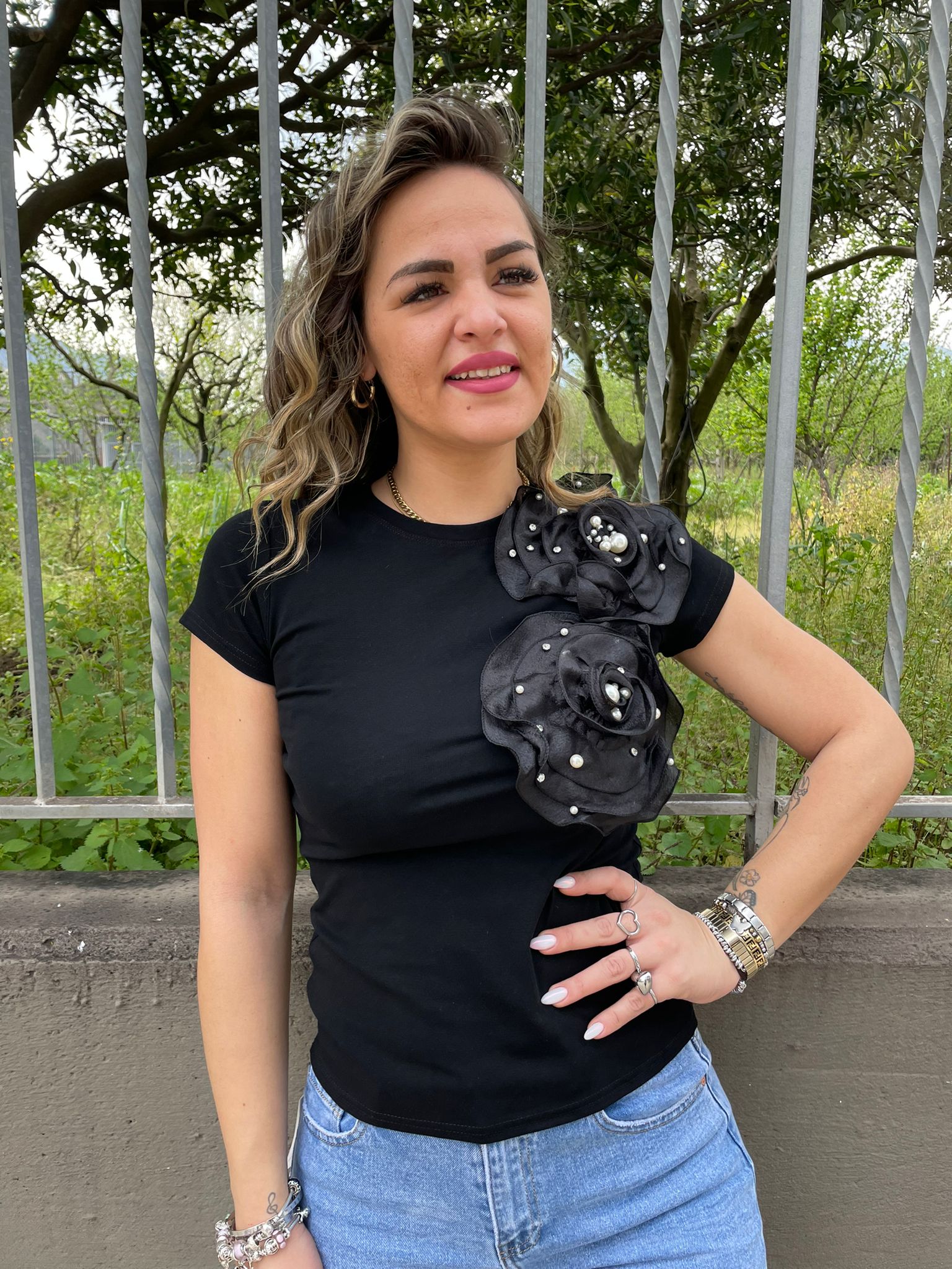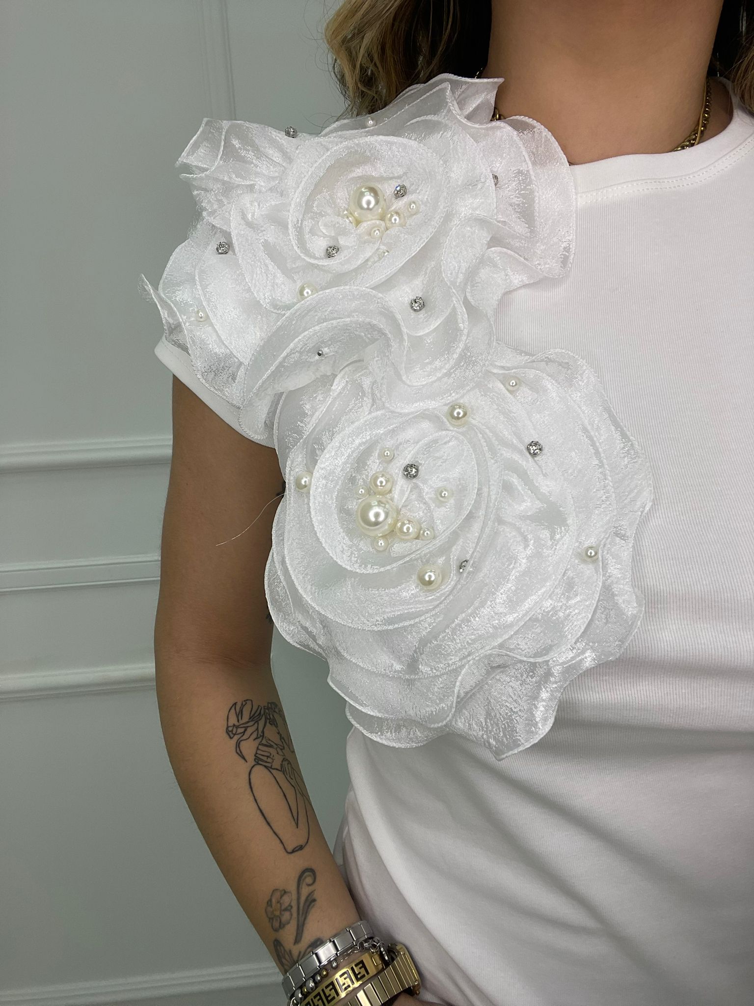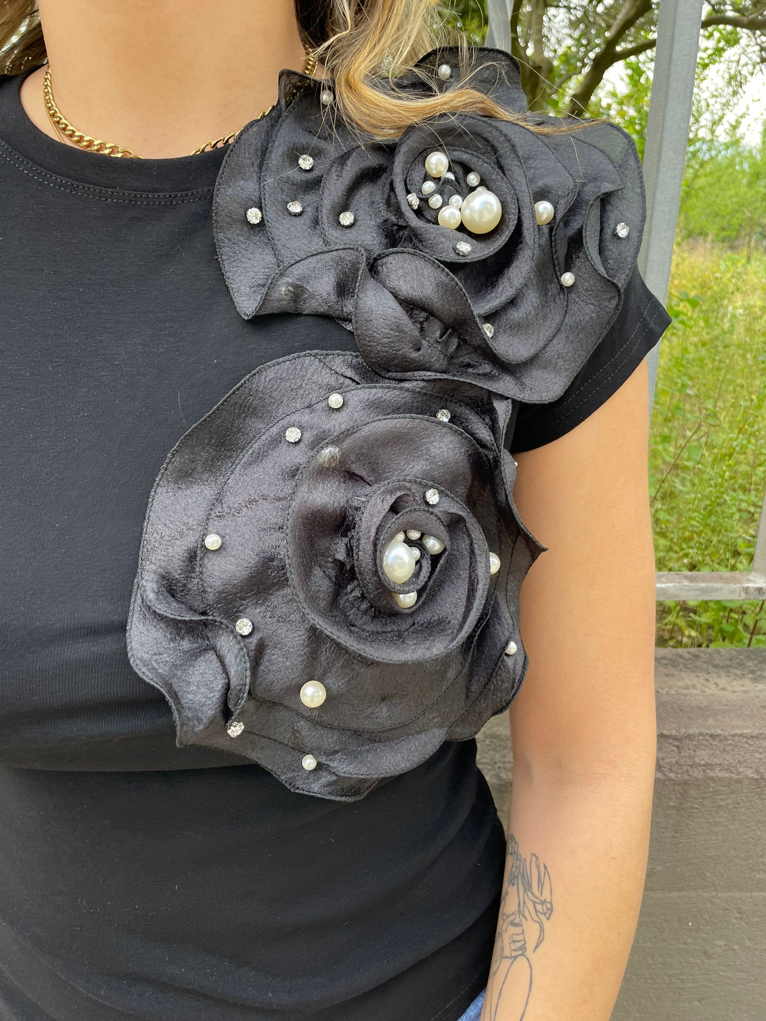 T-shirt con applicazioni rose in tulle