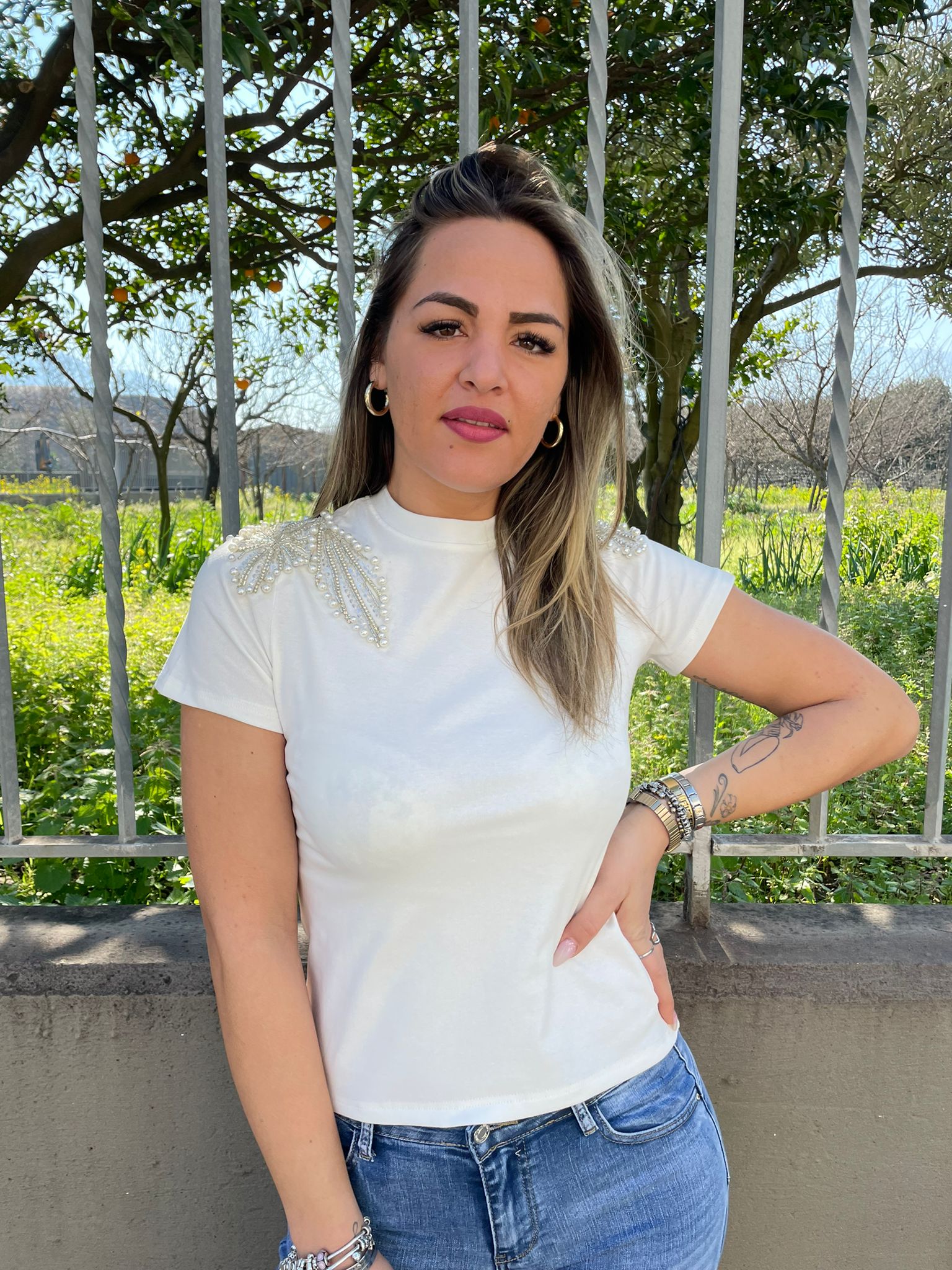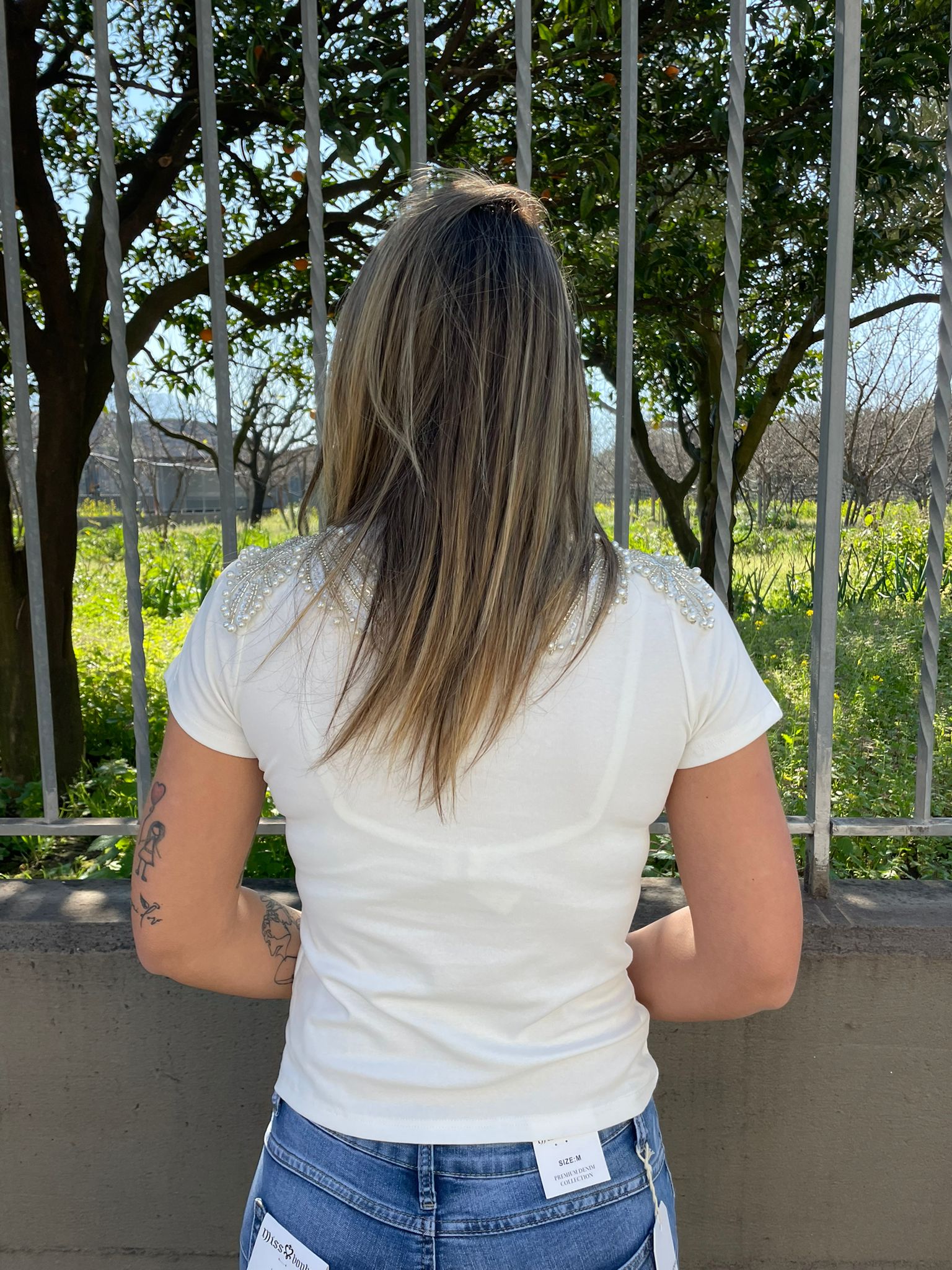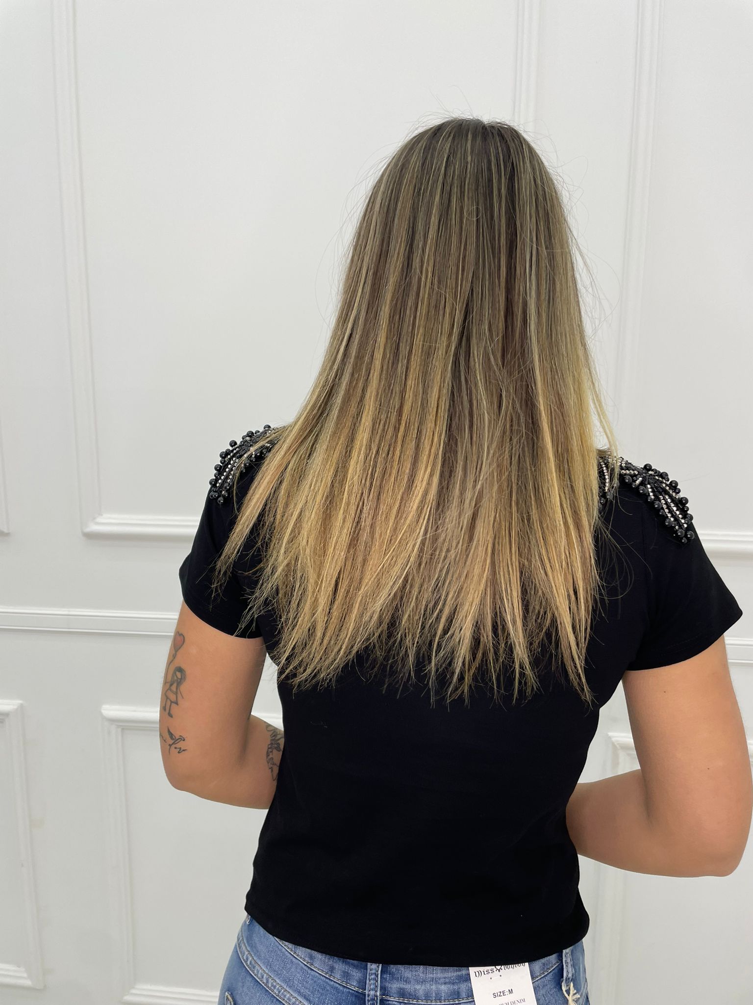 T-shirt tinta unita con applicazioni alle spalle