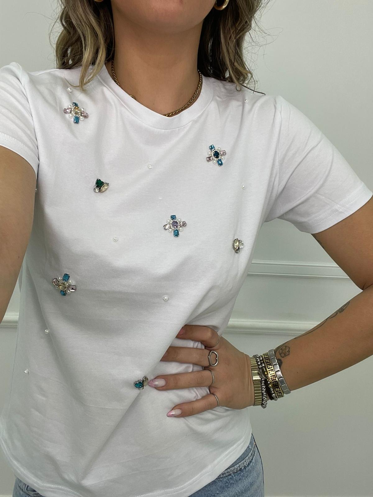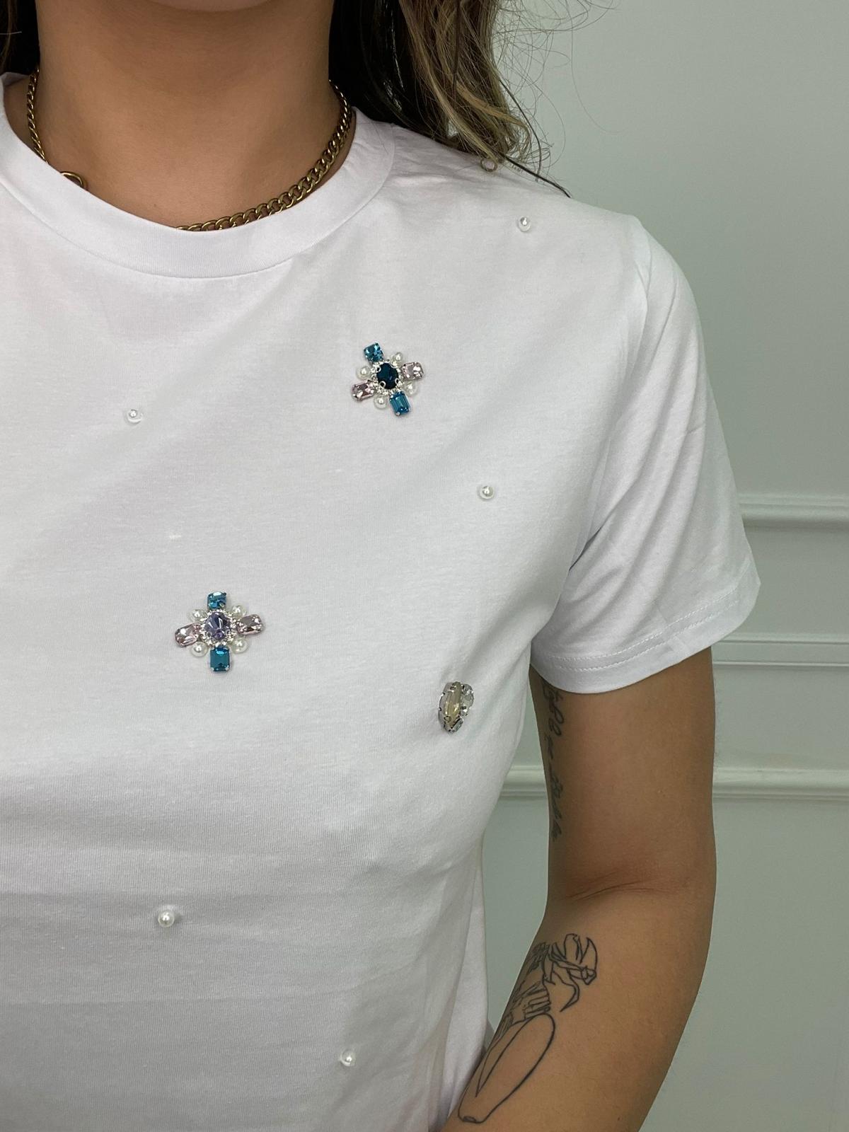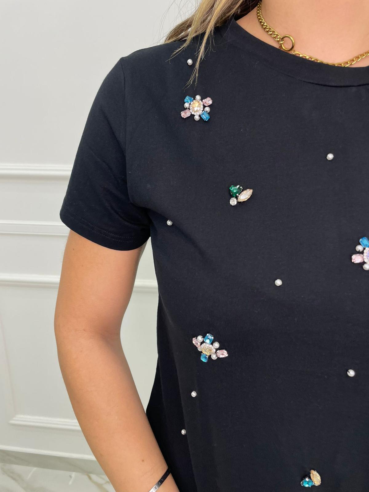 T-shirt tinta unita con pietre colorate e perline