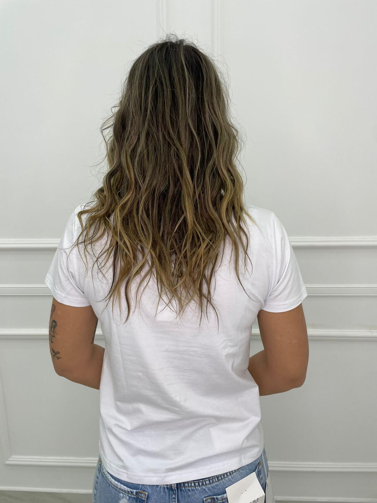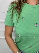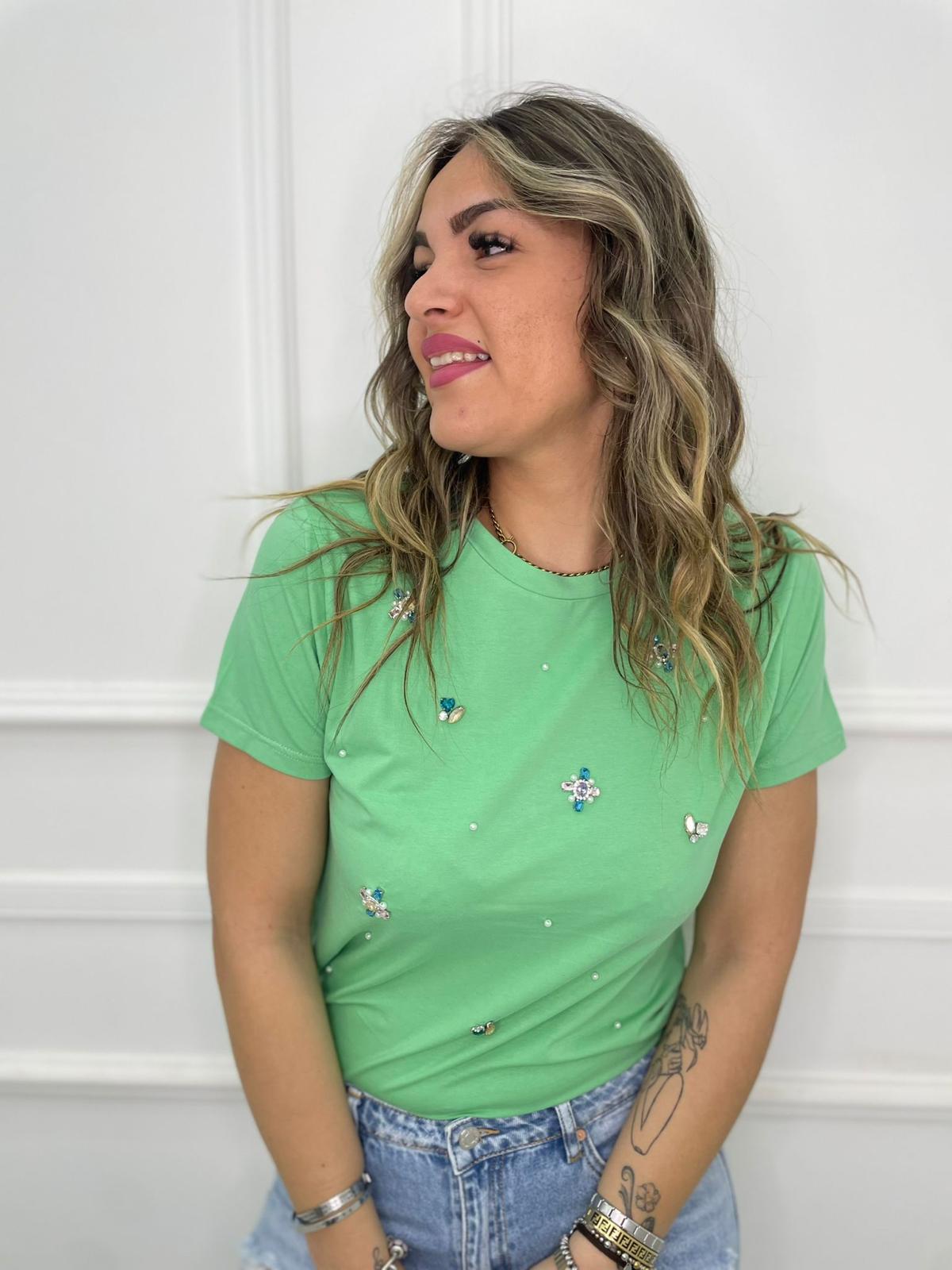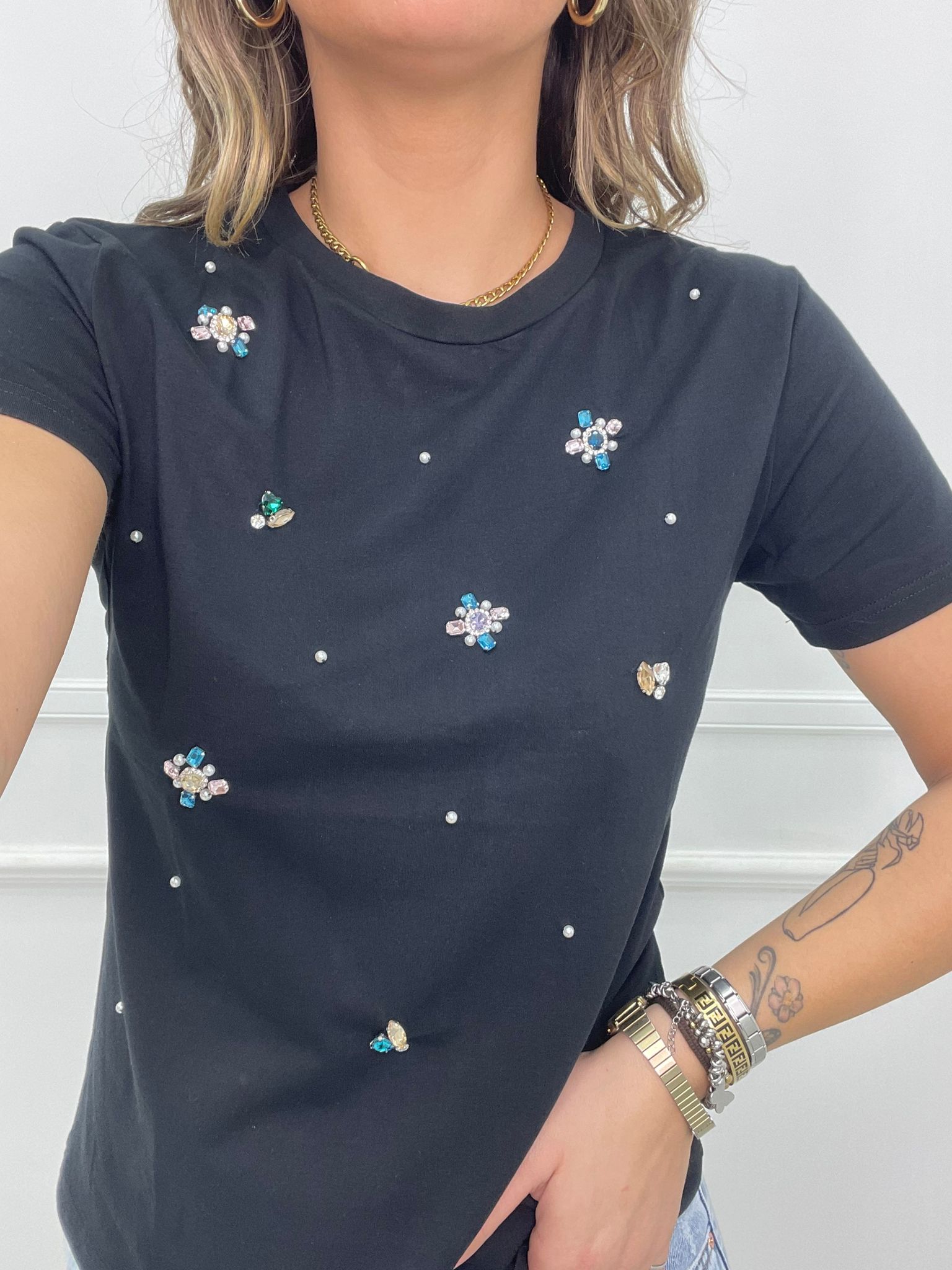 T-shirt tinta unita con pietre colorate e perline