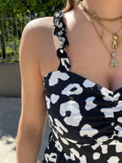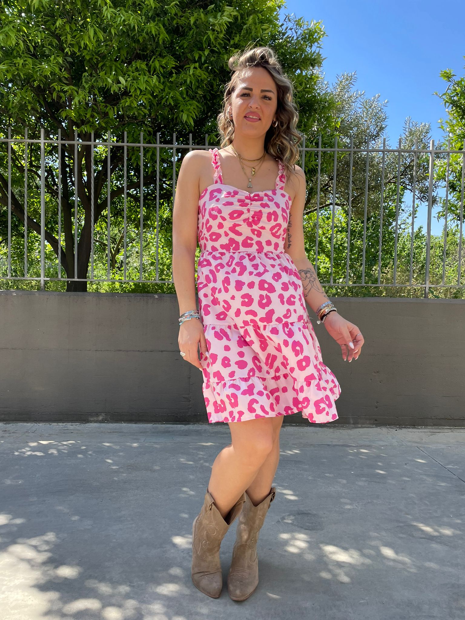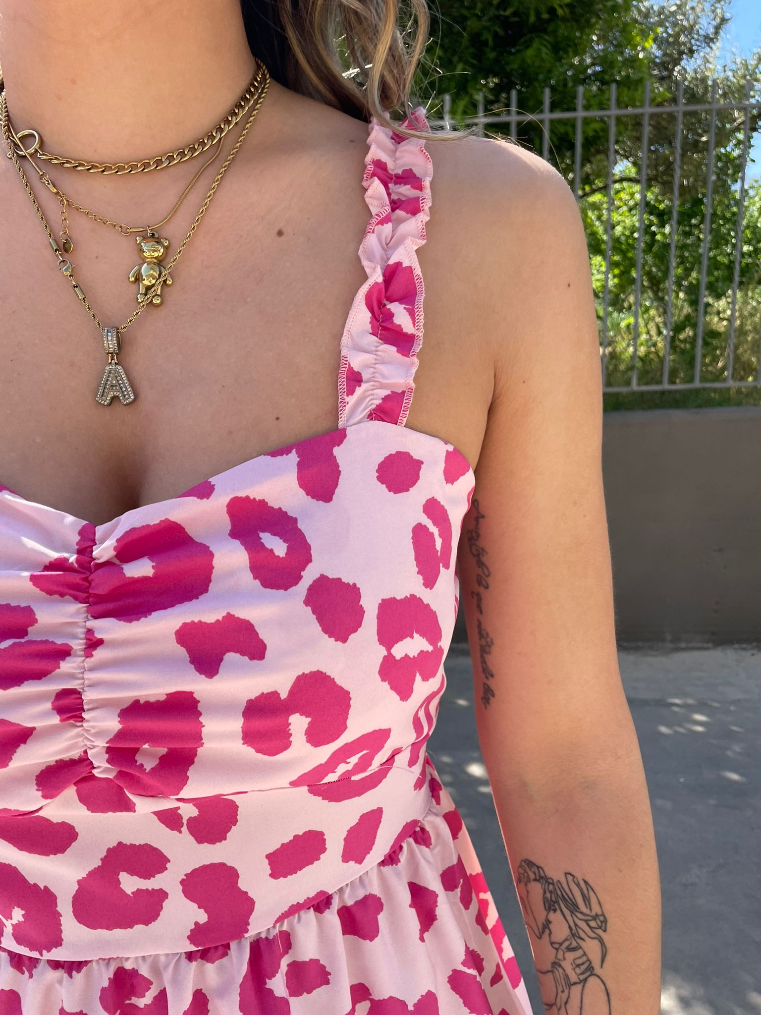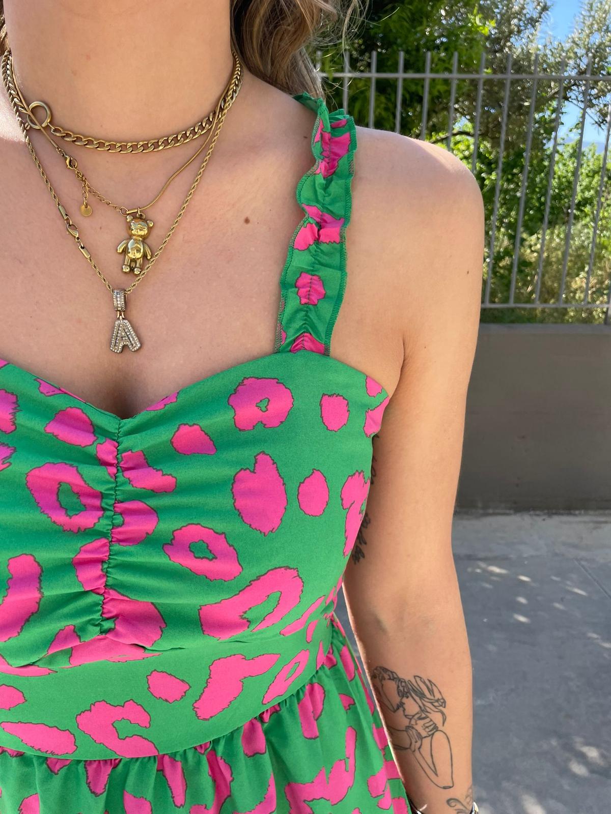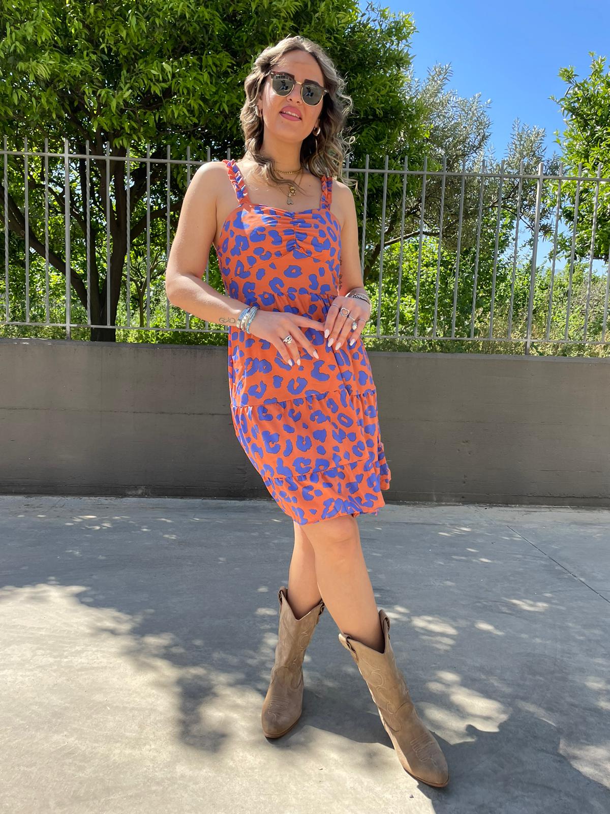 Vestitino fantasia maculata con bretelle con rouches