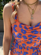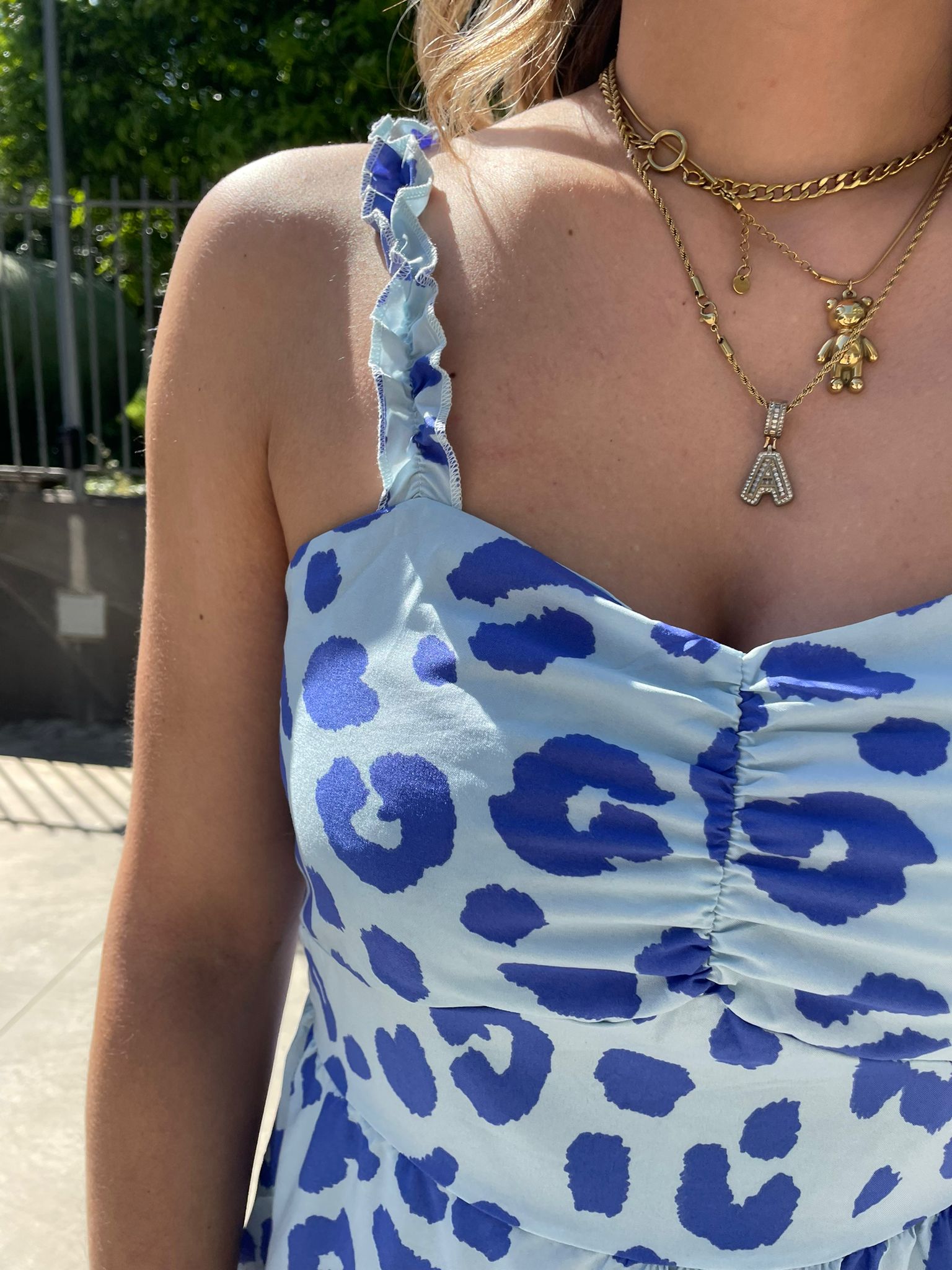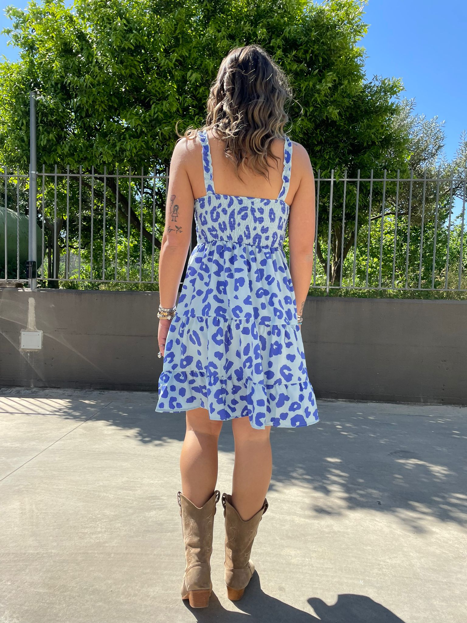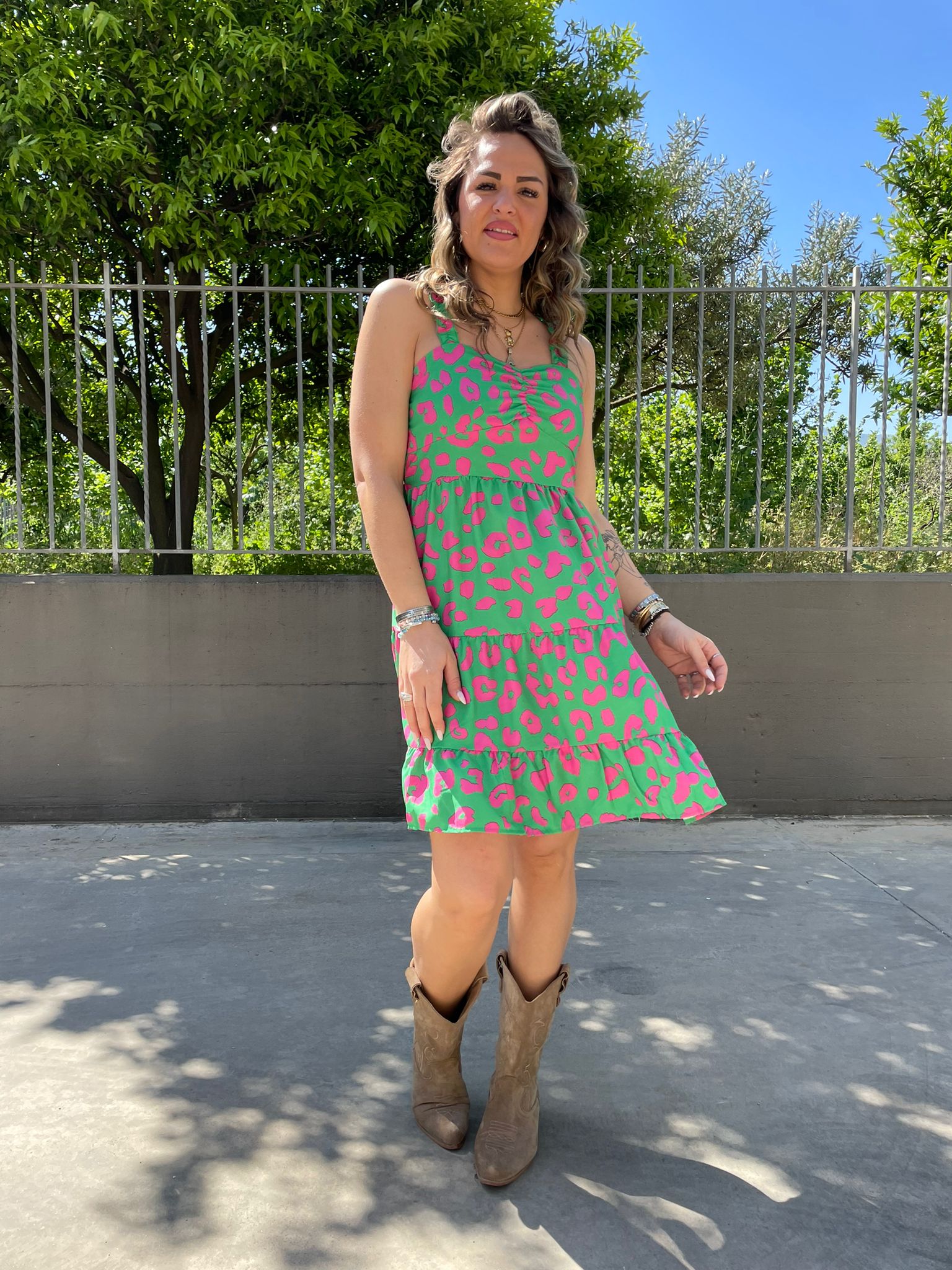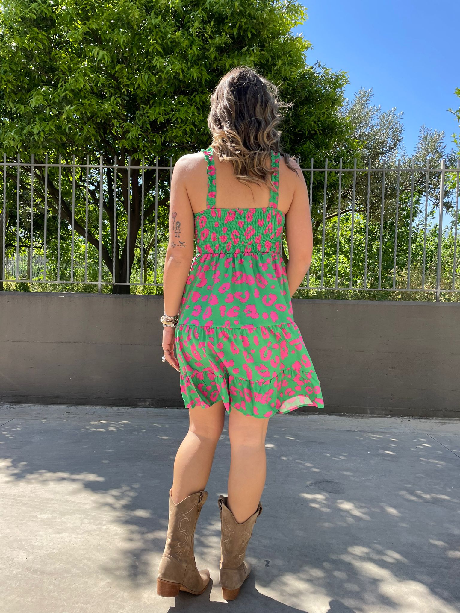 Vestitino fantasia maculata con bretelle con rouches