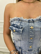Vestito di jeans lavaggio chiaro con scollo a cuore sfrangiato