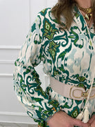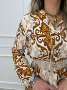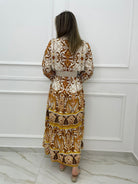 Vestito lungo effetto lino a fantasia con maniche a sbuffo