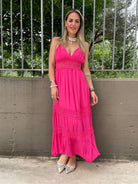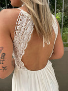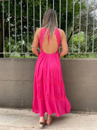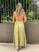 Vestito lungo effetto lino con parti ricamate e schiena scoperta