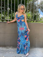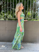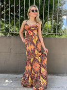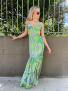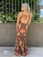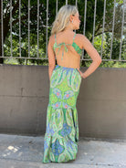 Vestito lungo fantasia colorata con schiena scoperta e aperture laterali