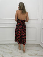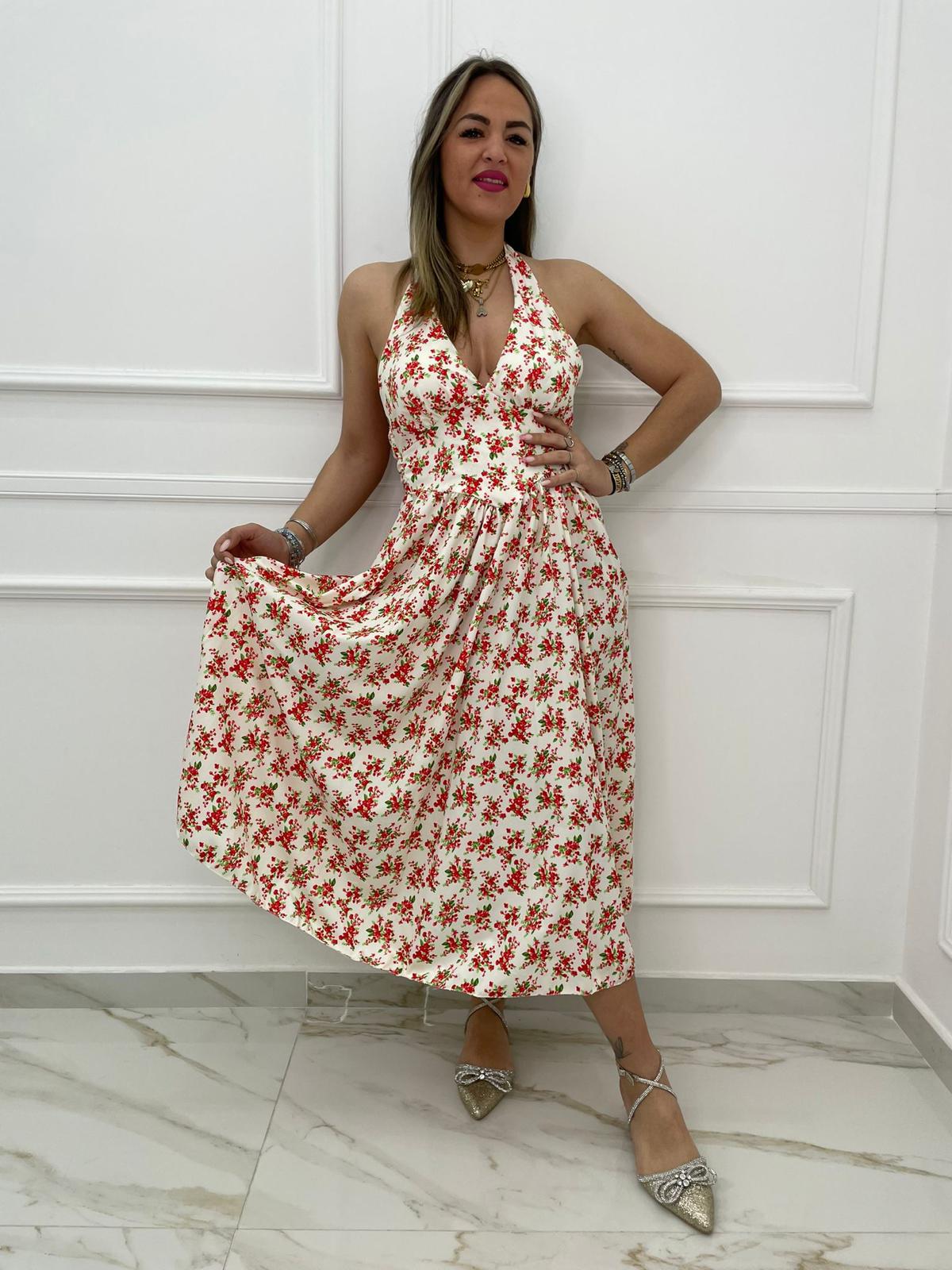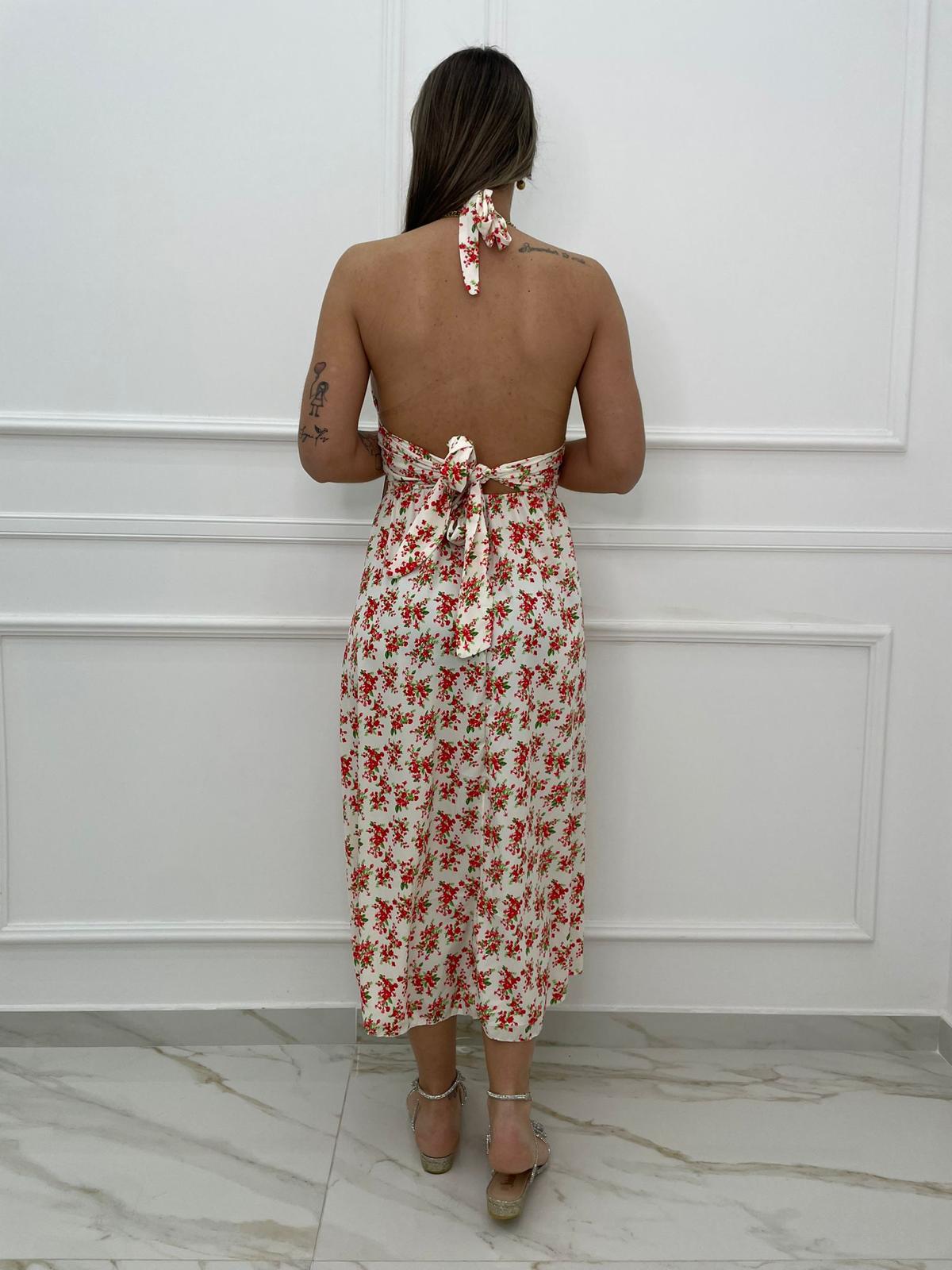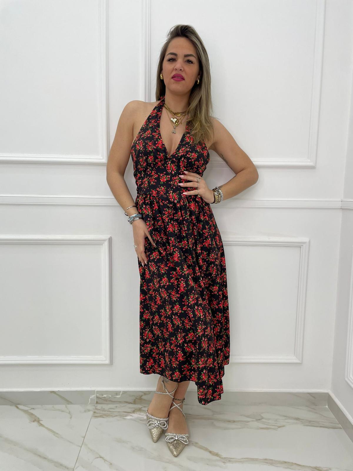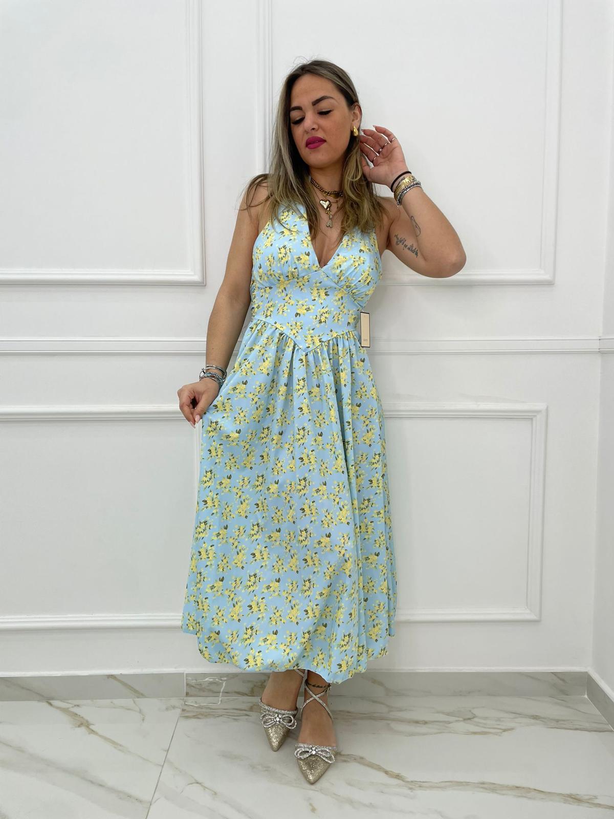 Vestito lungo floreale con scollo all'americana e fiocco dietro