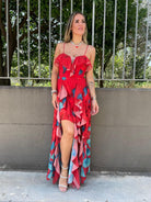 Vestito lungo in chiffon con rouches e spacco