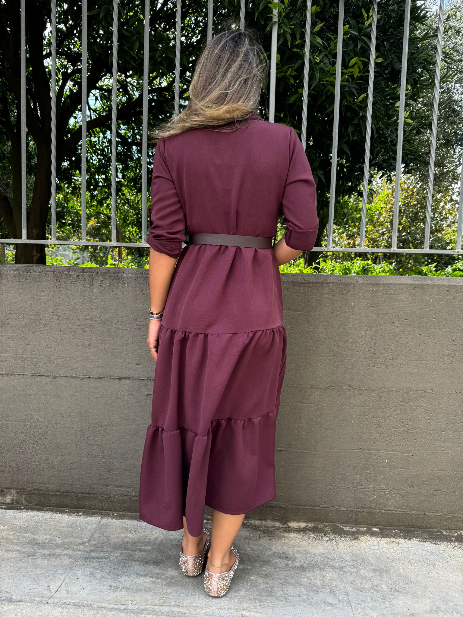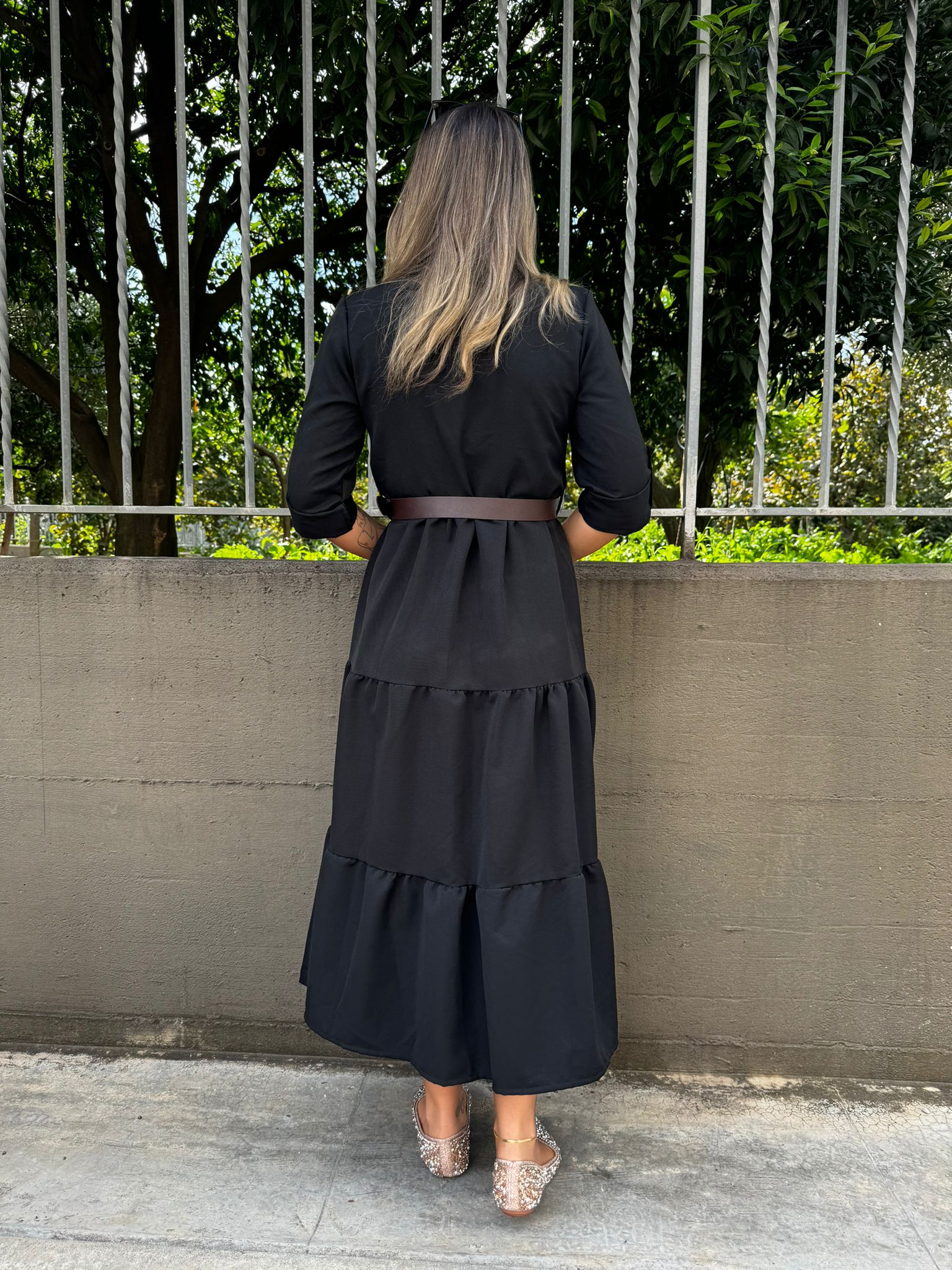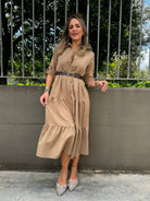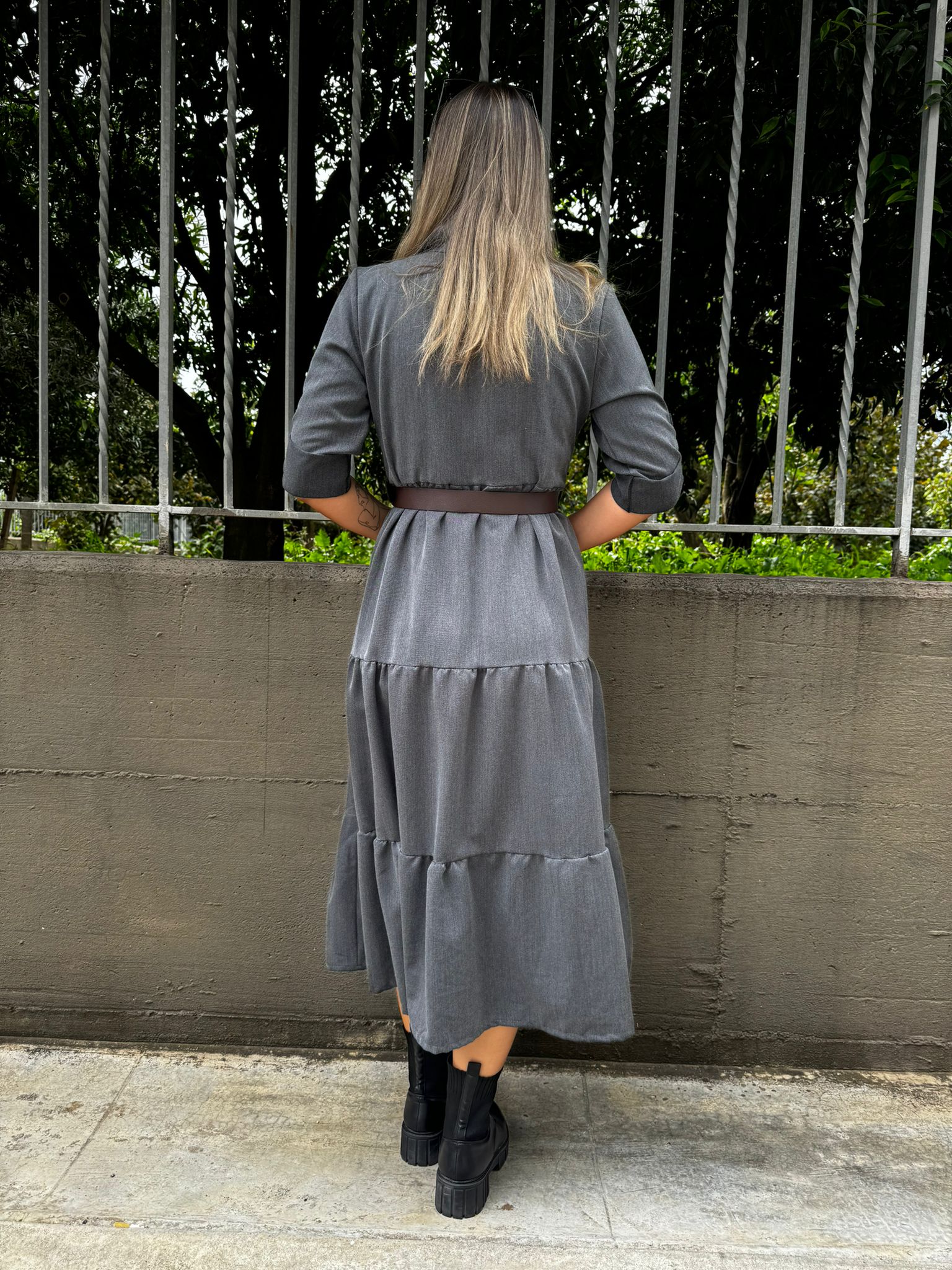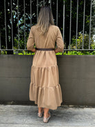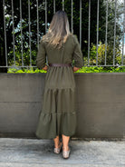 Vestito lungo in panno con balze e cintura