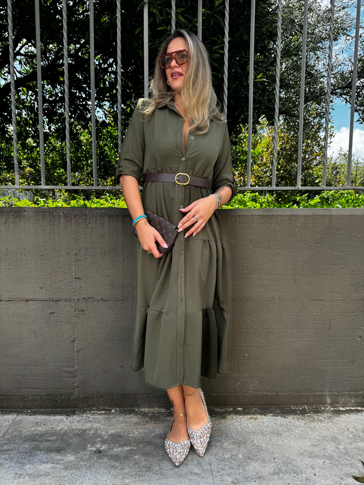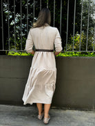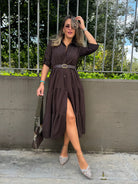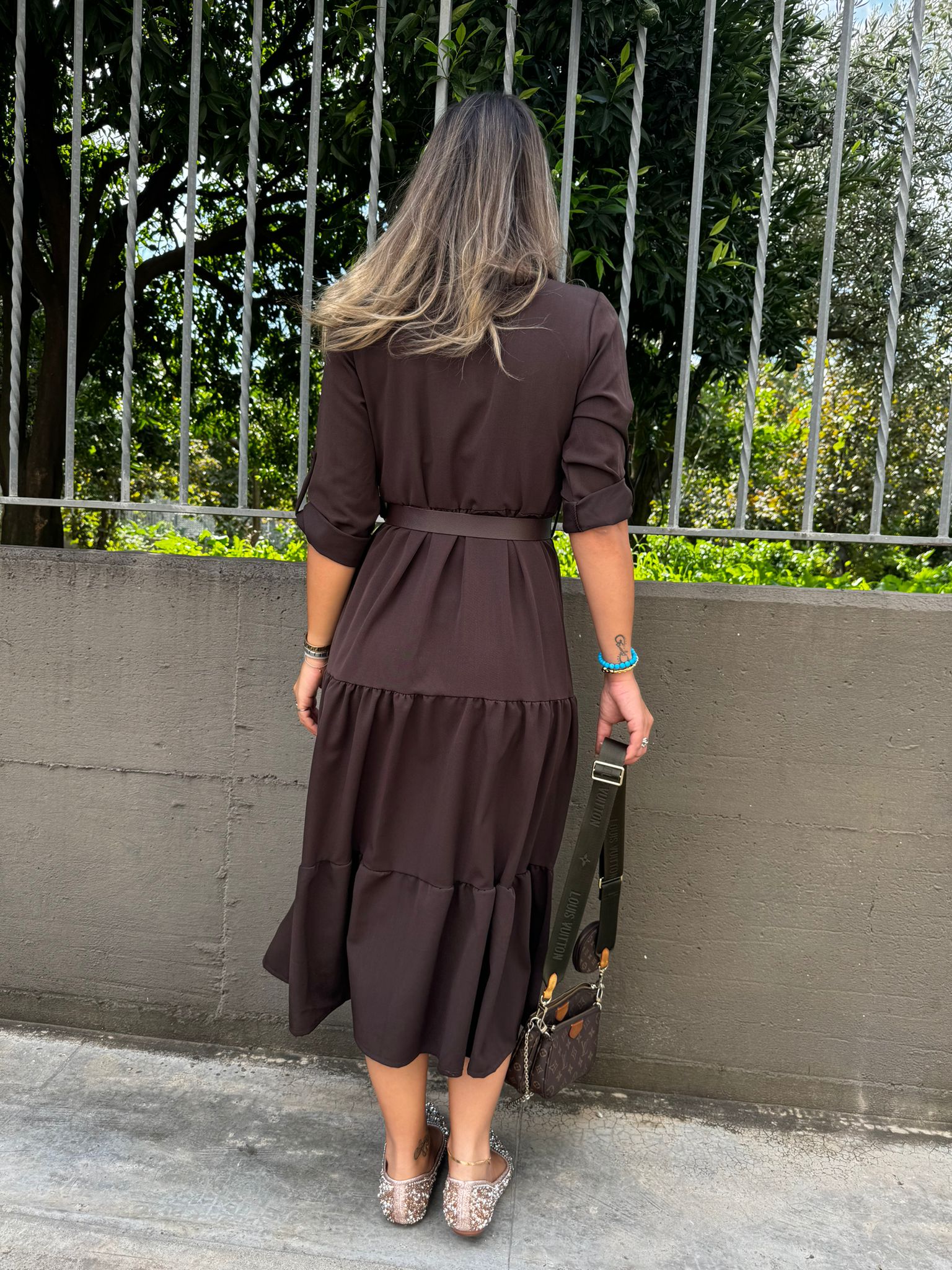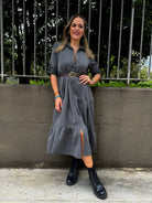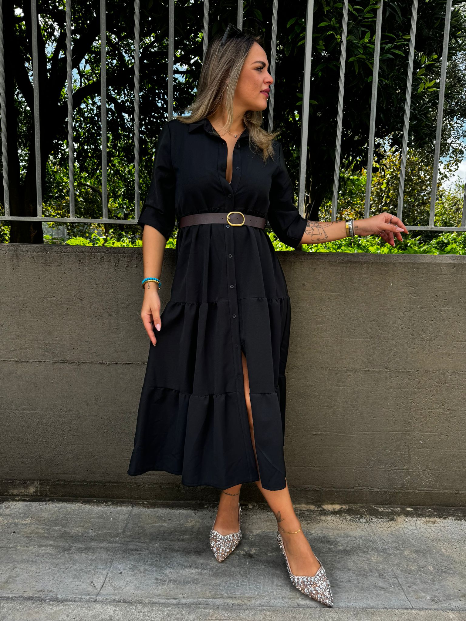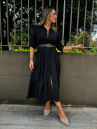 Vestito lungo in panno con balze e cintura
