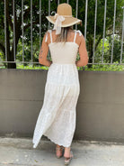 Vestito lungo in pizzo san gallo con fiocchi alle spalle