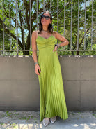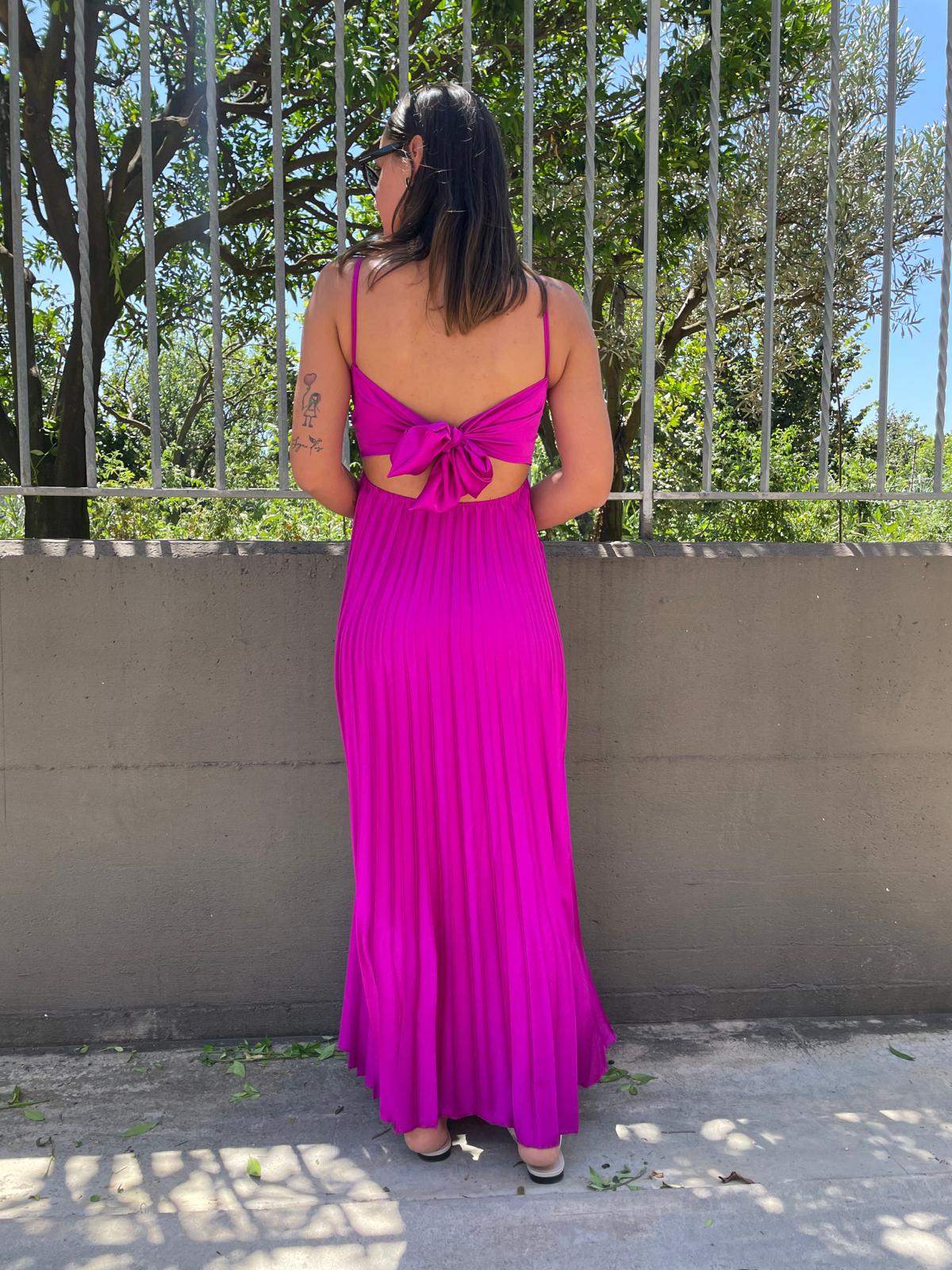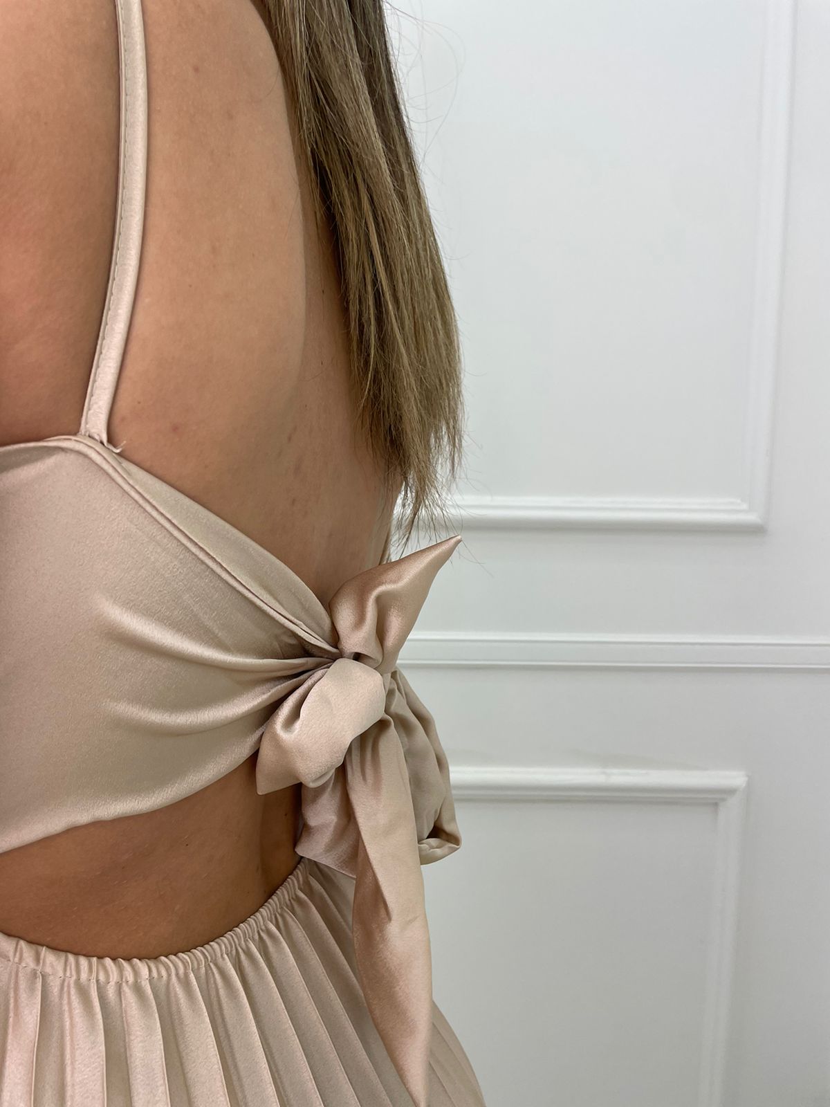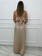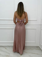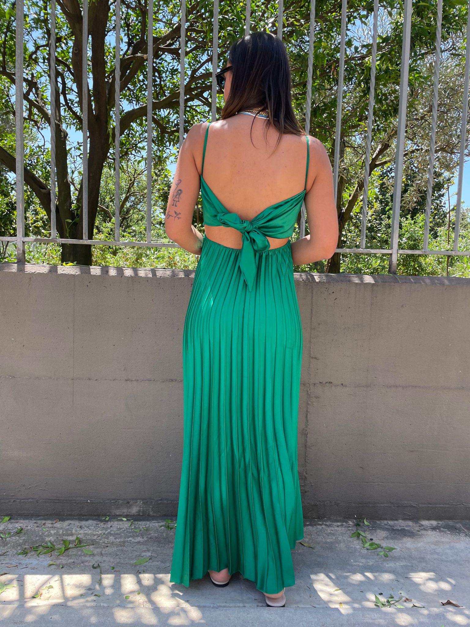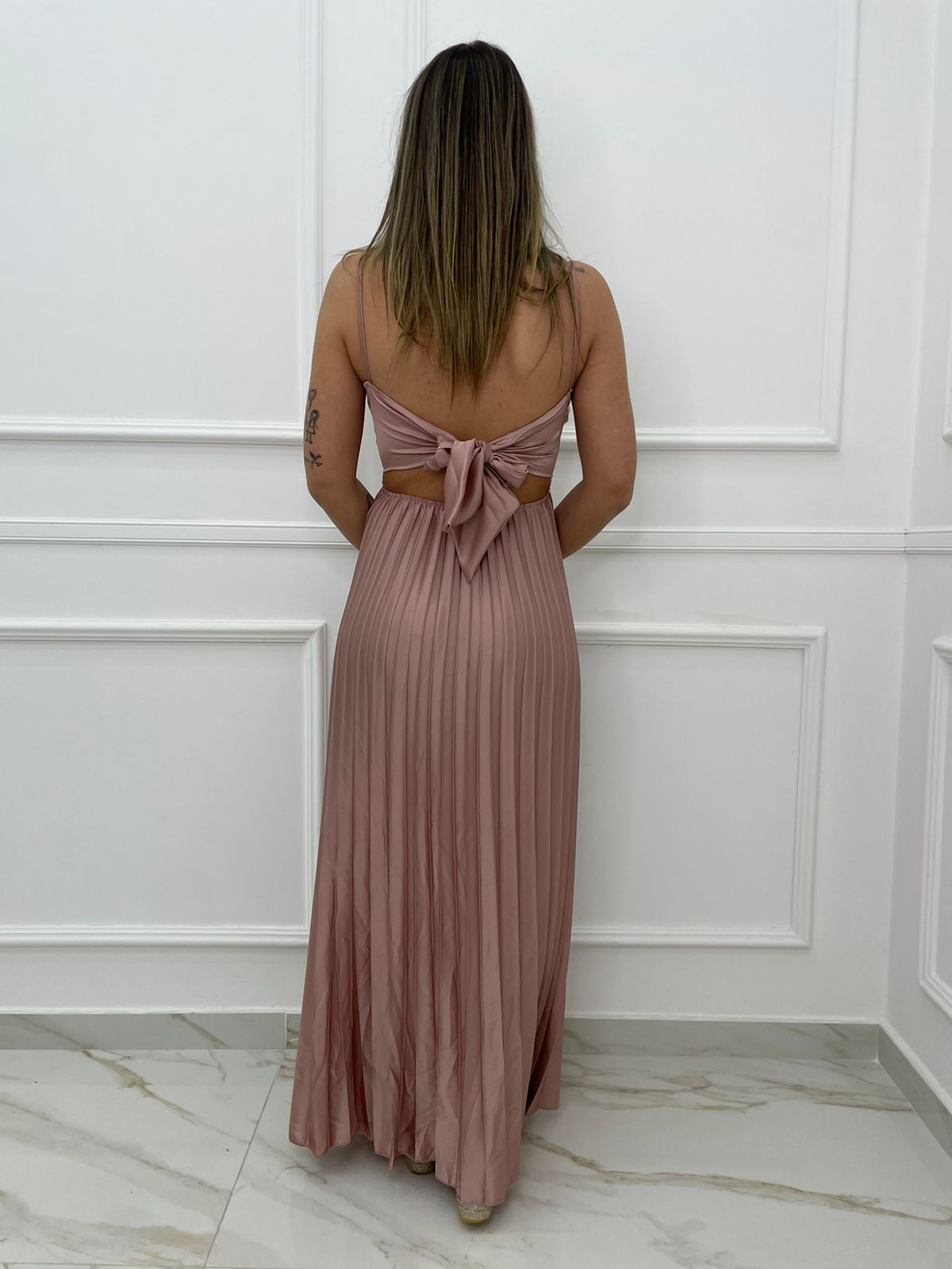 Vestito lungo in simil raso plissettato con fiocco dietro