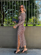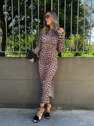 Vestito lungo leopardato con scollo drappeggiato