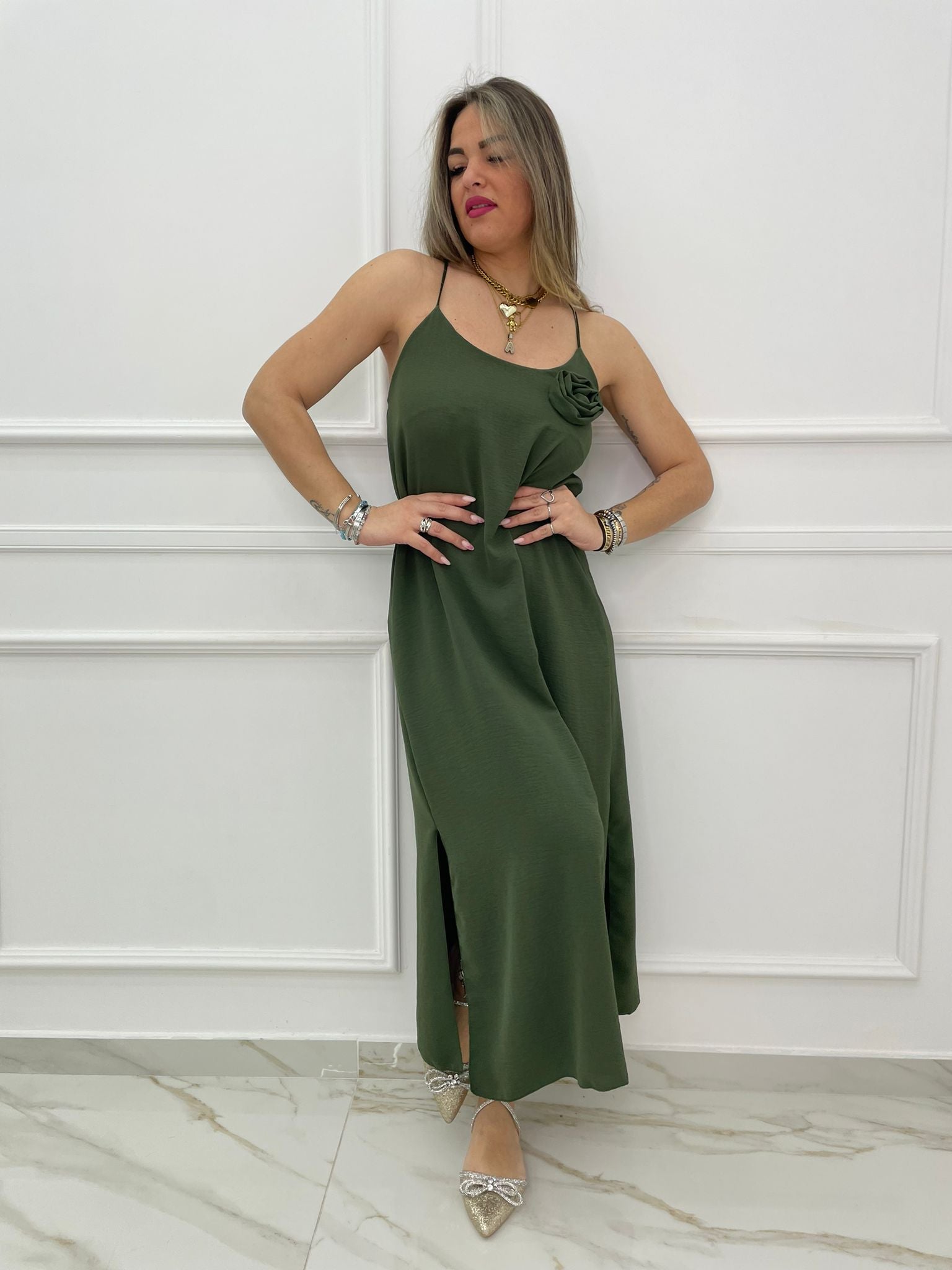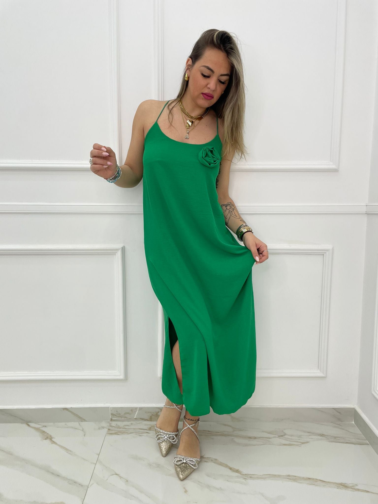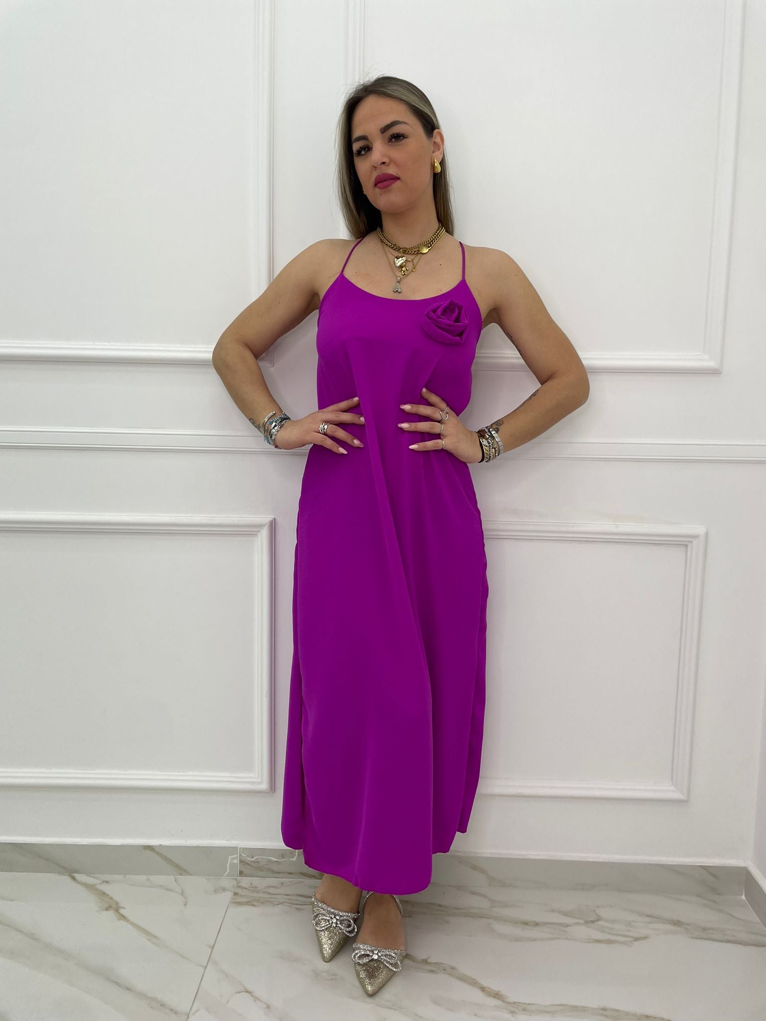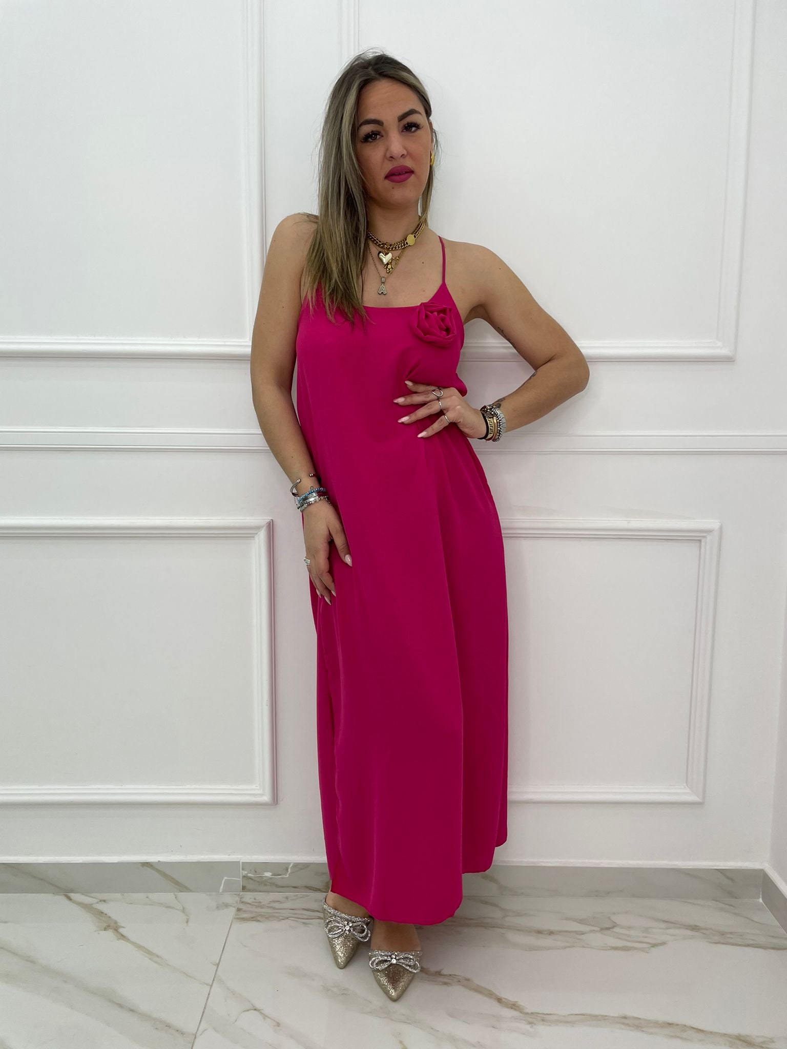 Vestito lungo tinta unita con rosa