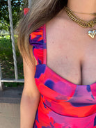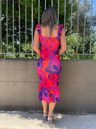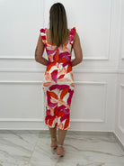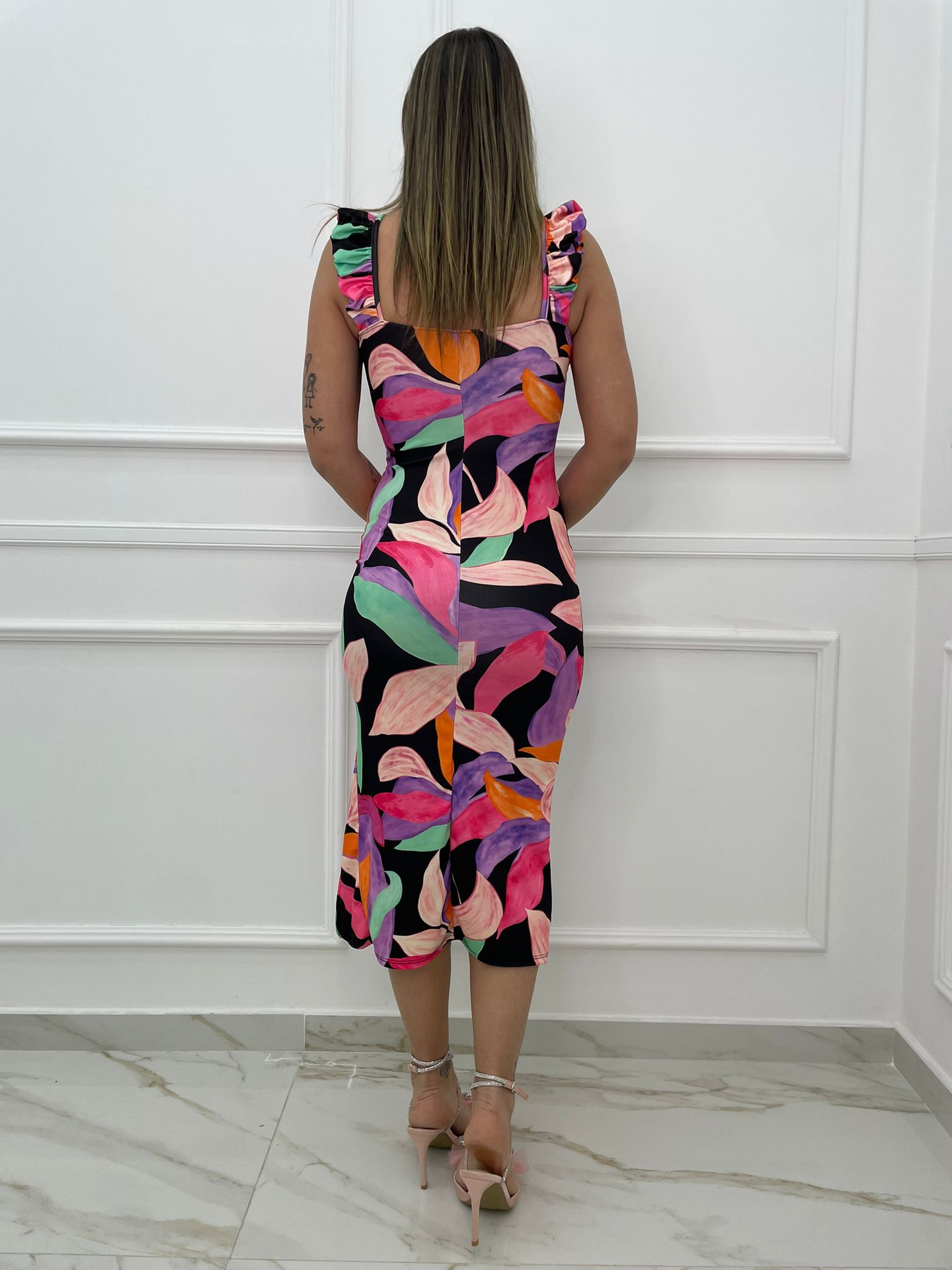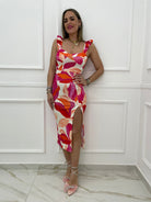 Vestito midi fantasia astratta con rouches alle maniche