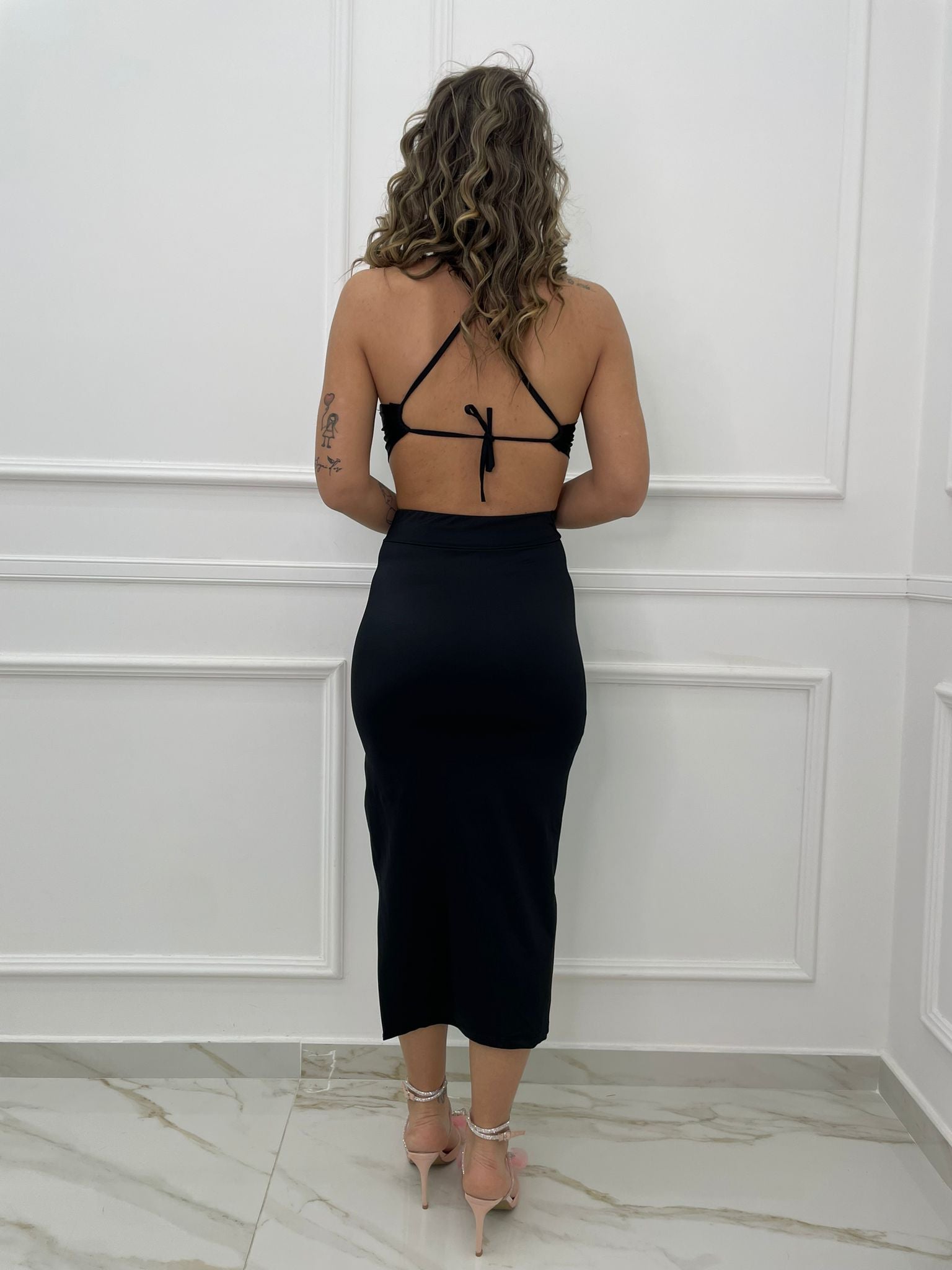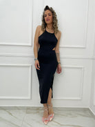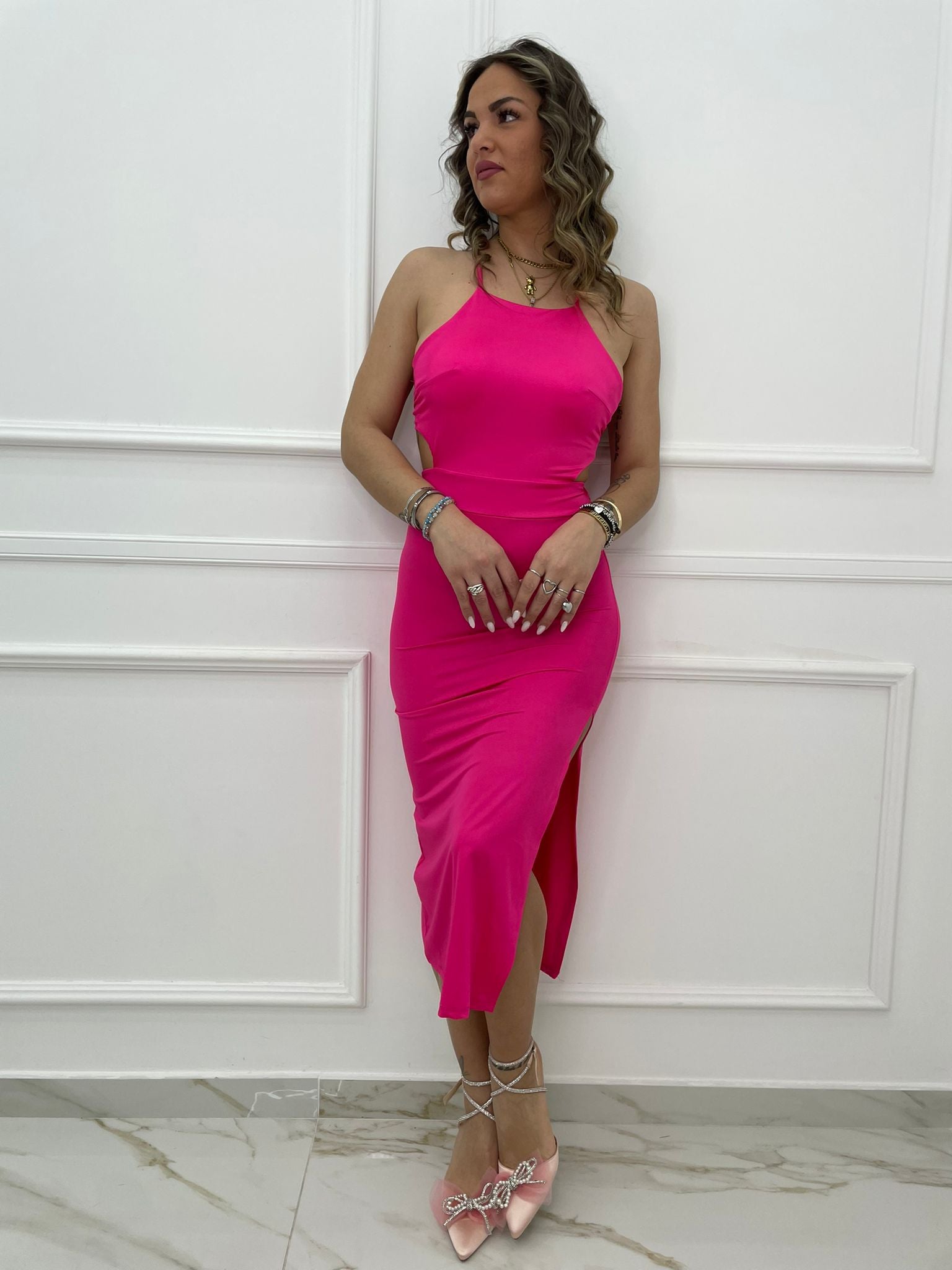 Vestito midi in simil raso con incrocio dietro