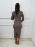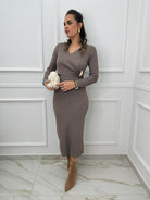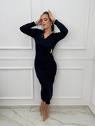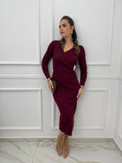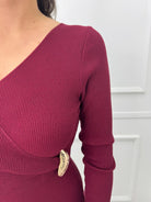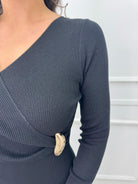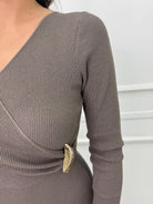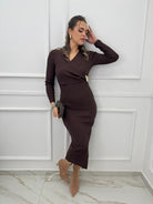 Vestito midi laminato con scollo incrocio e applicazione oro