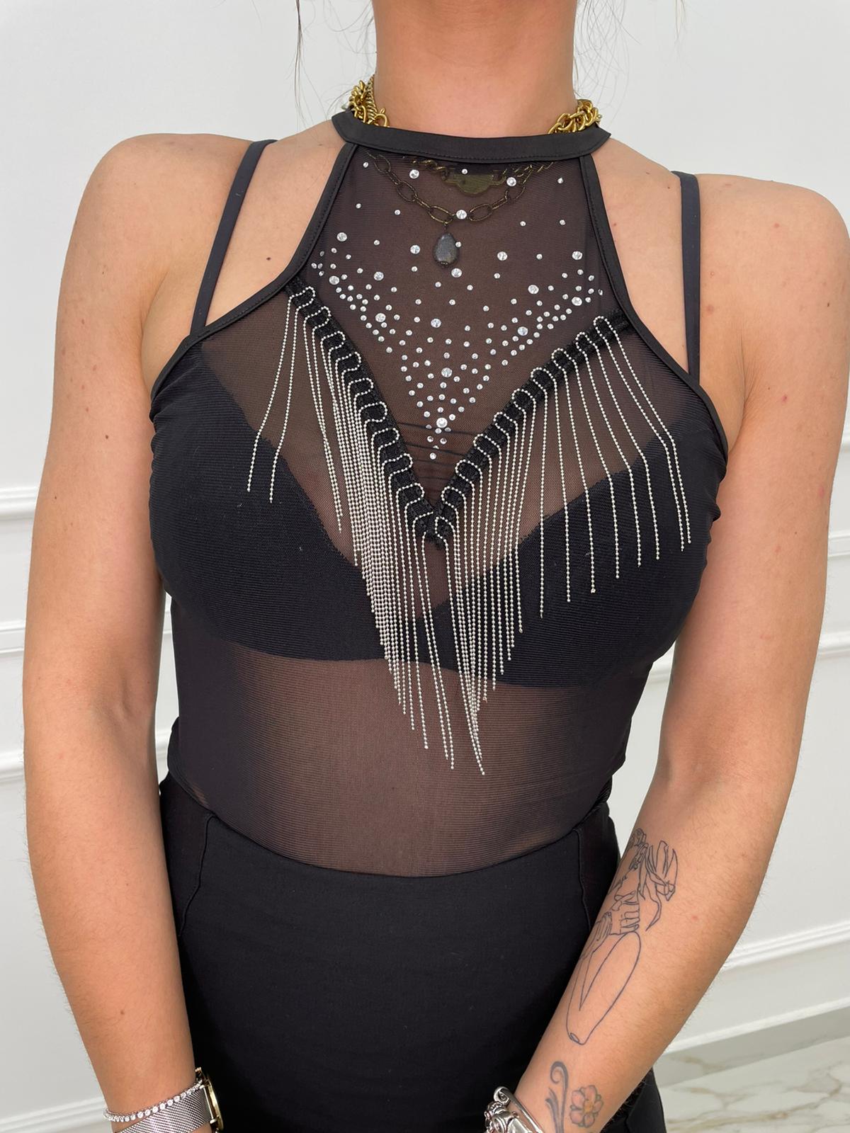 Body con aperture laterali e frange swarovski
