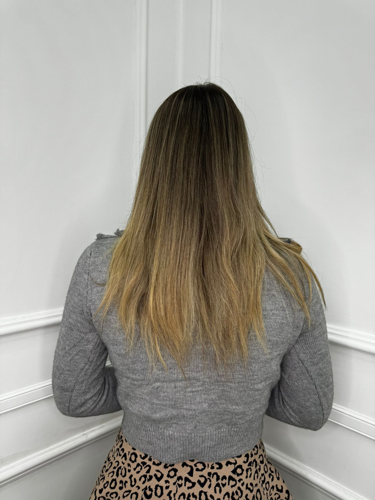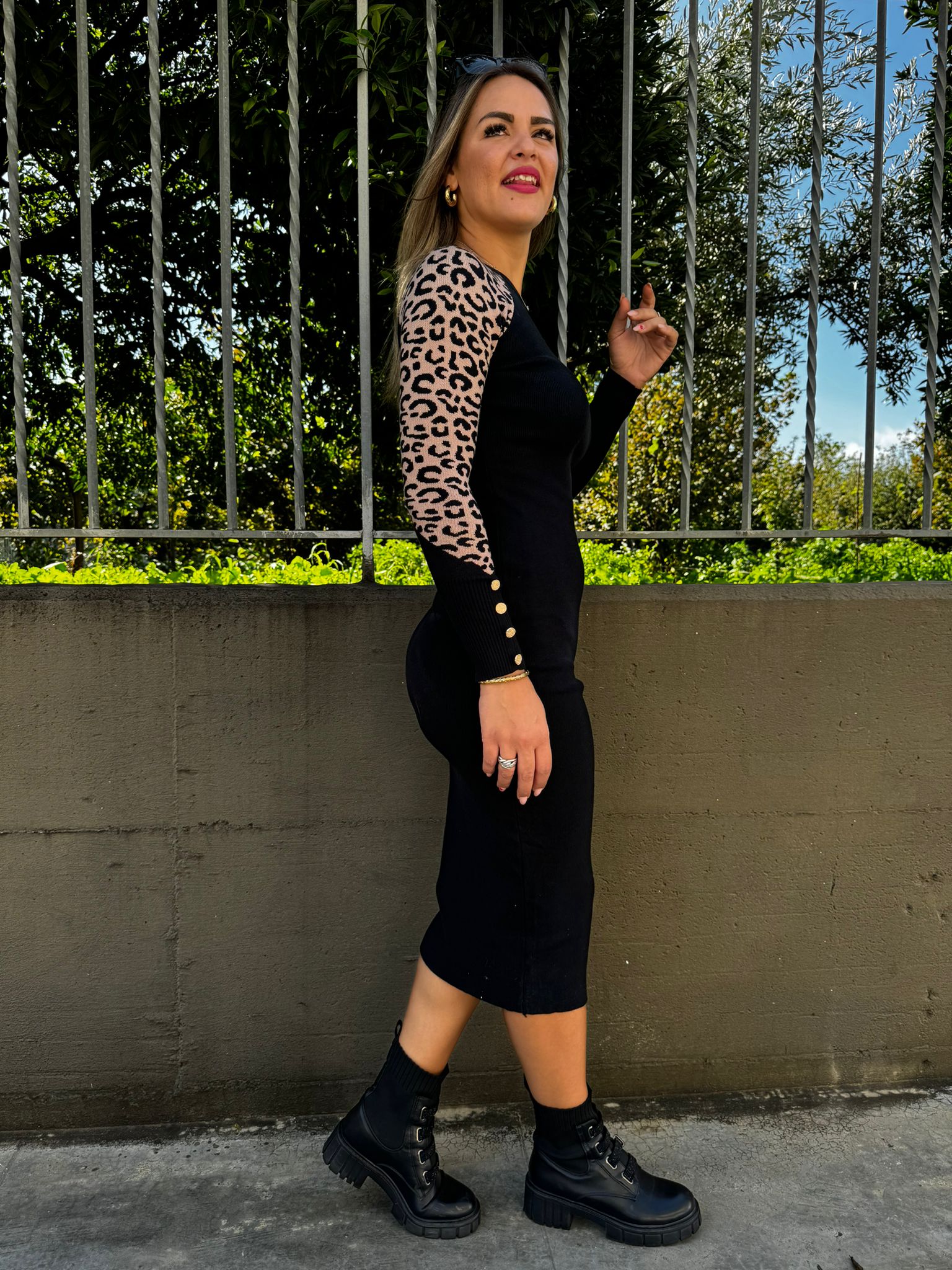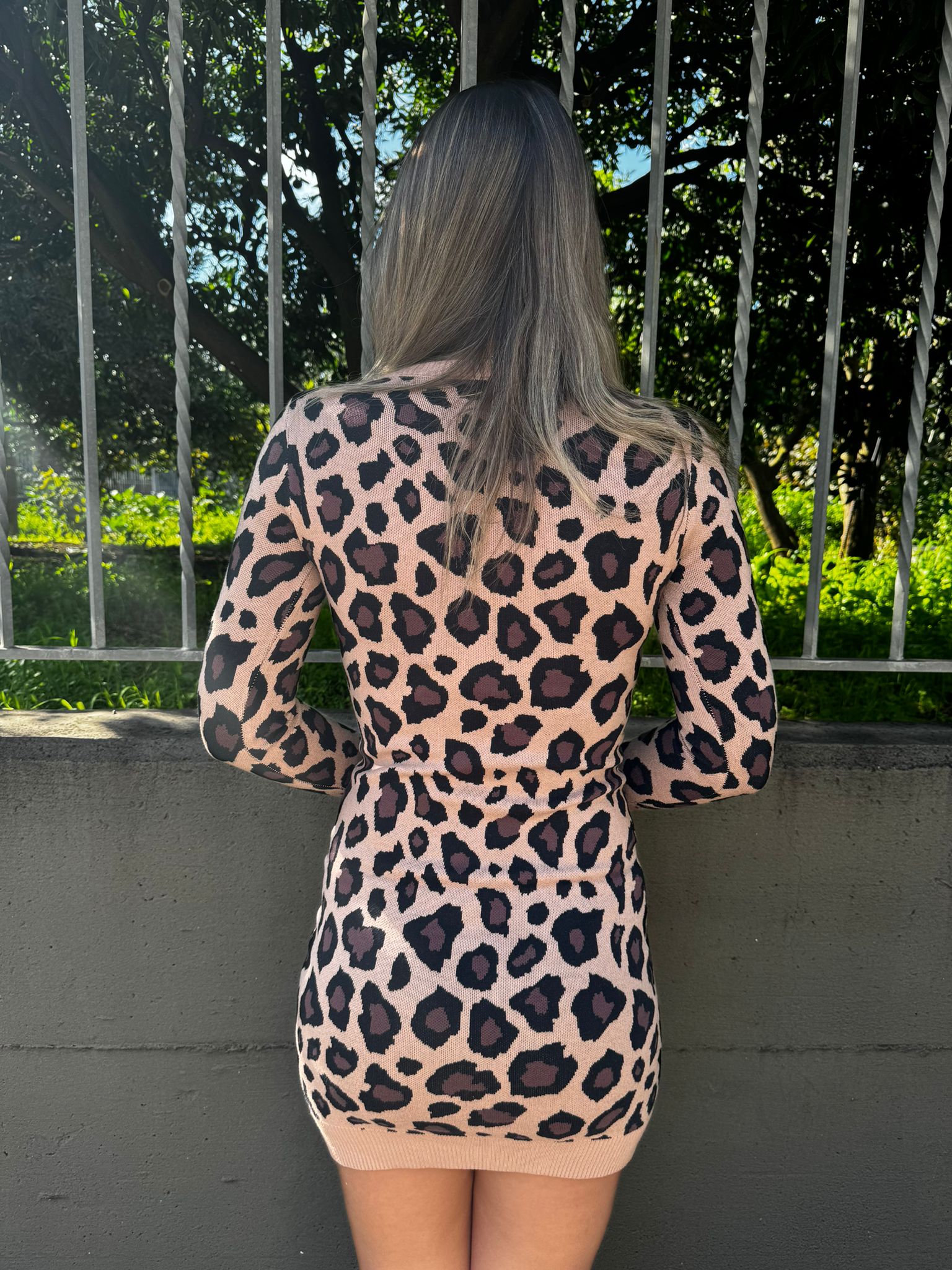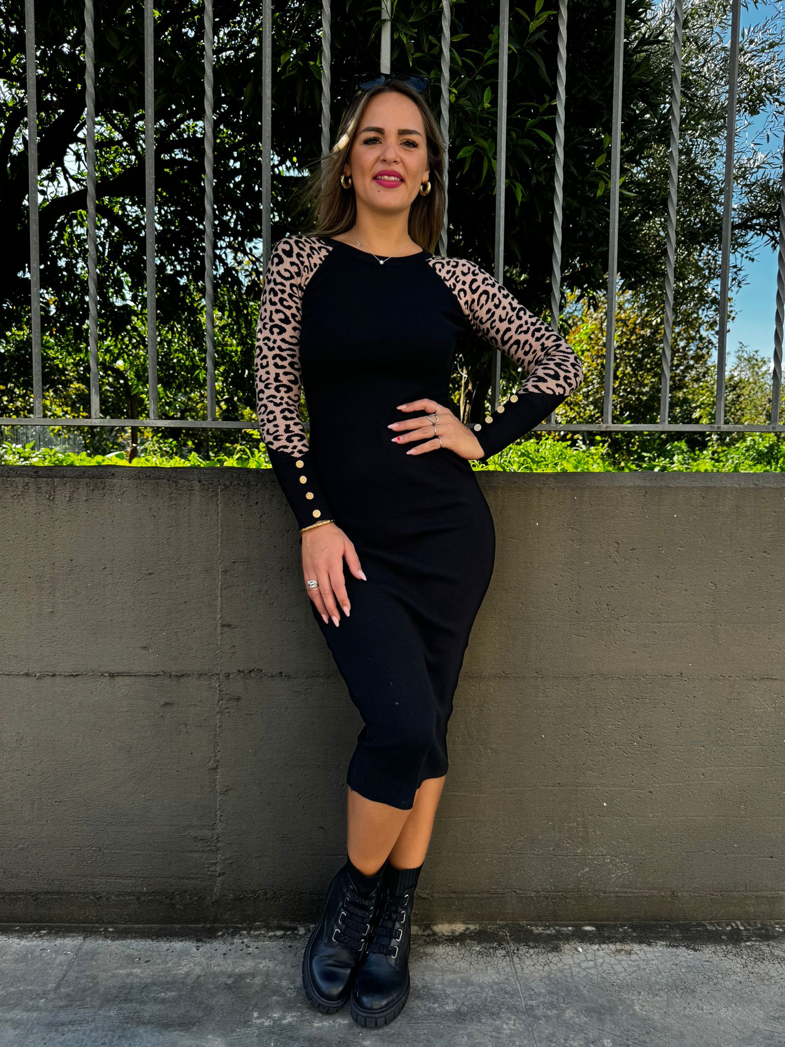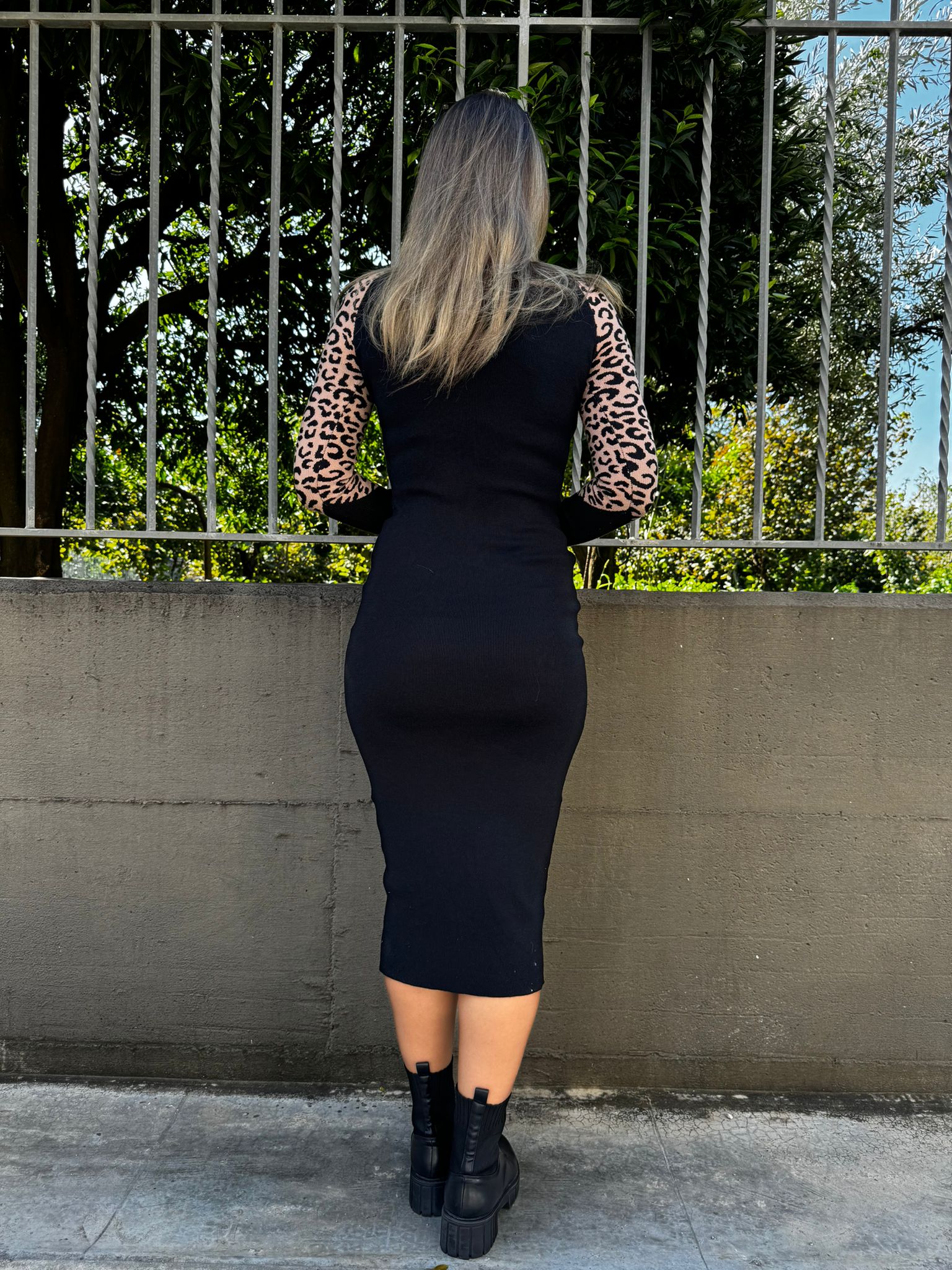 Vestito midi in simil lana con maniche animalier