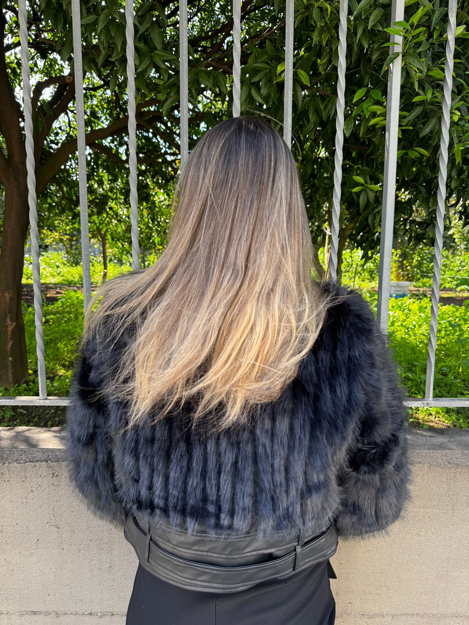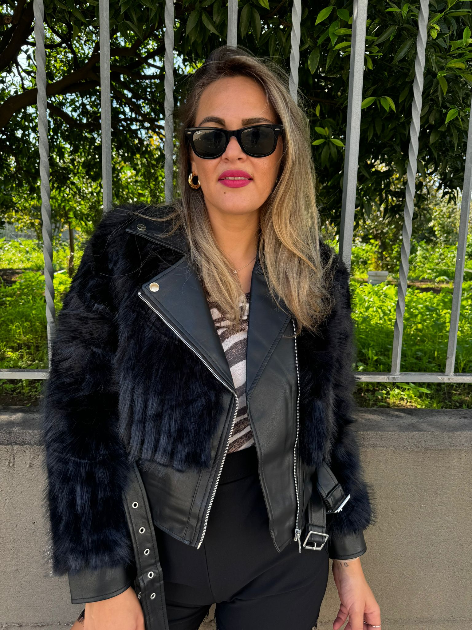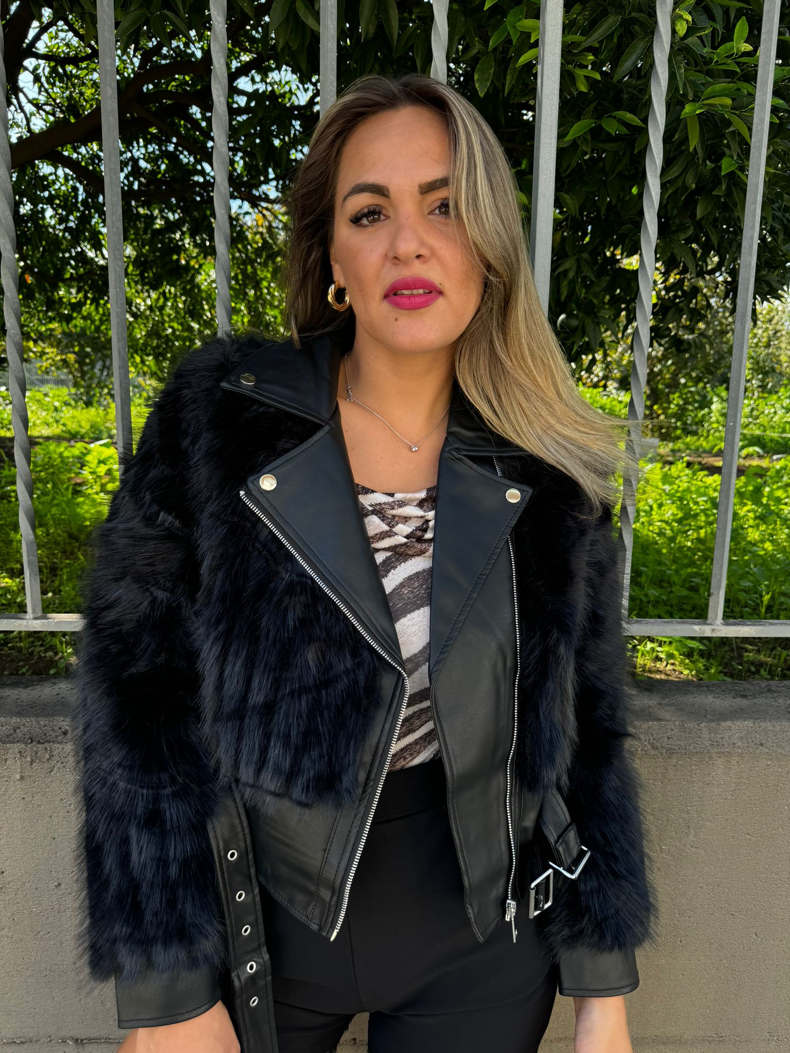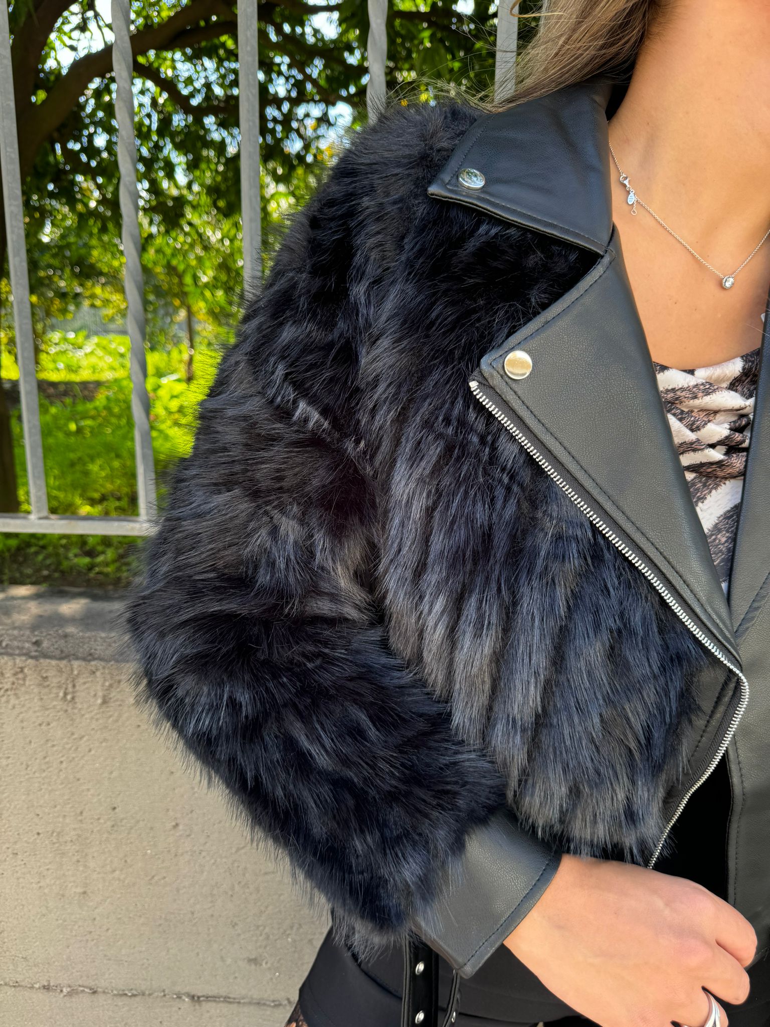 Pelliccia eco con inserti in pelle e doppia fibbia