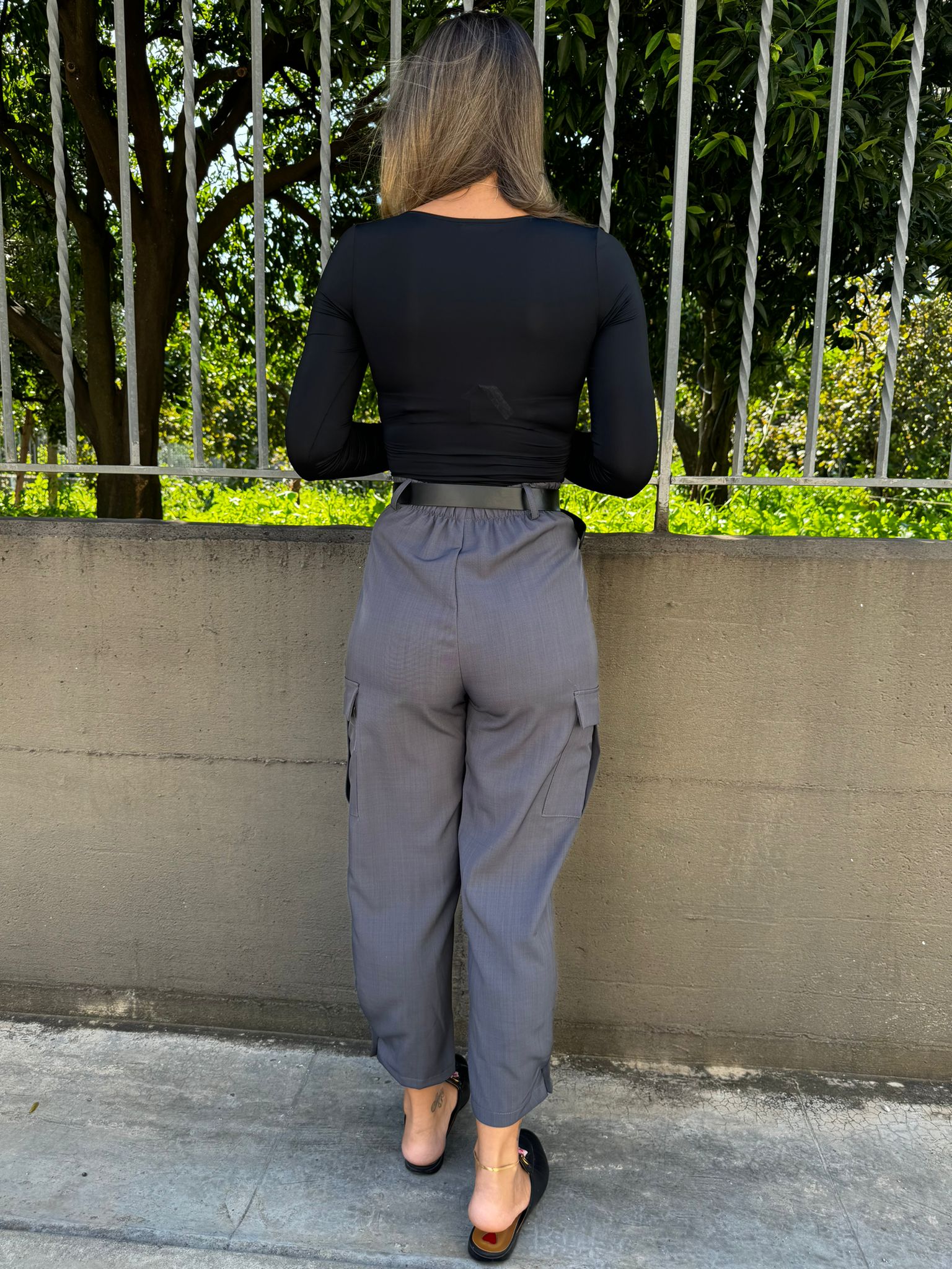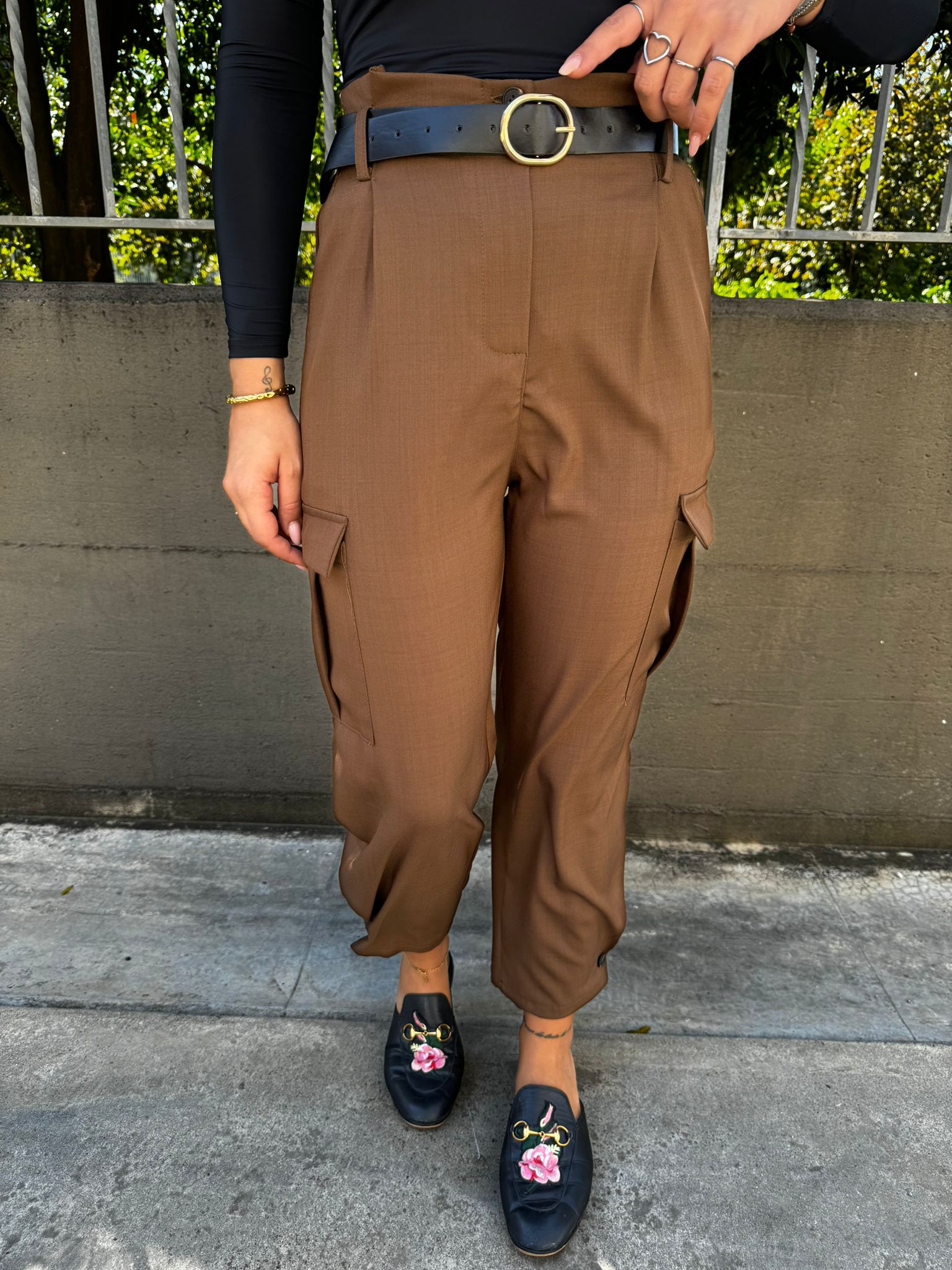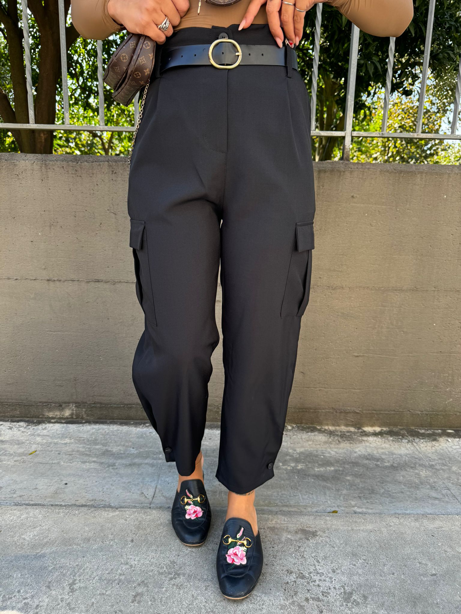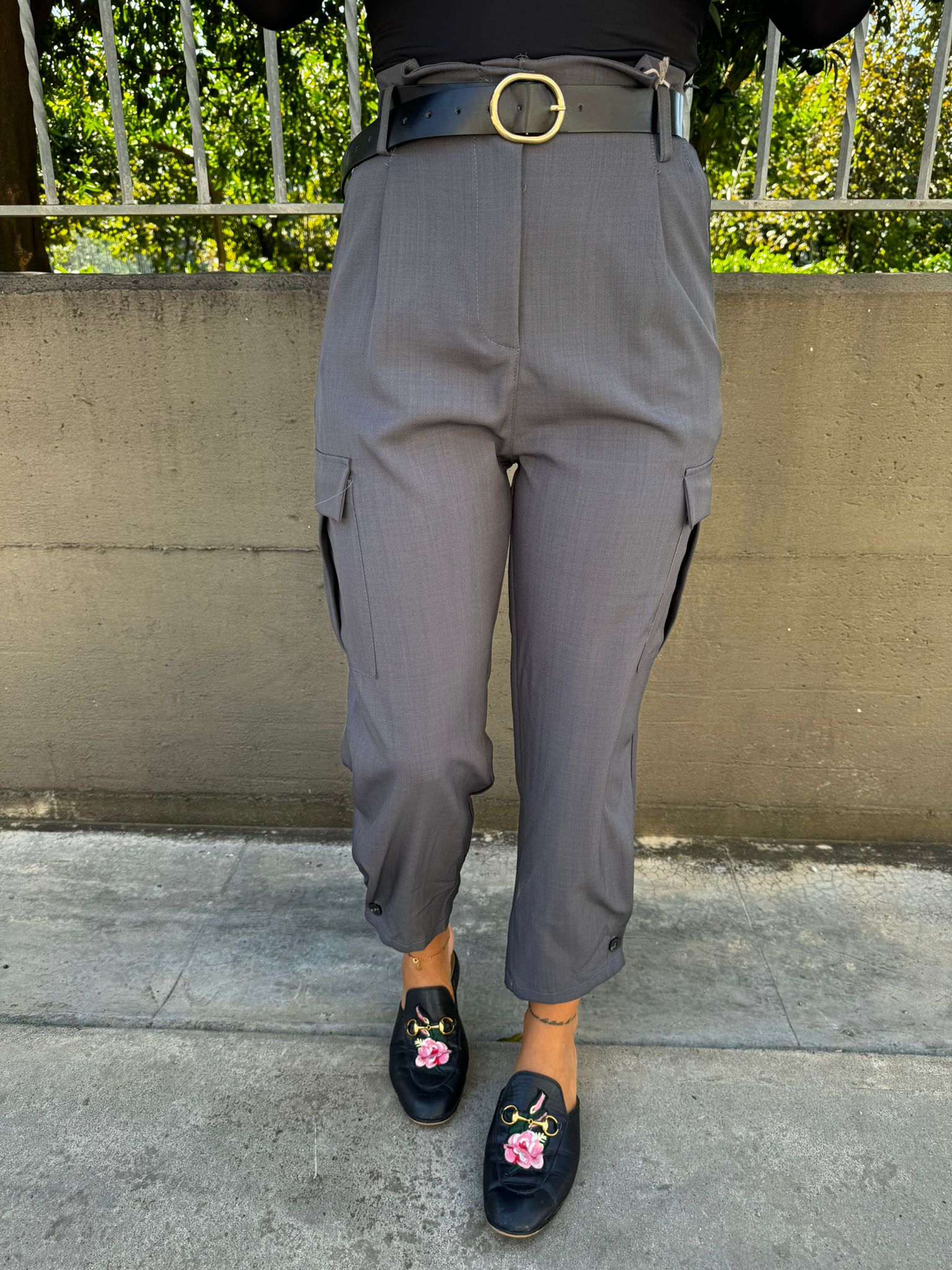 Pantalone tinta unita vita alta con tasconi
