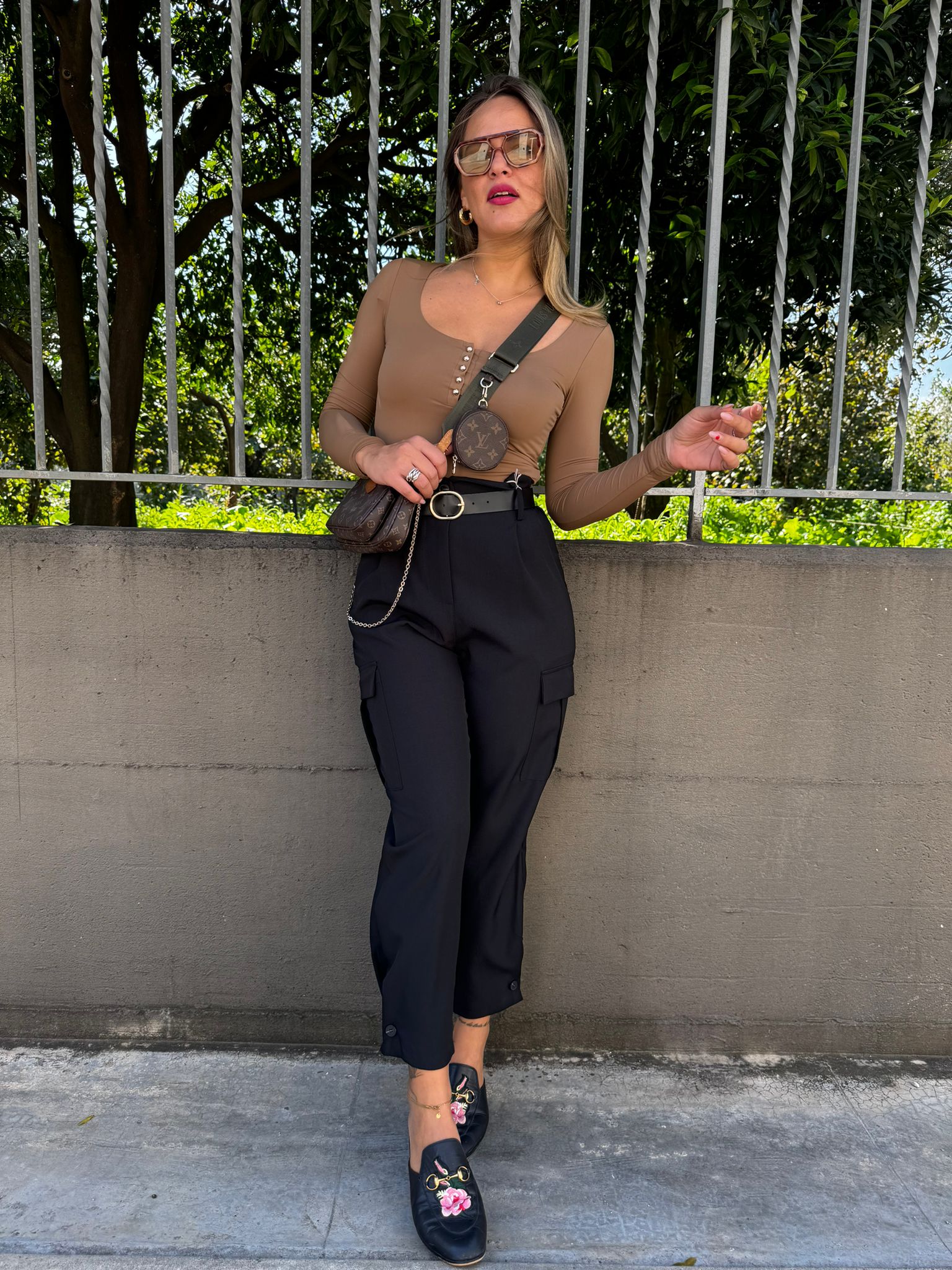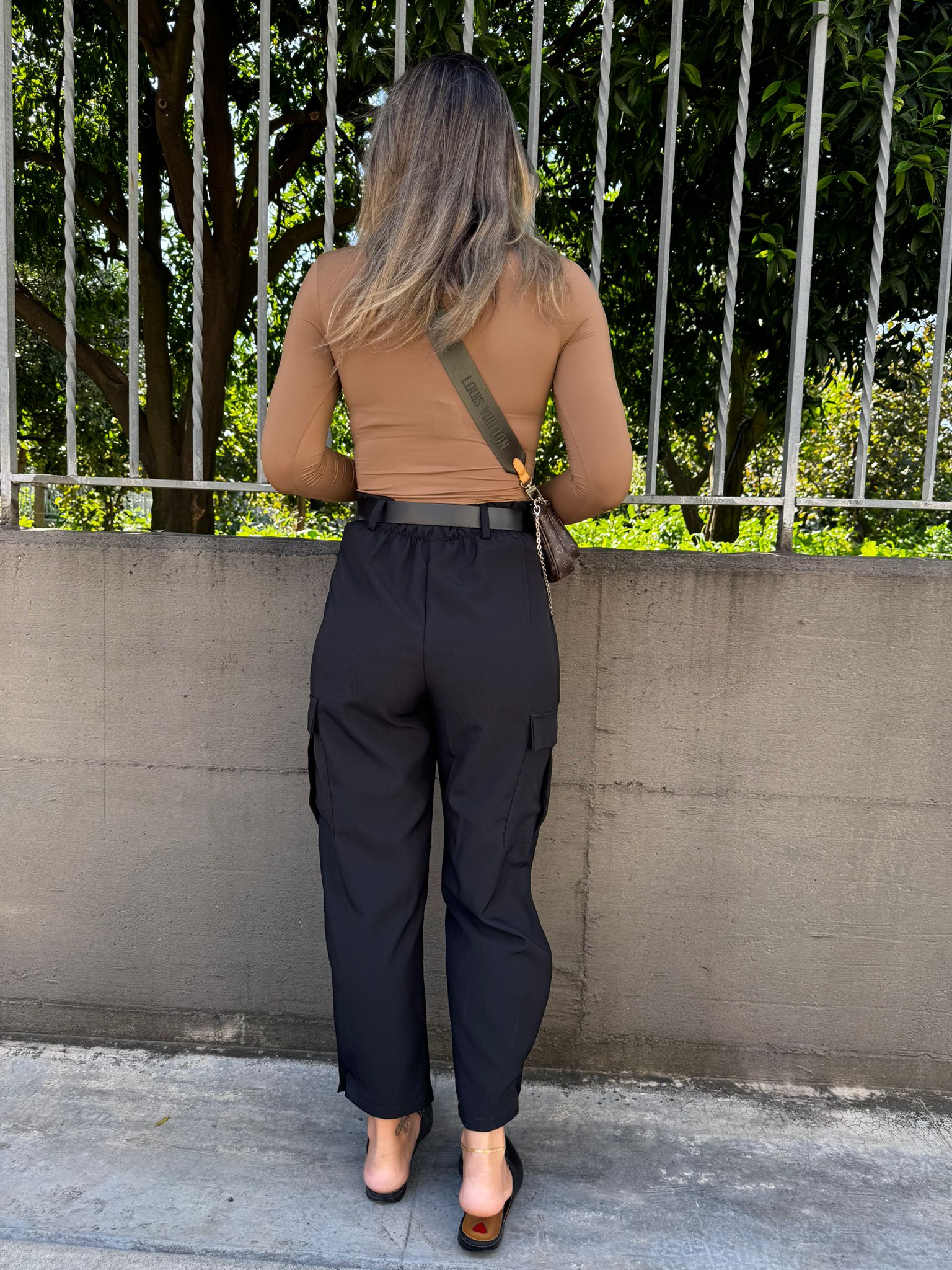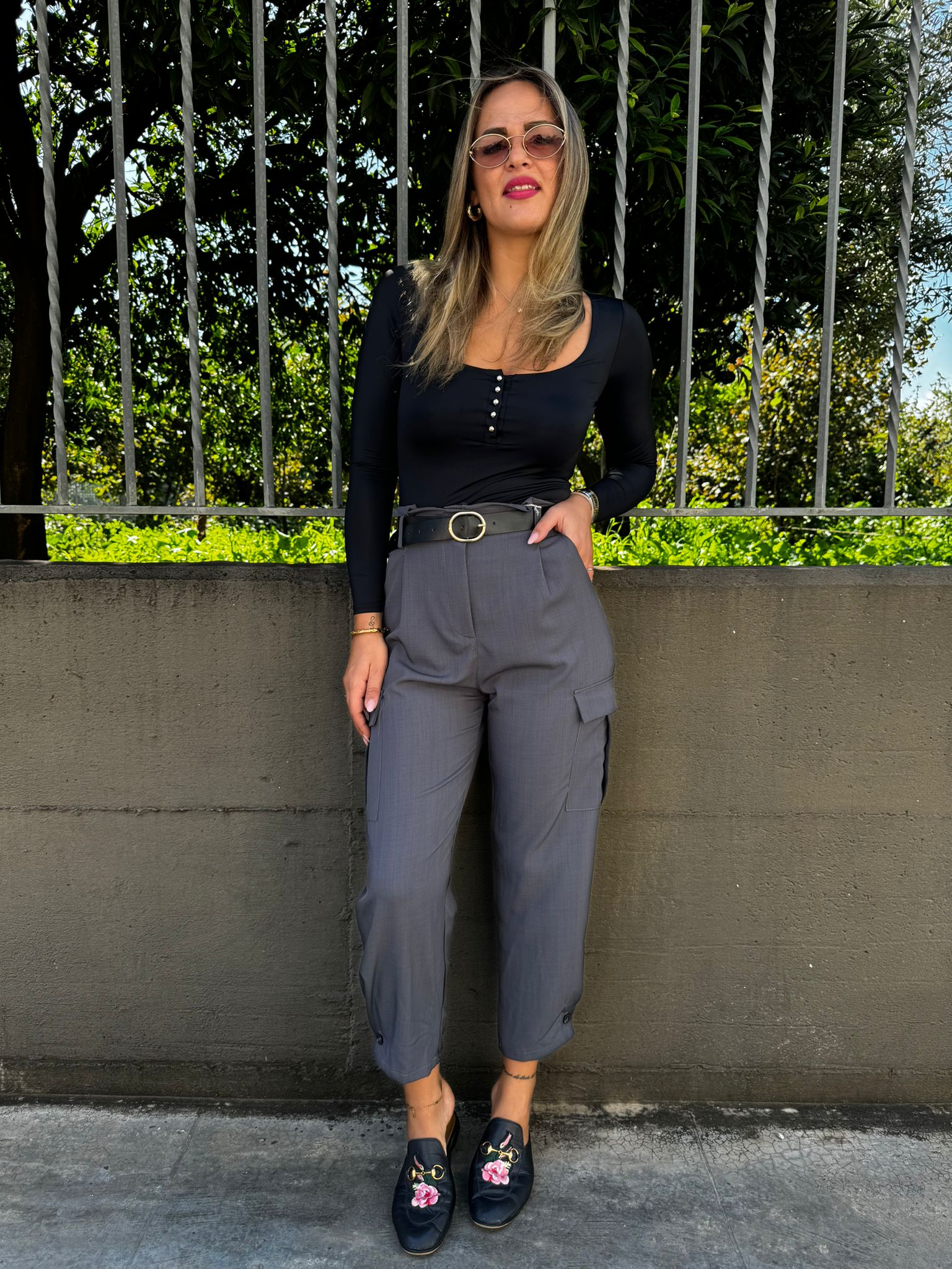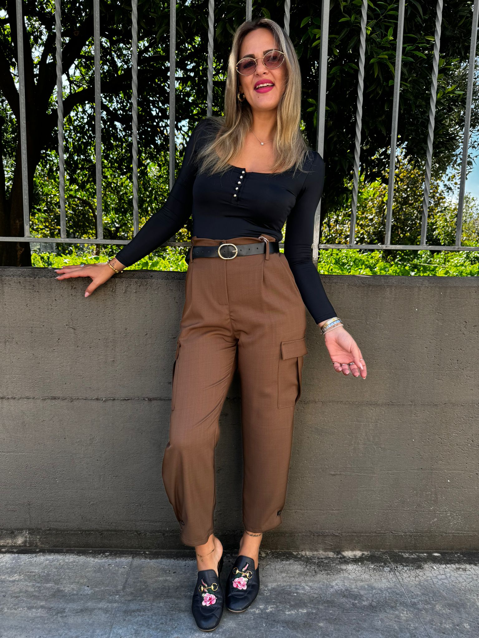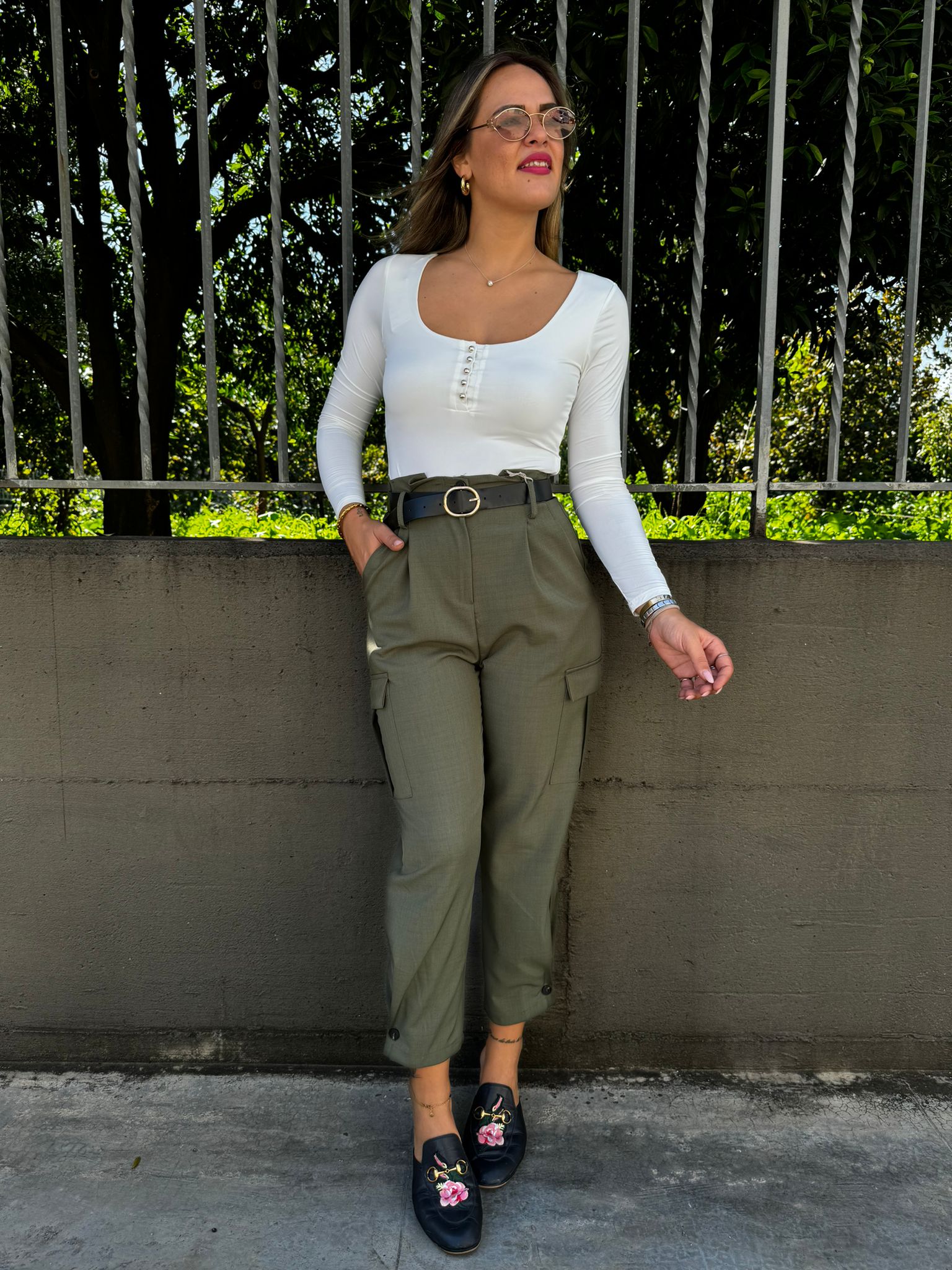 Pantalone tinta unita vita alta con tasconi
