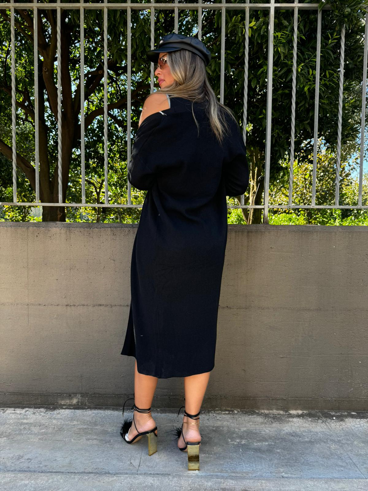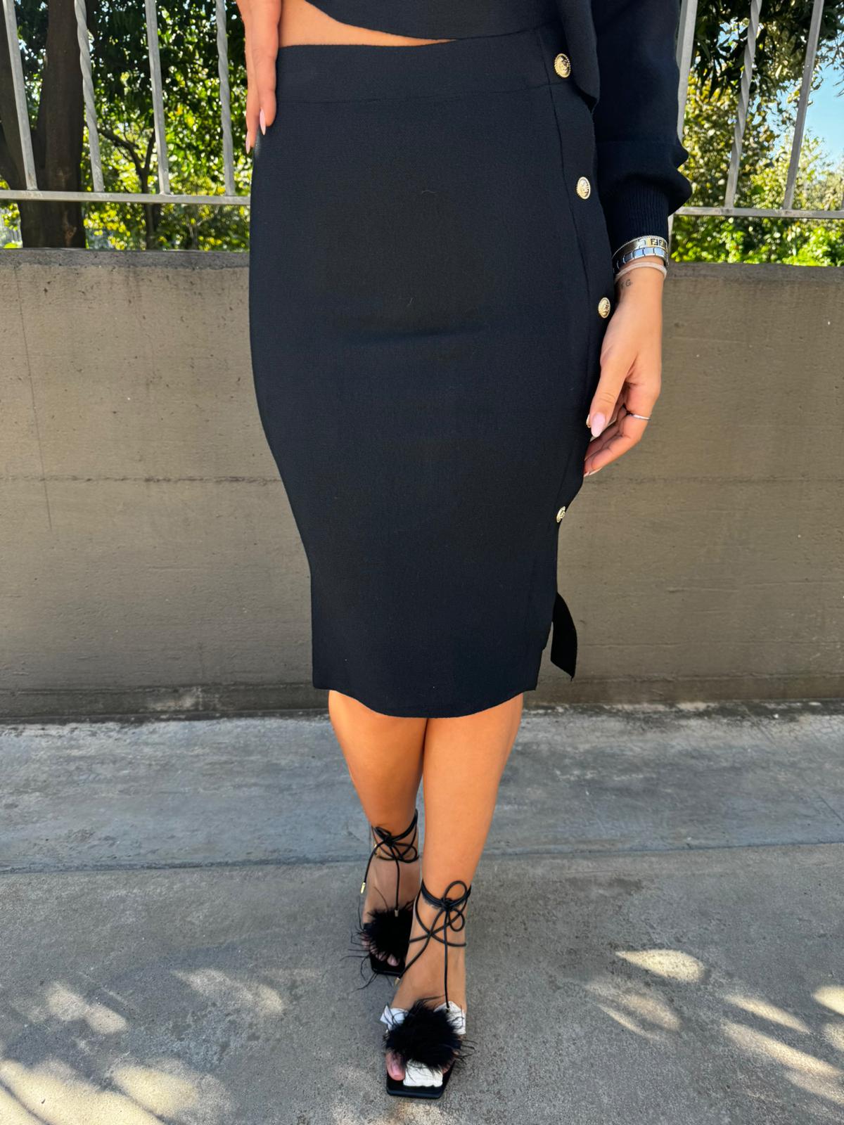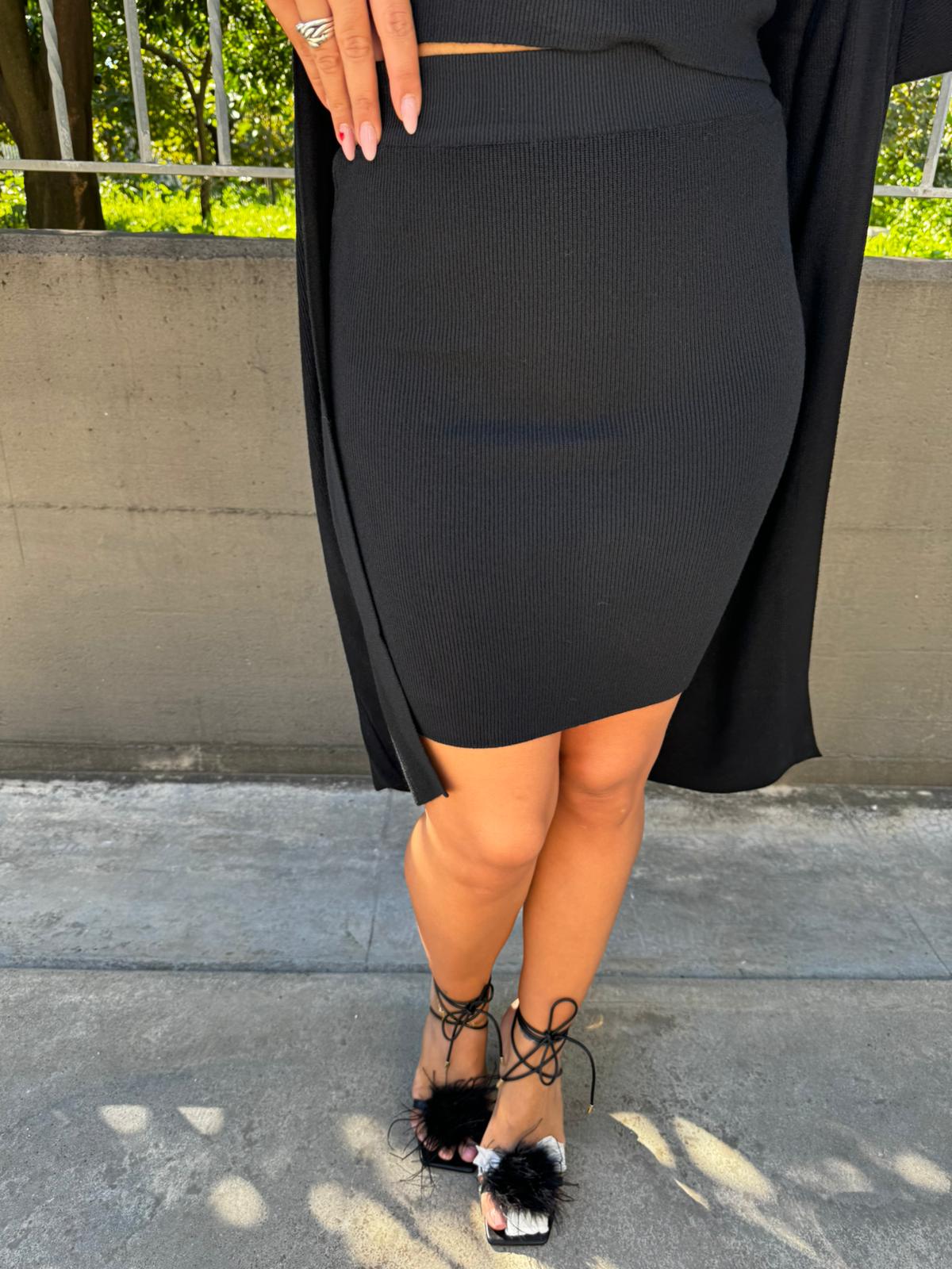 Coordinato 3 pezzi con mini gonna e cardigan lungo