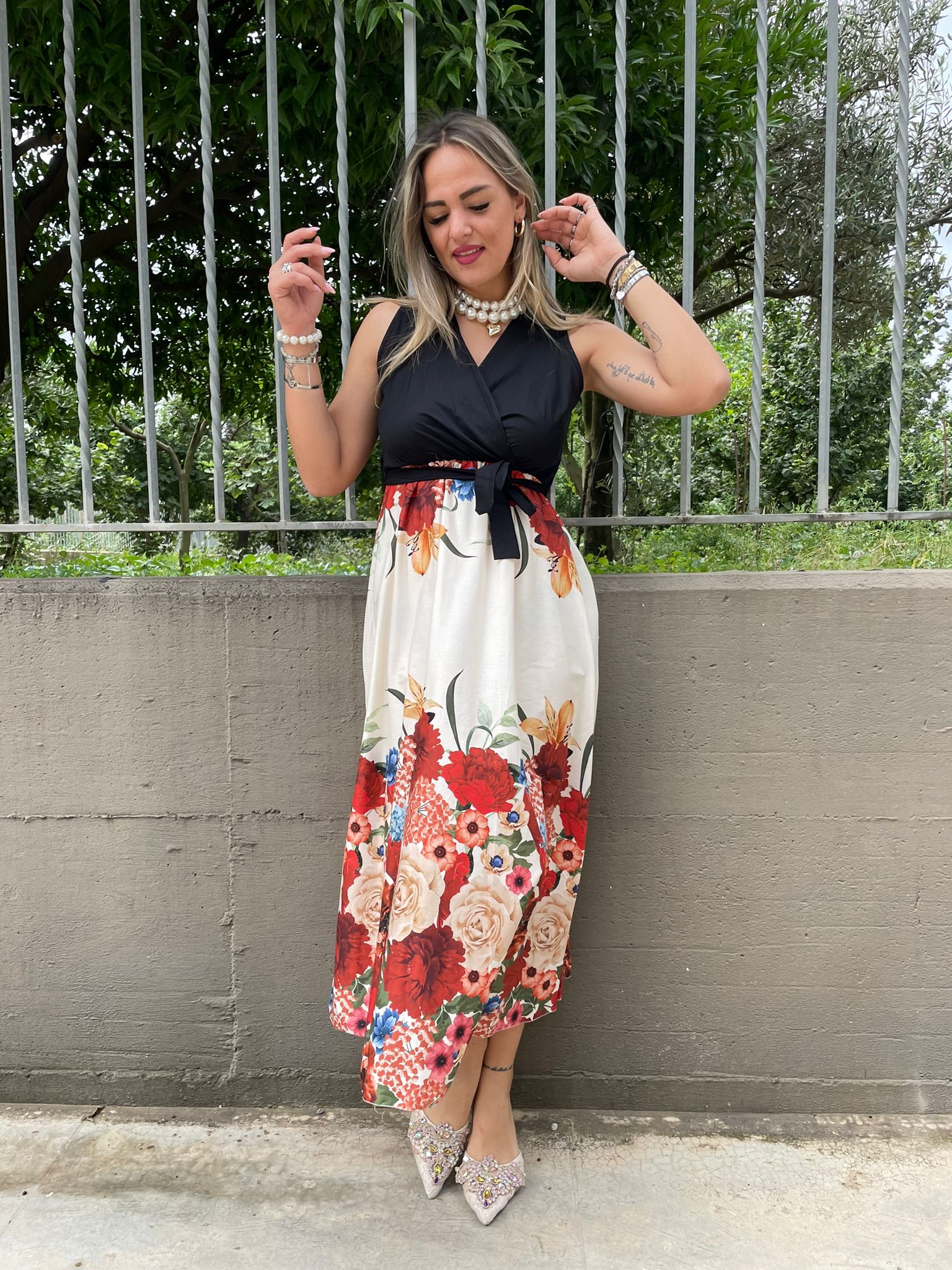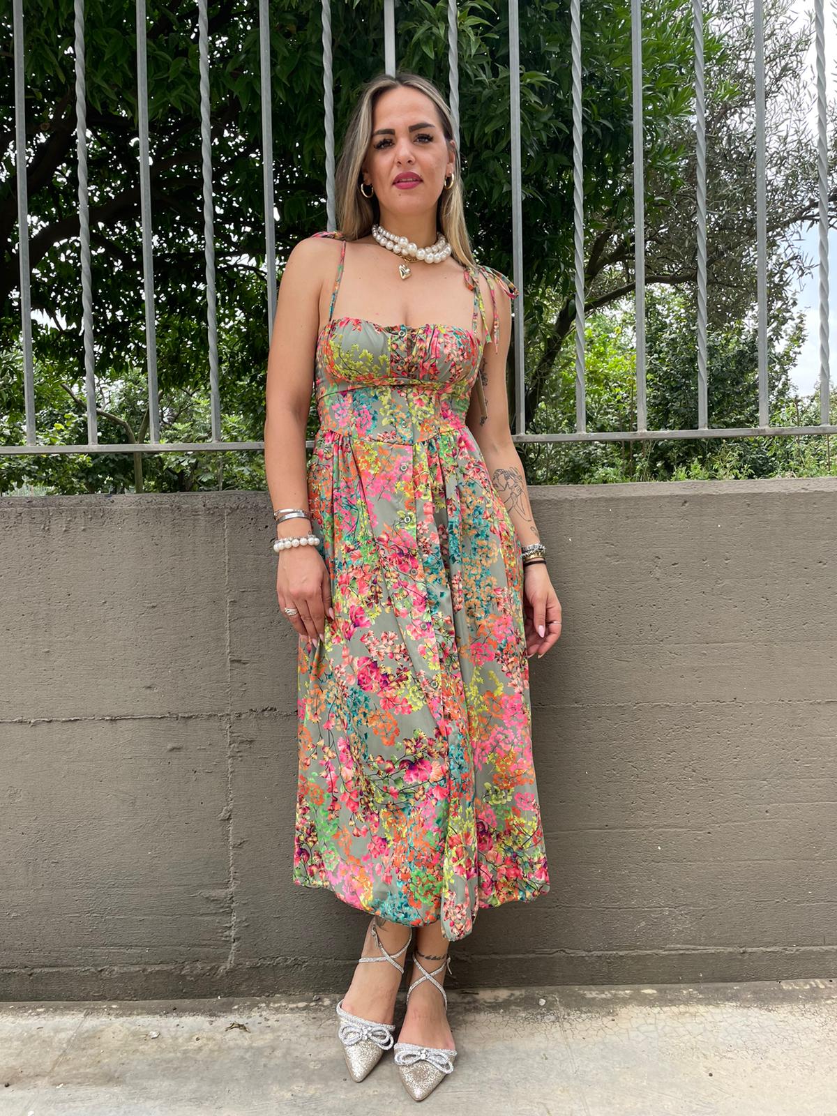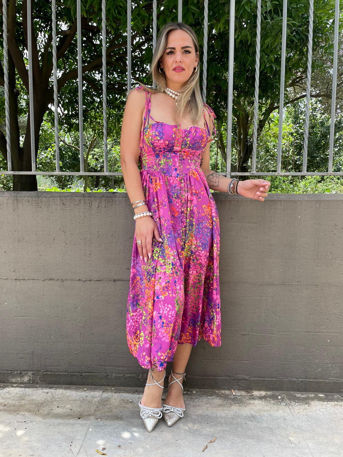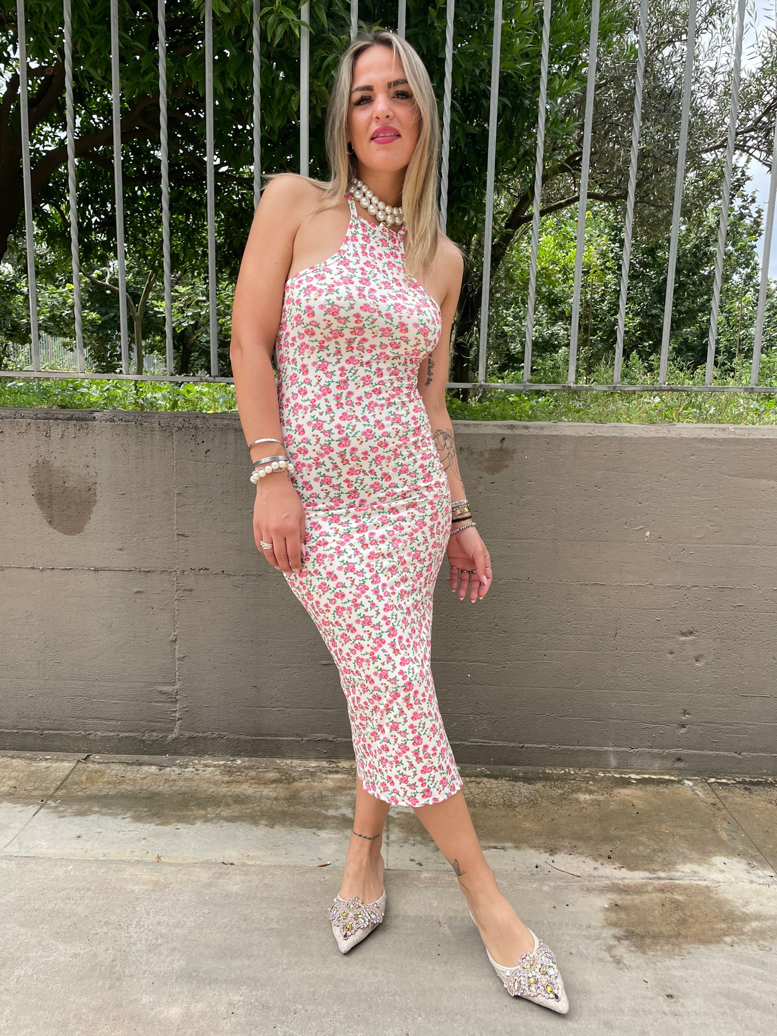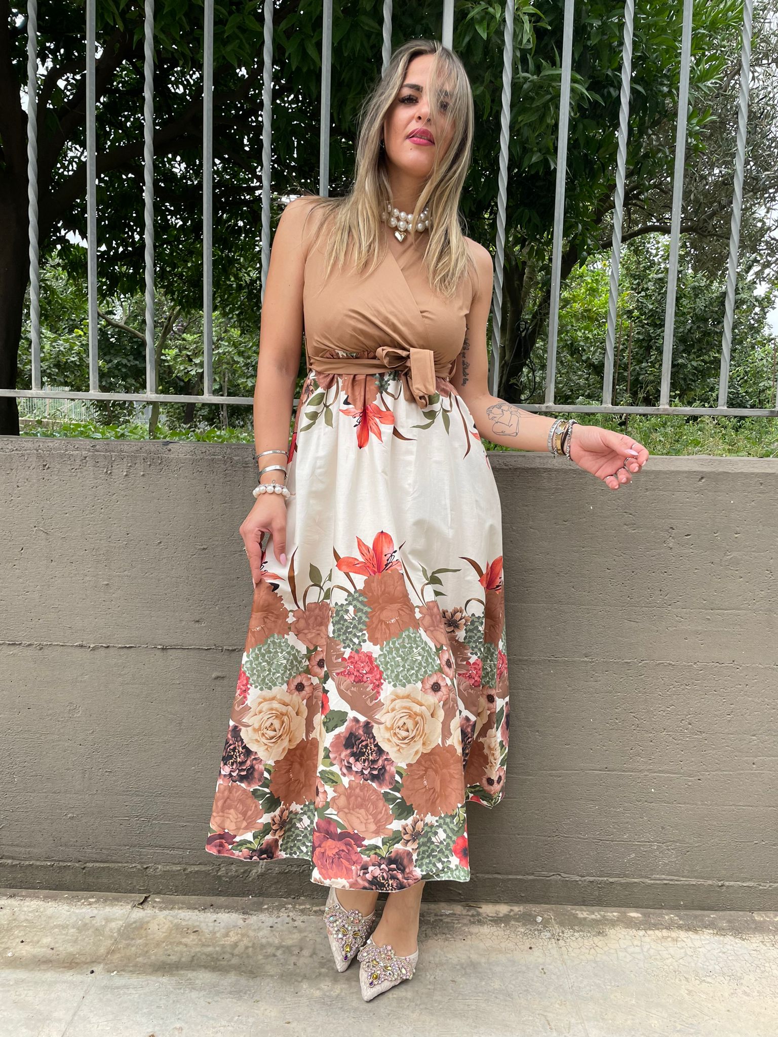 Vestito midi fantasia fiori scampanato con laccetti alle spalle