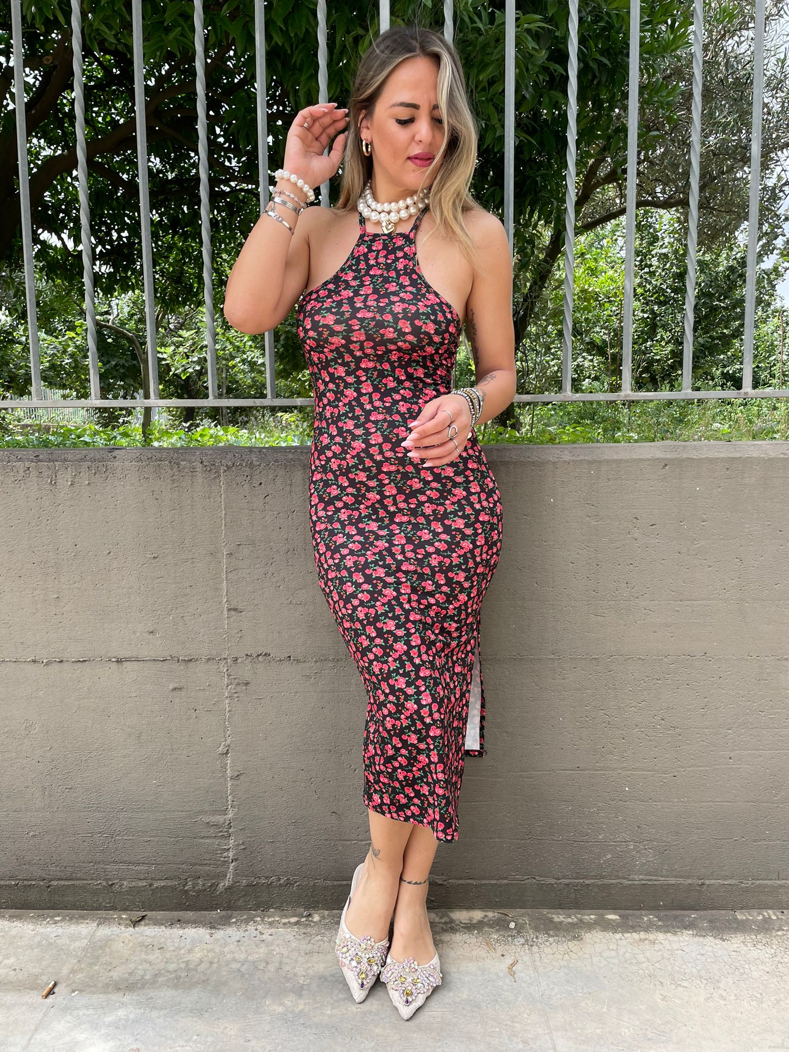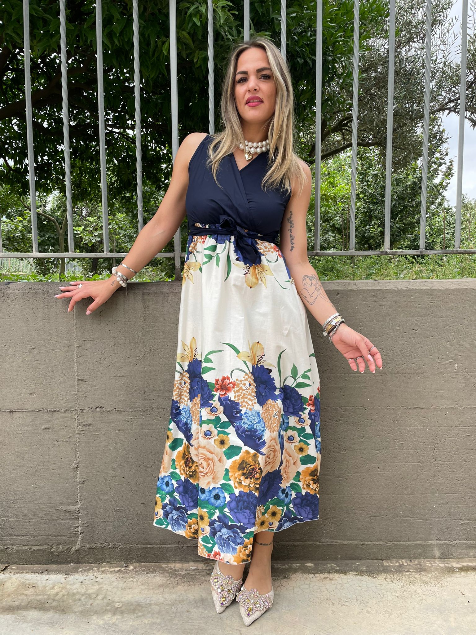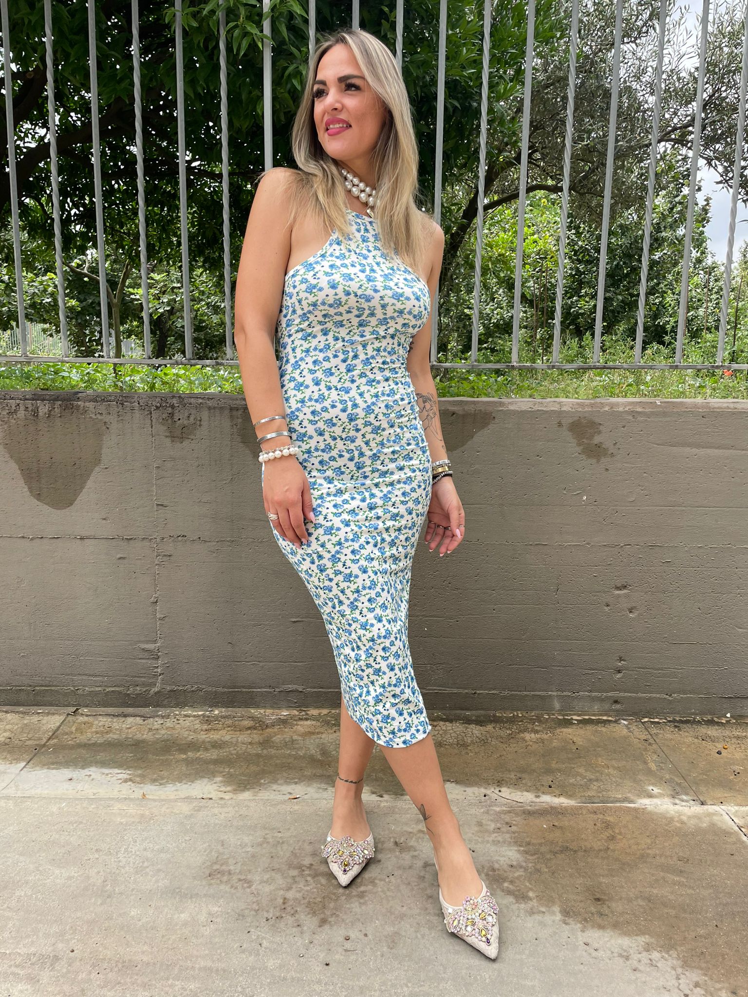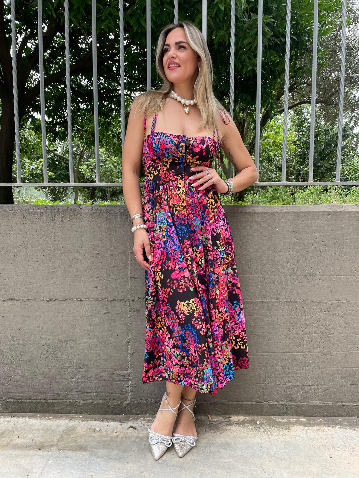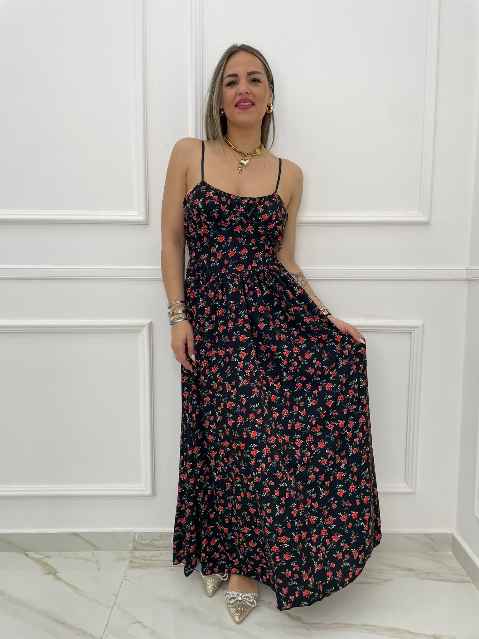 Vestito midi fantasia fiori scampanato con laccetti alle spalle