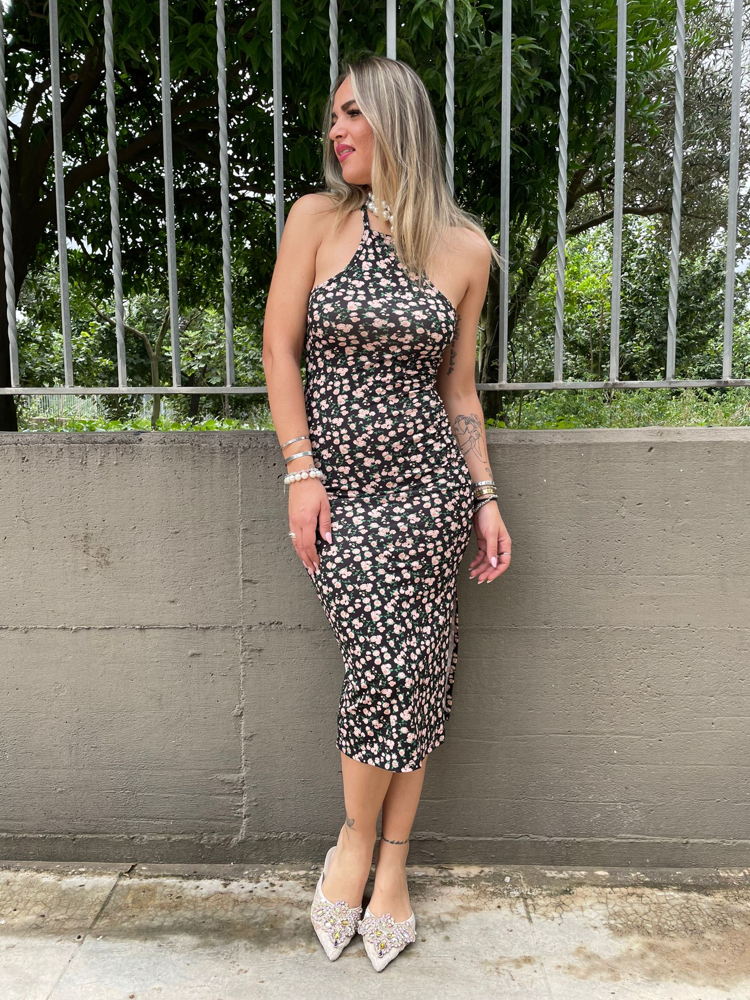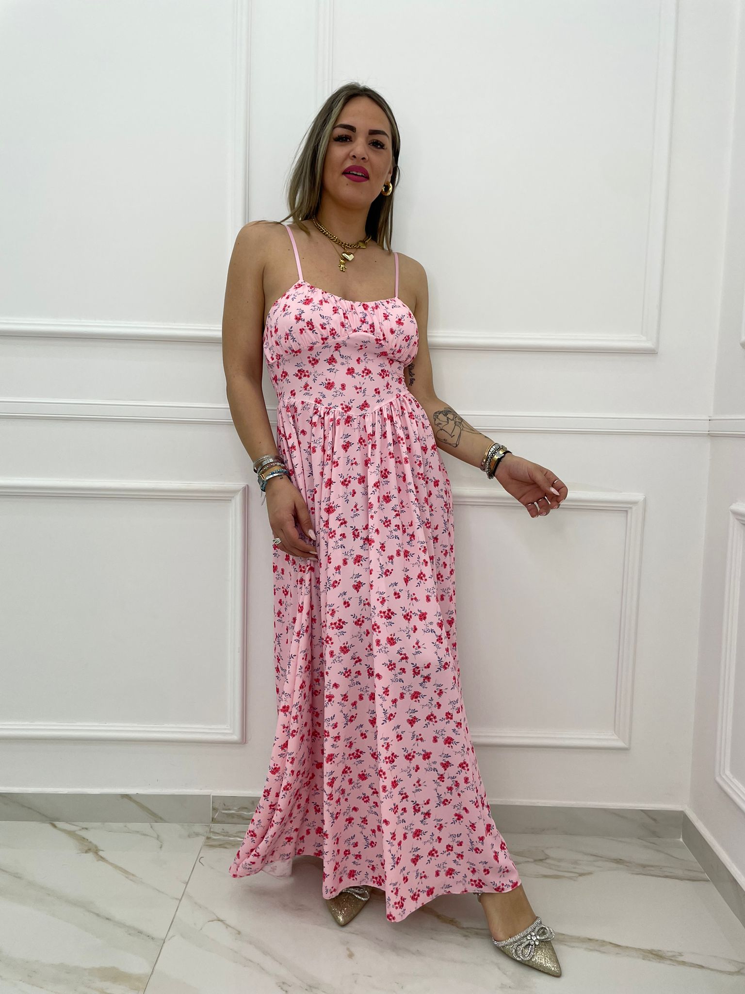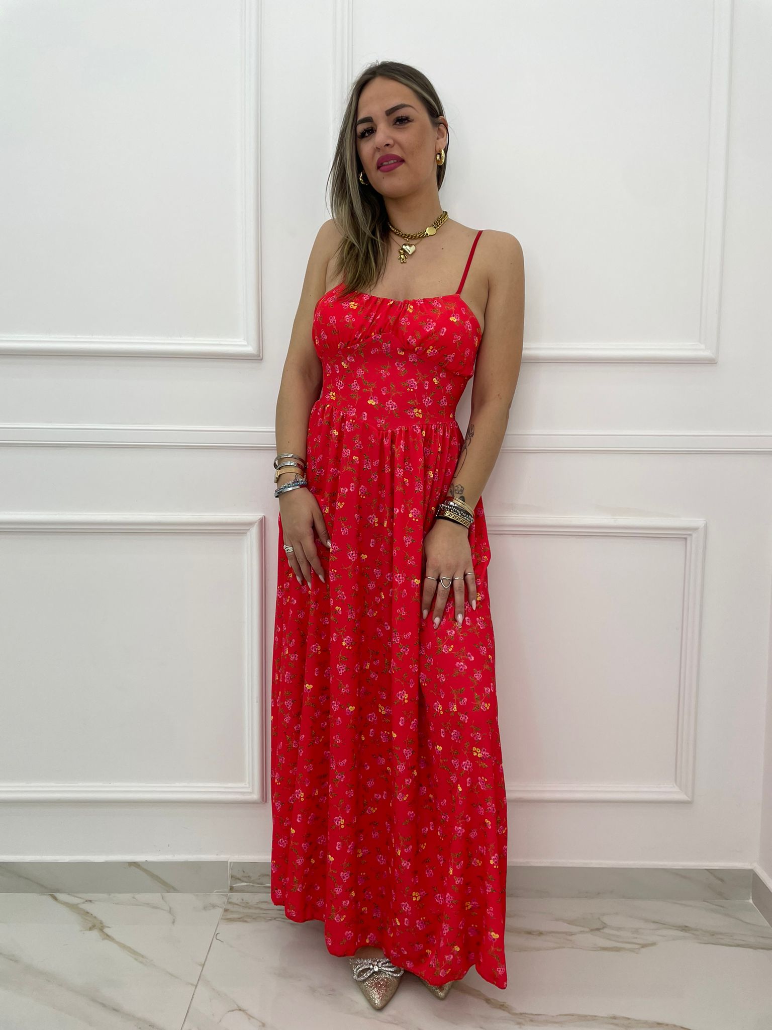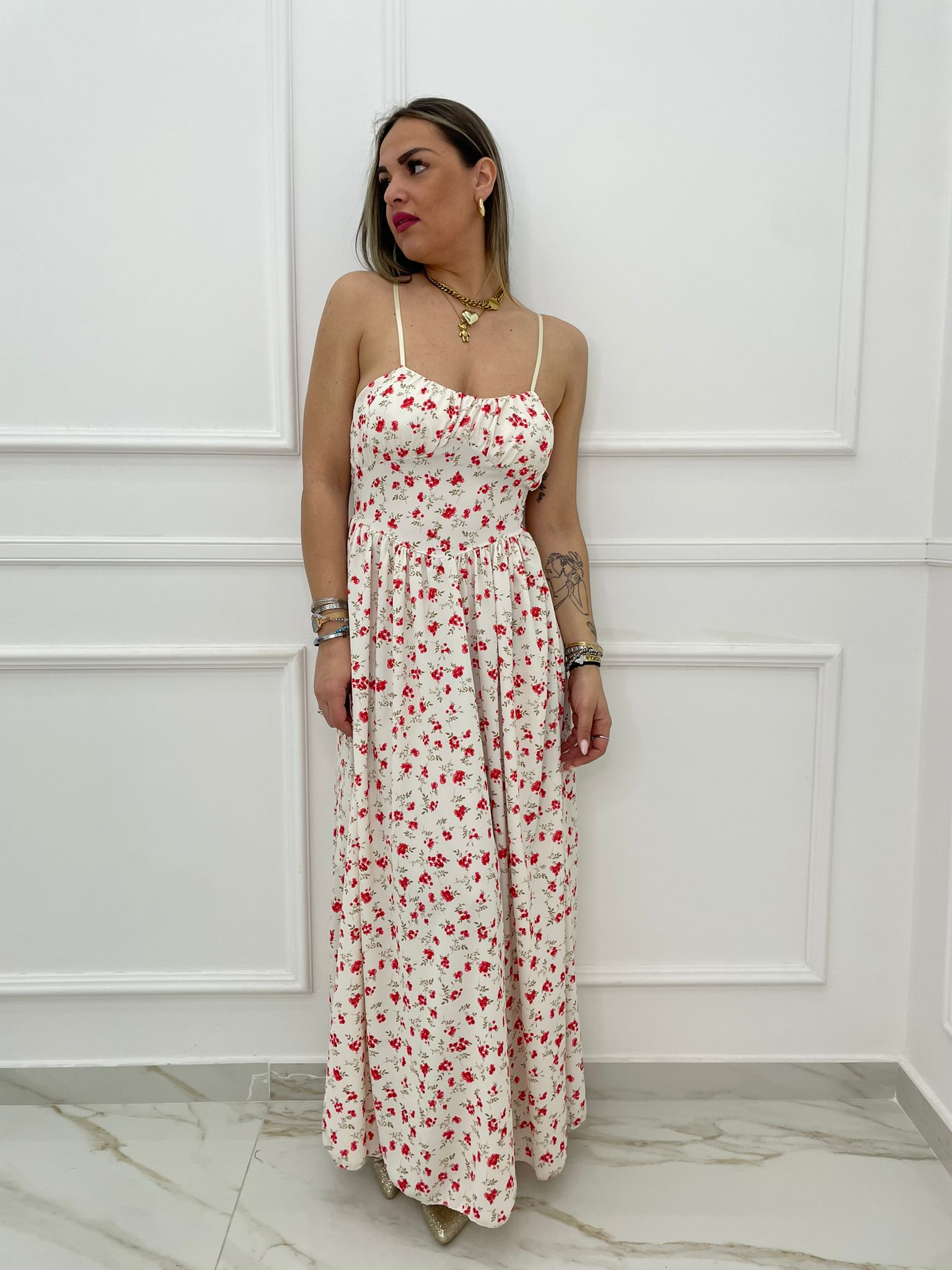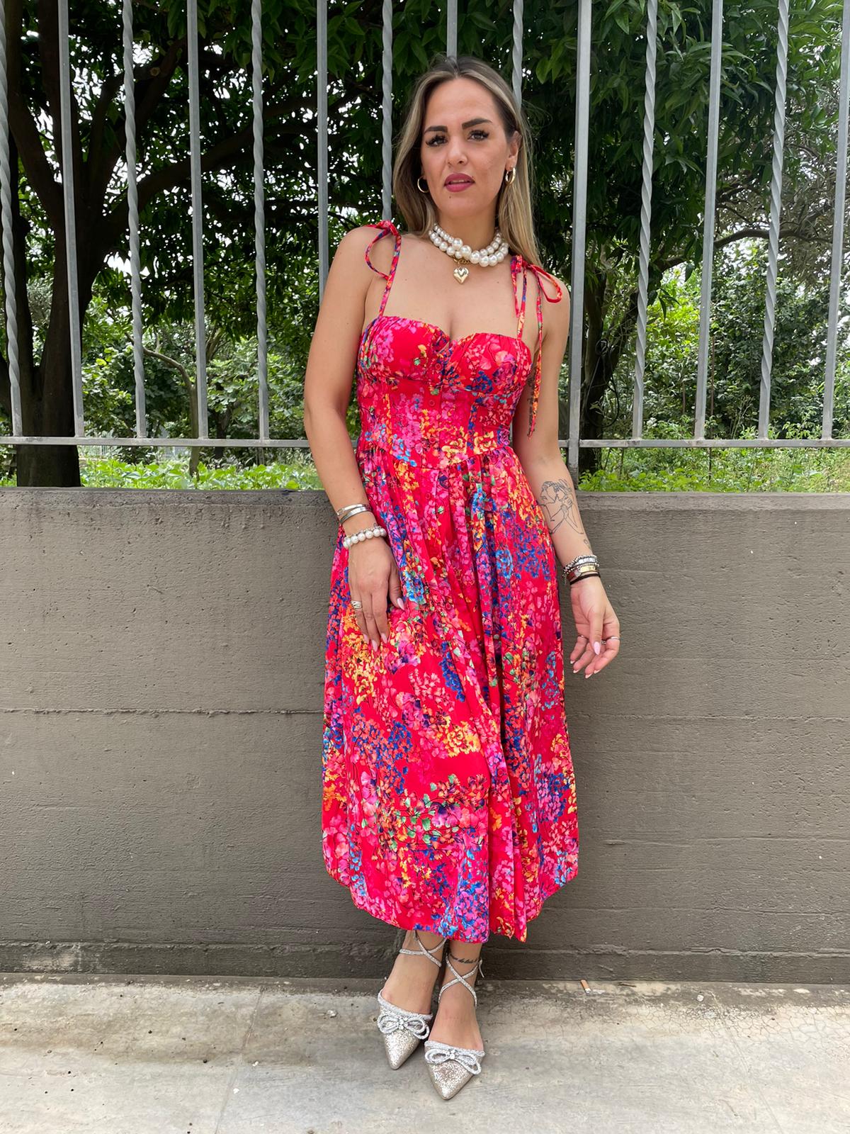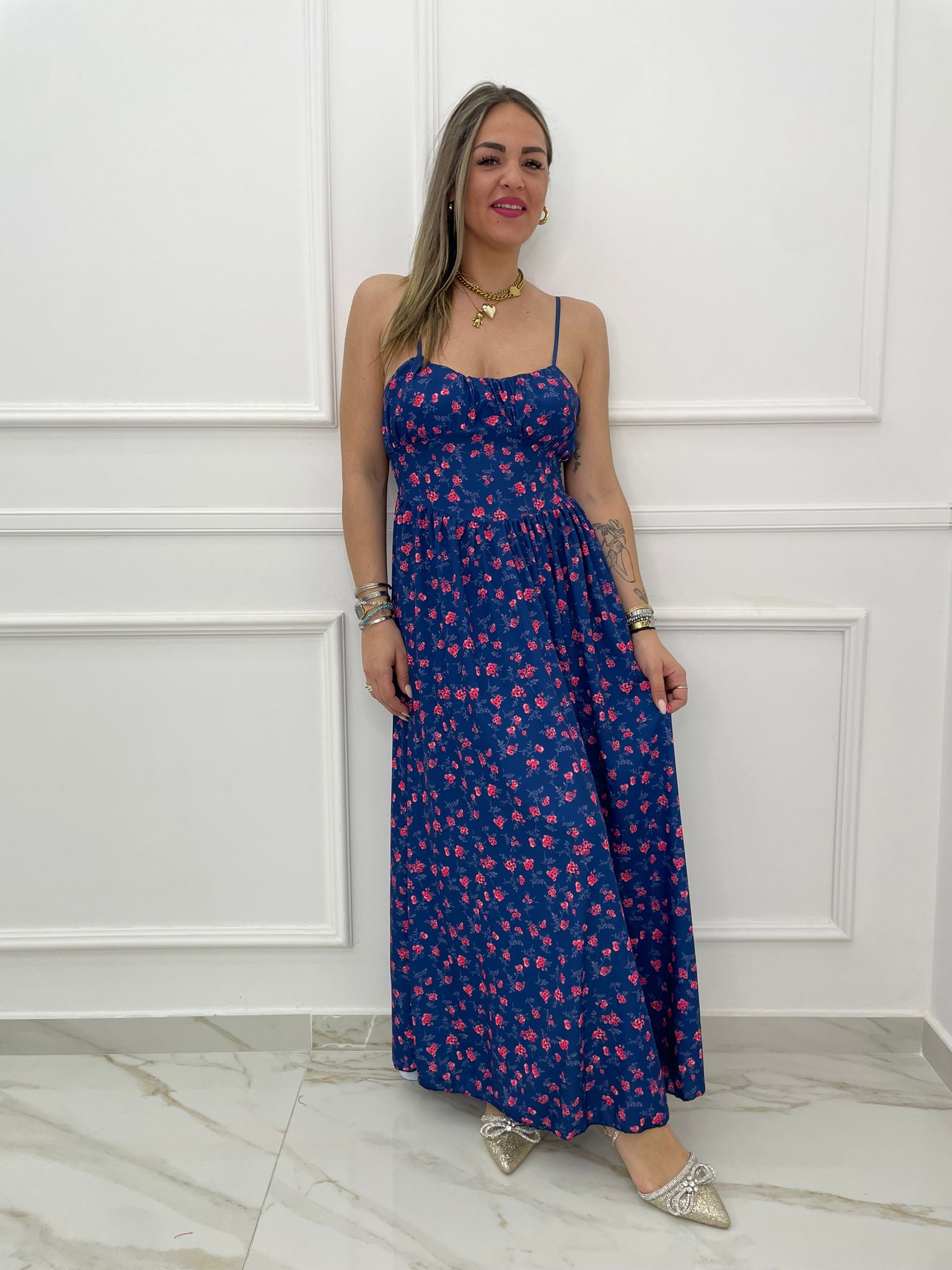 Vestito midi fantasia fiori scampanato con laccetti alle spalle