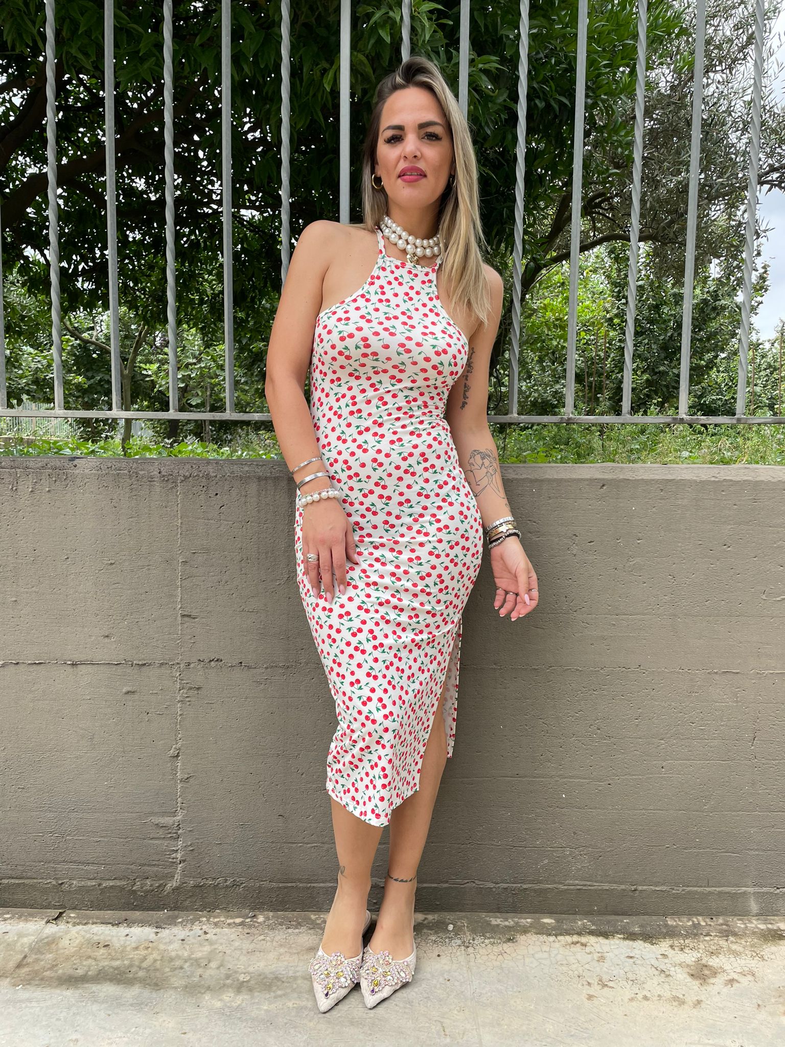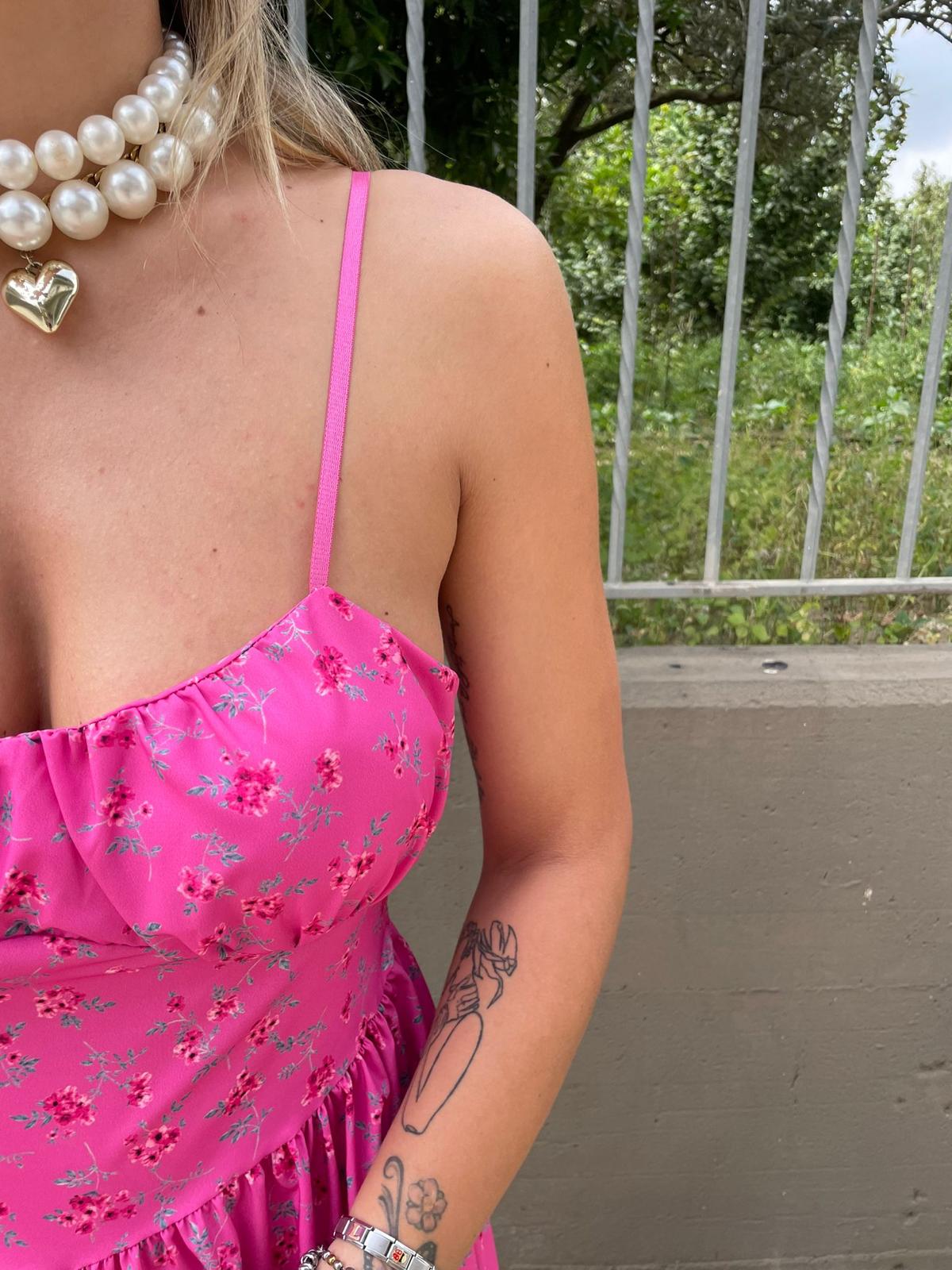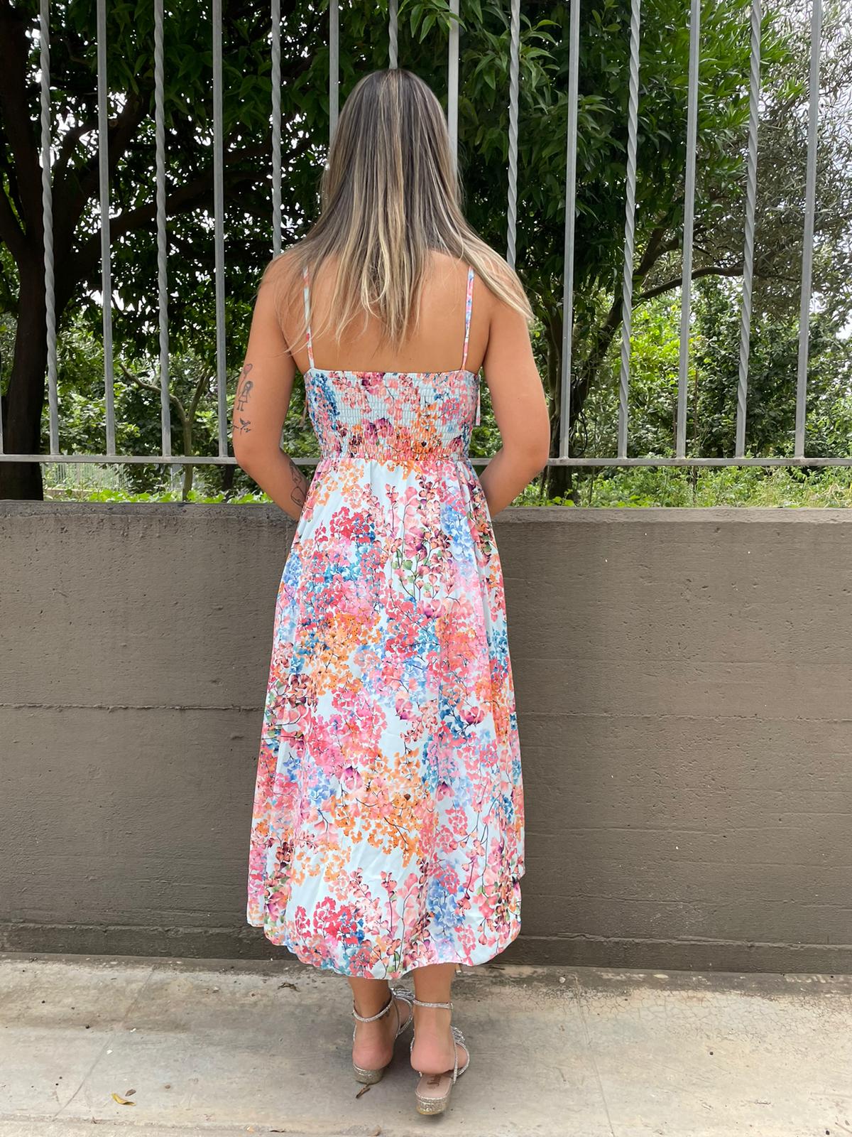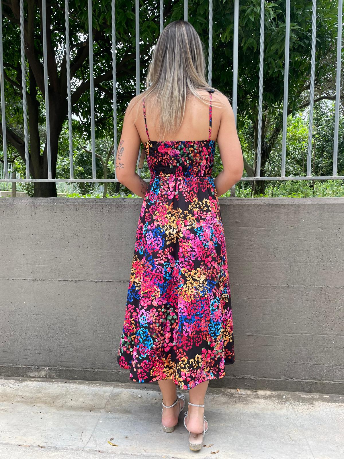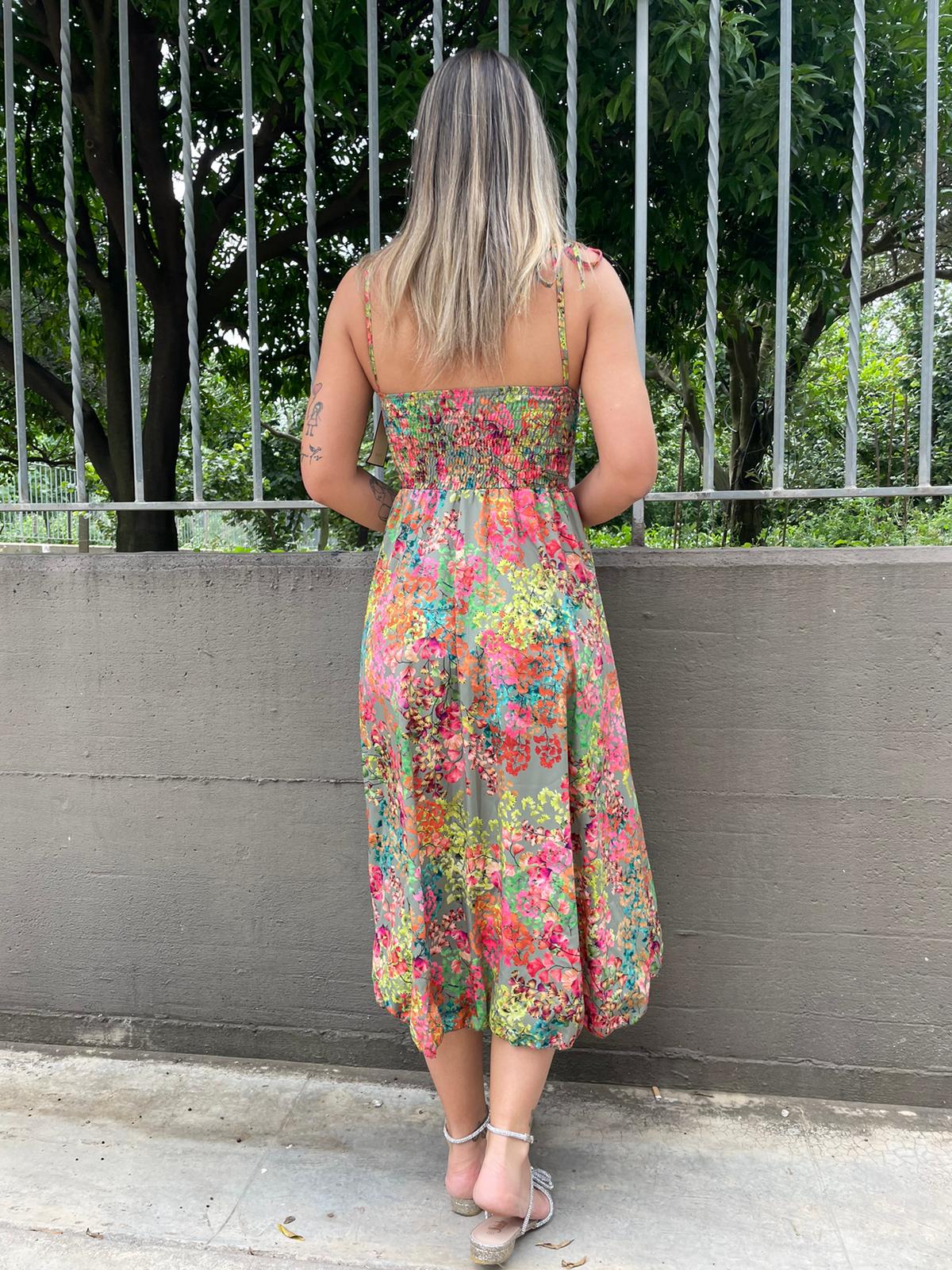 Vestito midi fantasia fiori scampanato con laccetti alle spalle