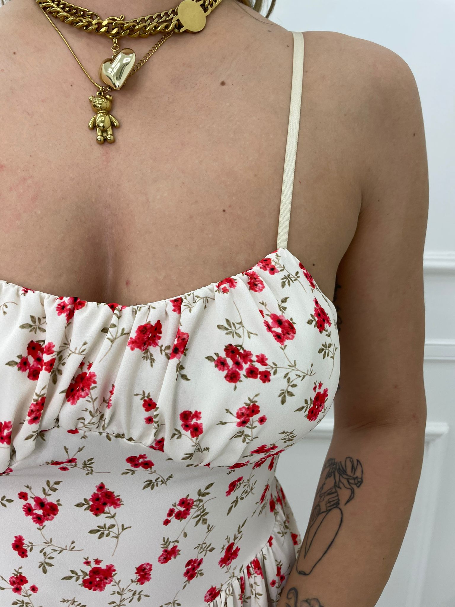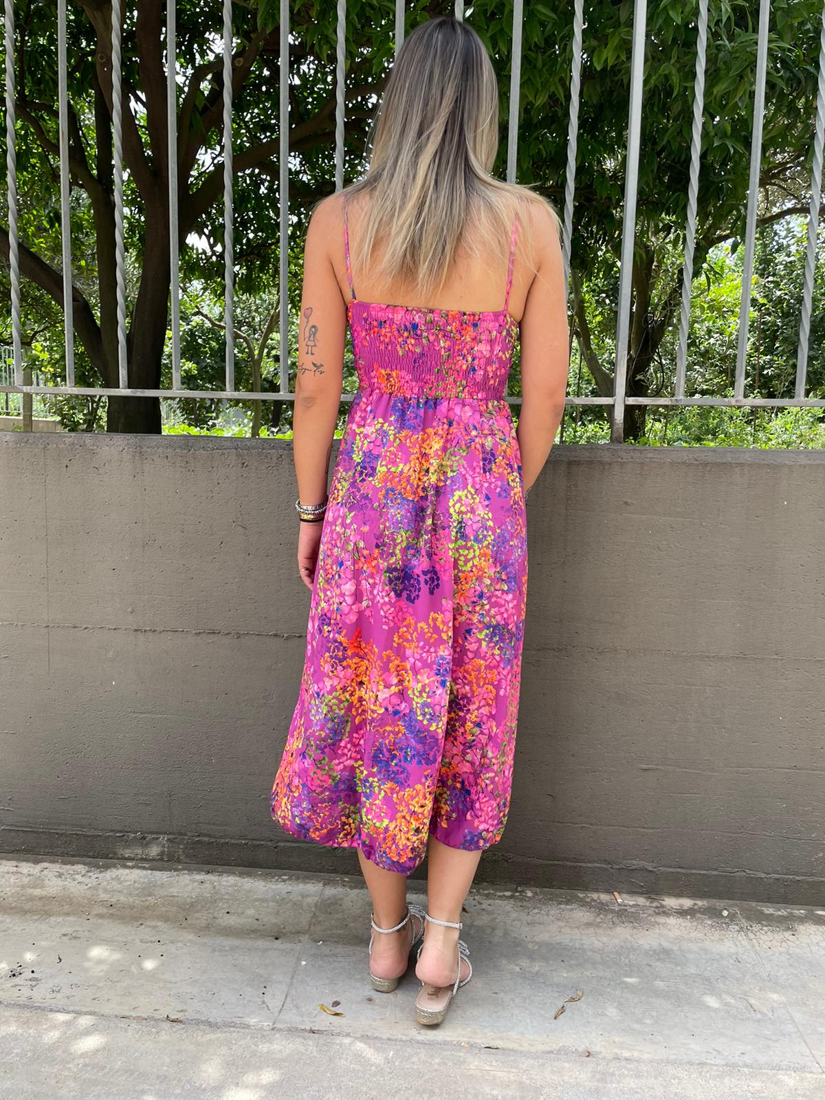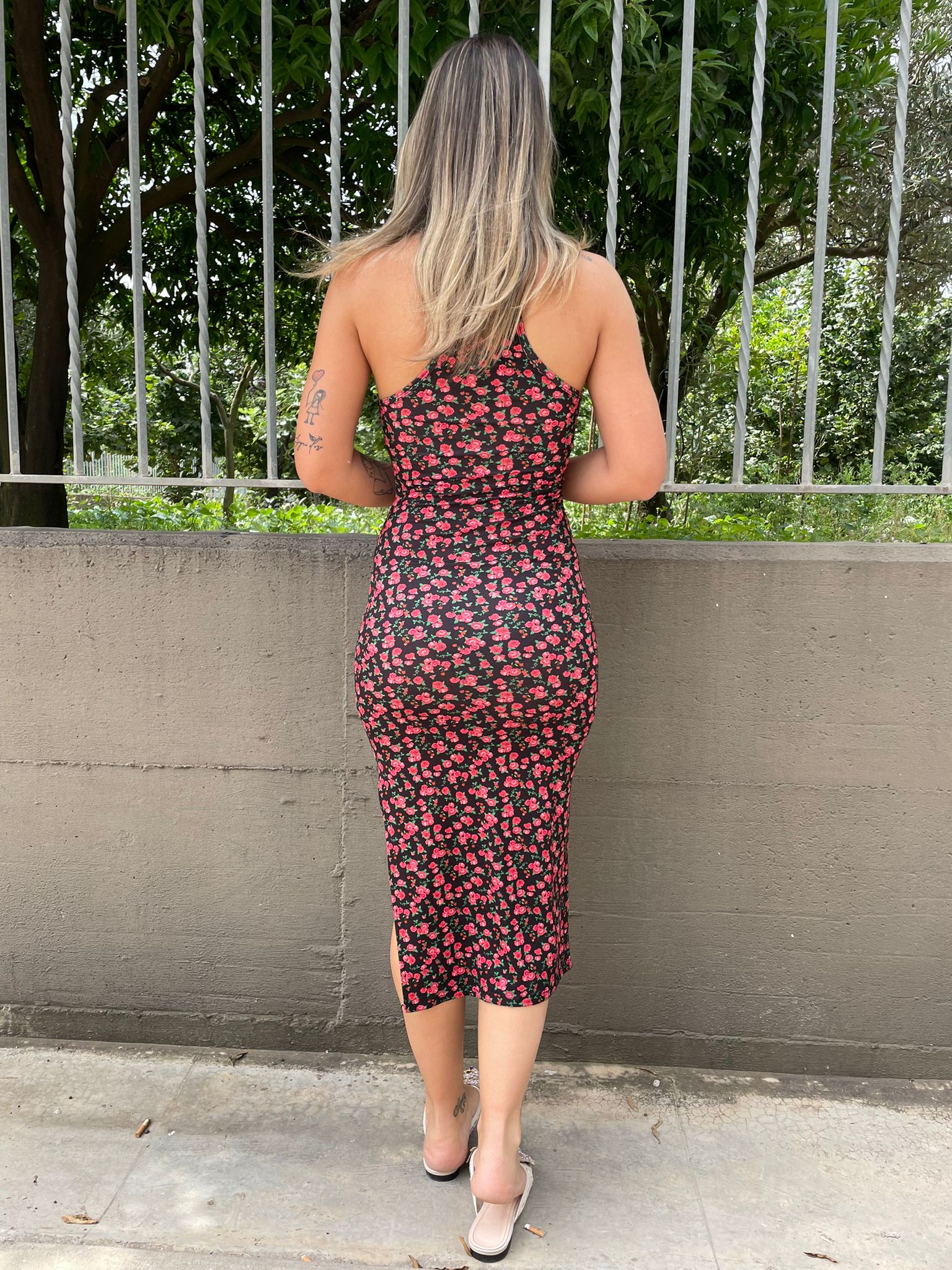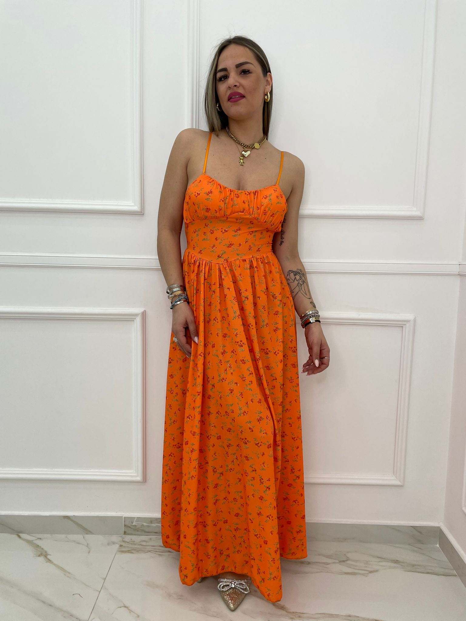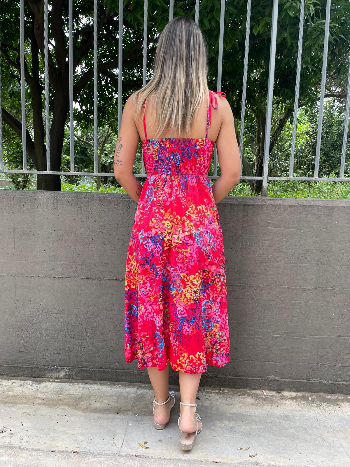 Vestito midi fantasia fiori scampanato con laccetti alle spalle