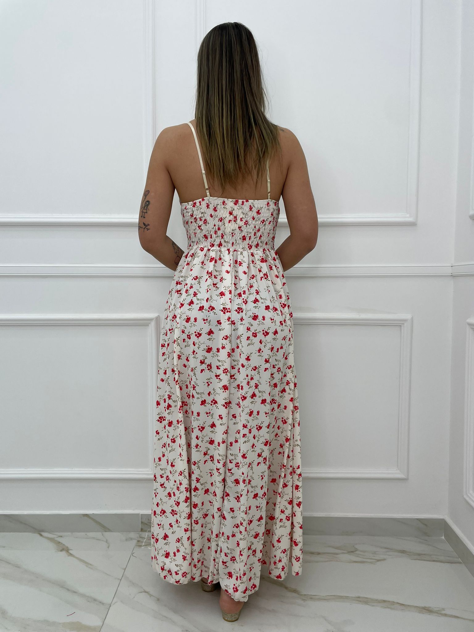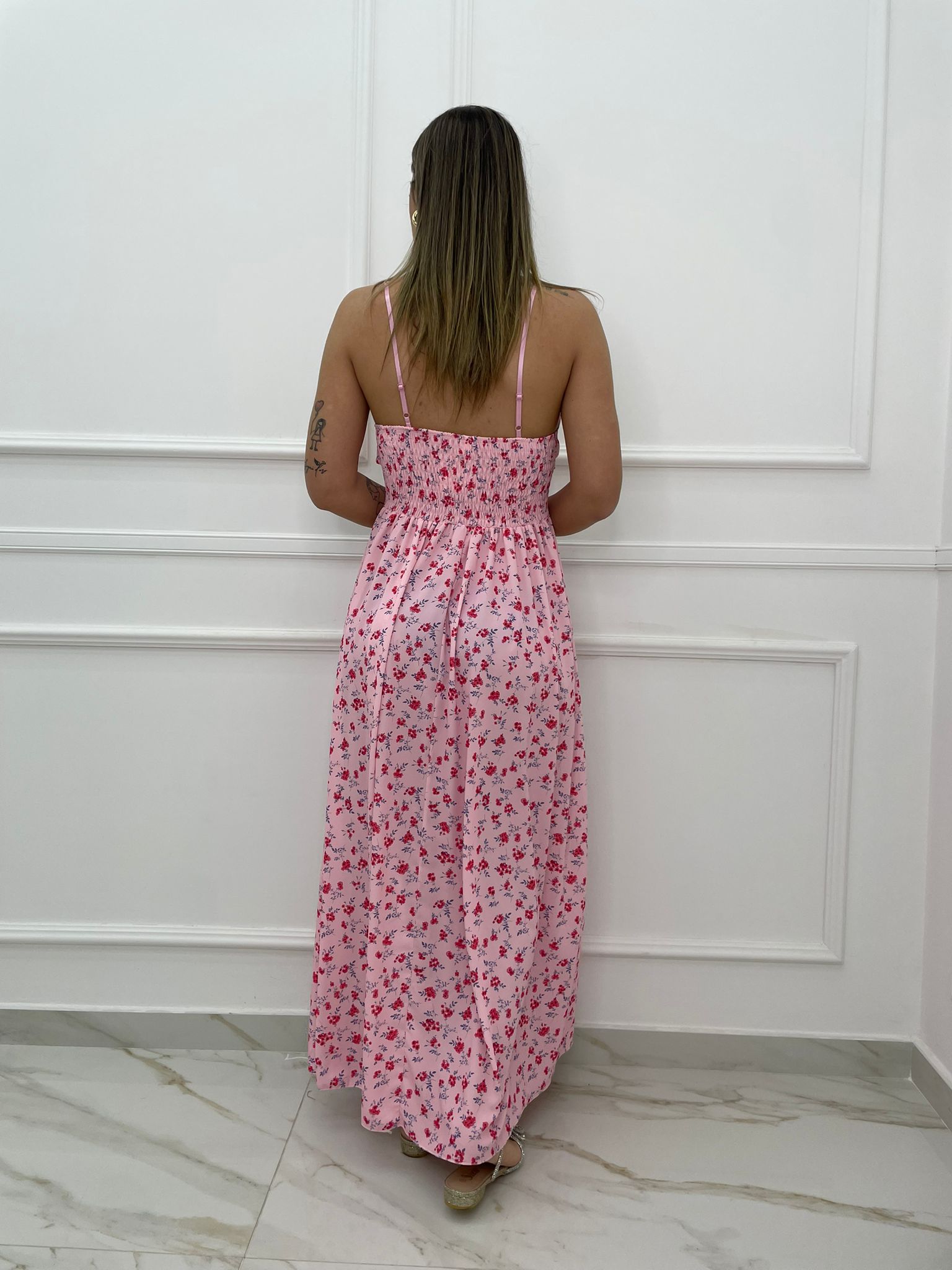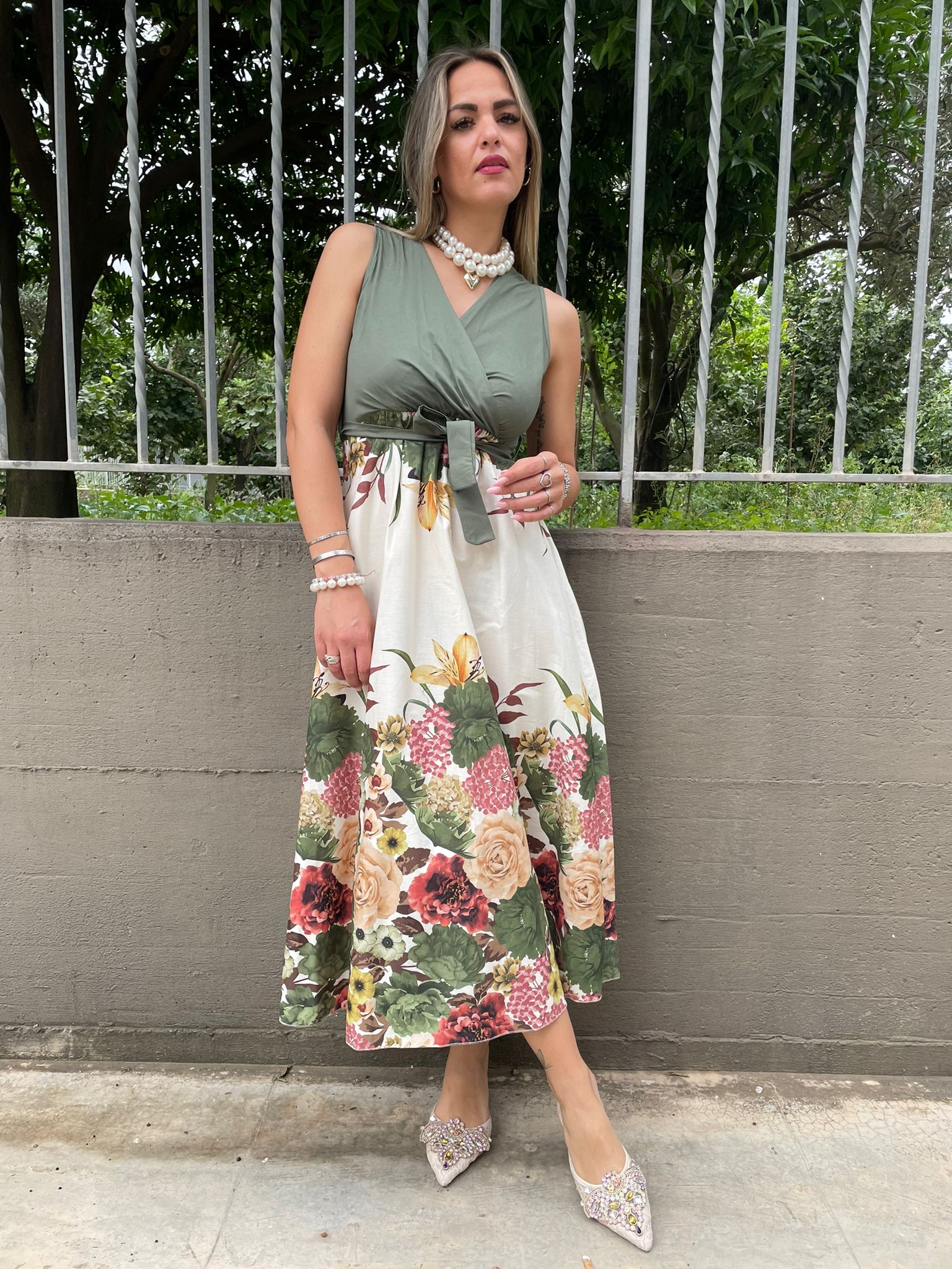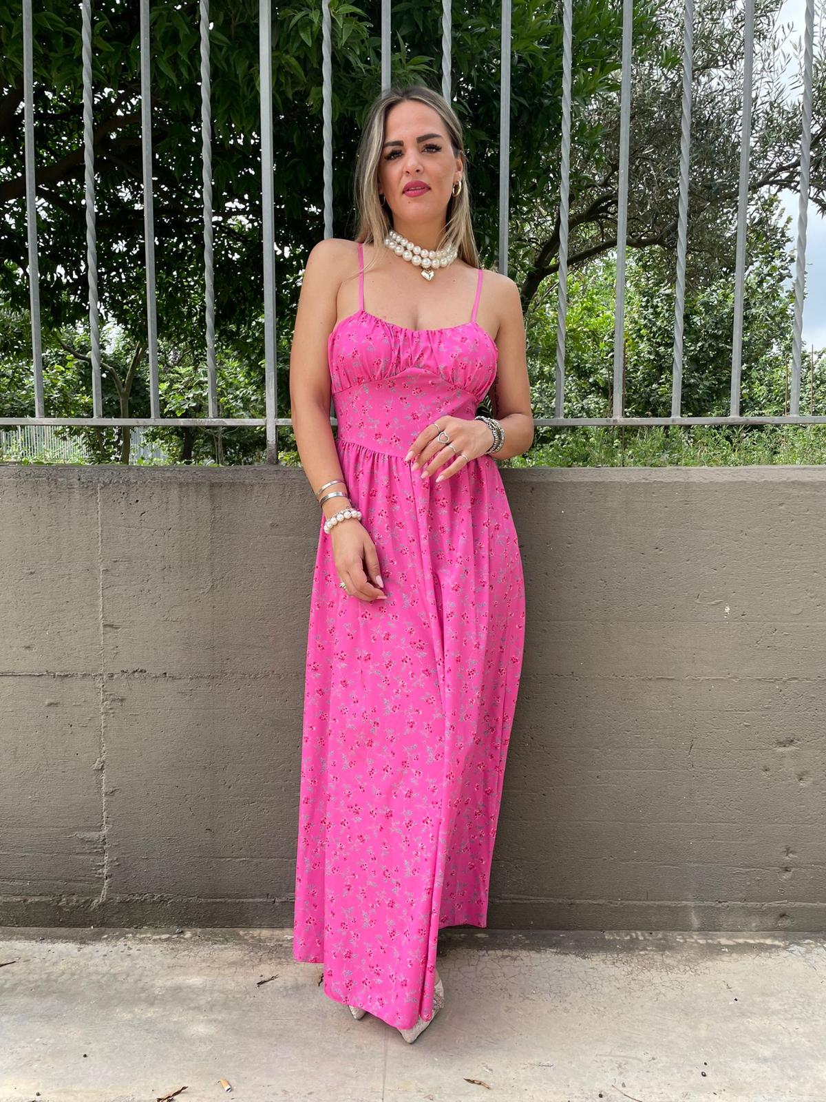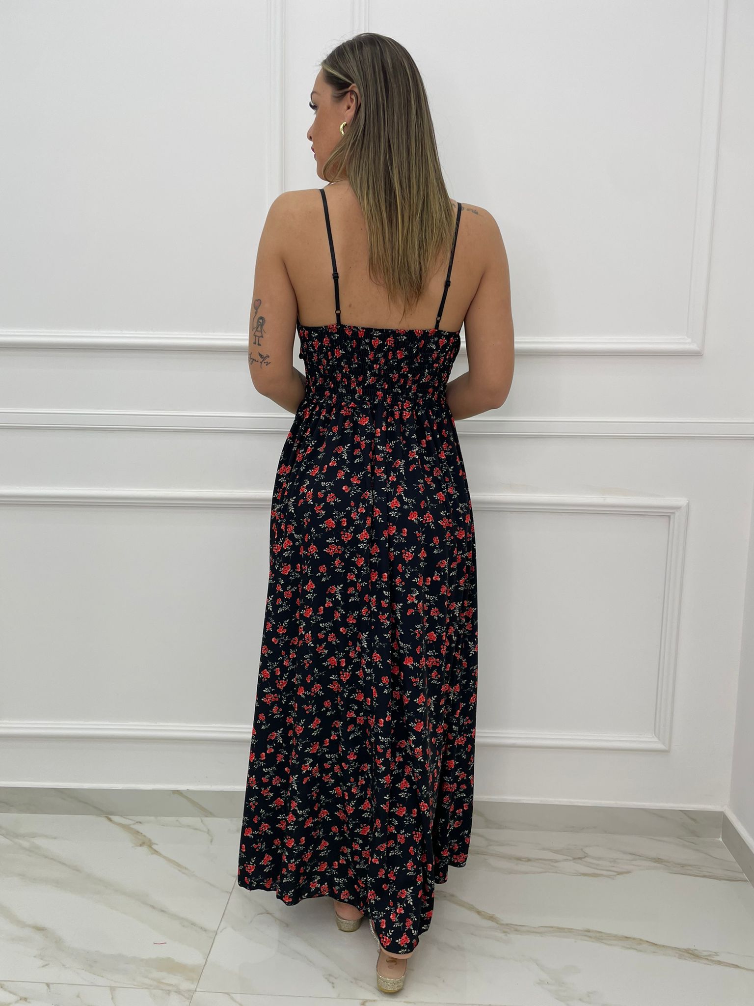 Vestito midi fantasia fiori scampanato con laccetti alle spalle