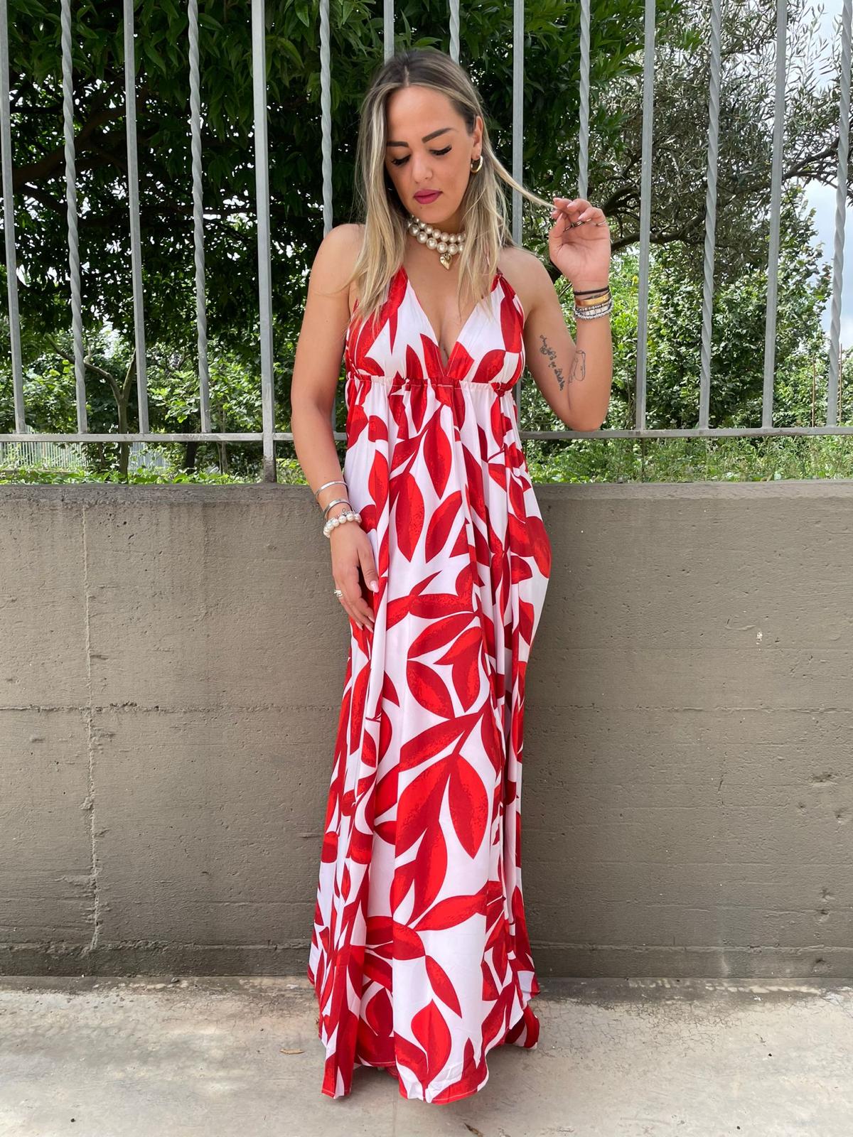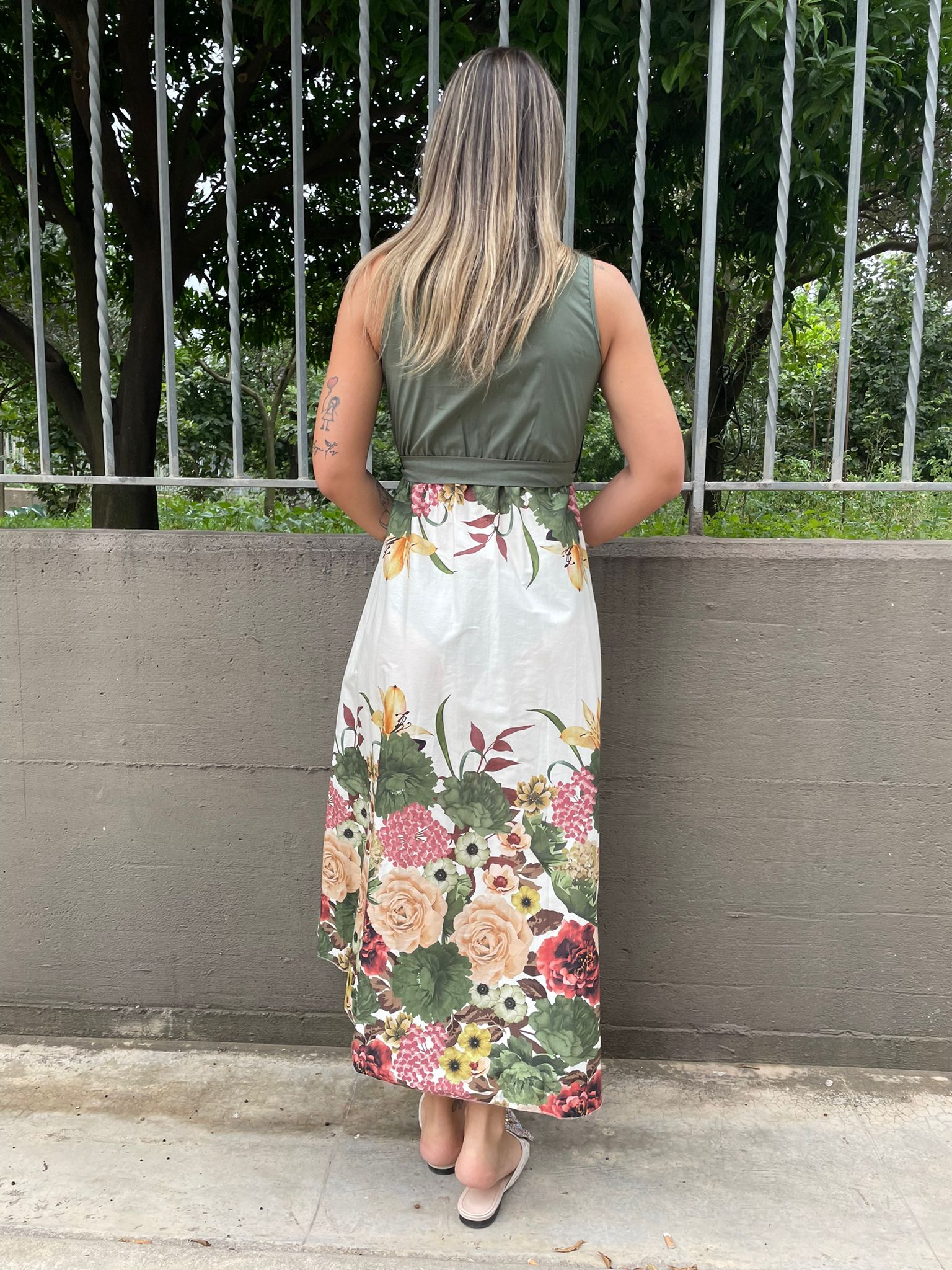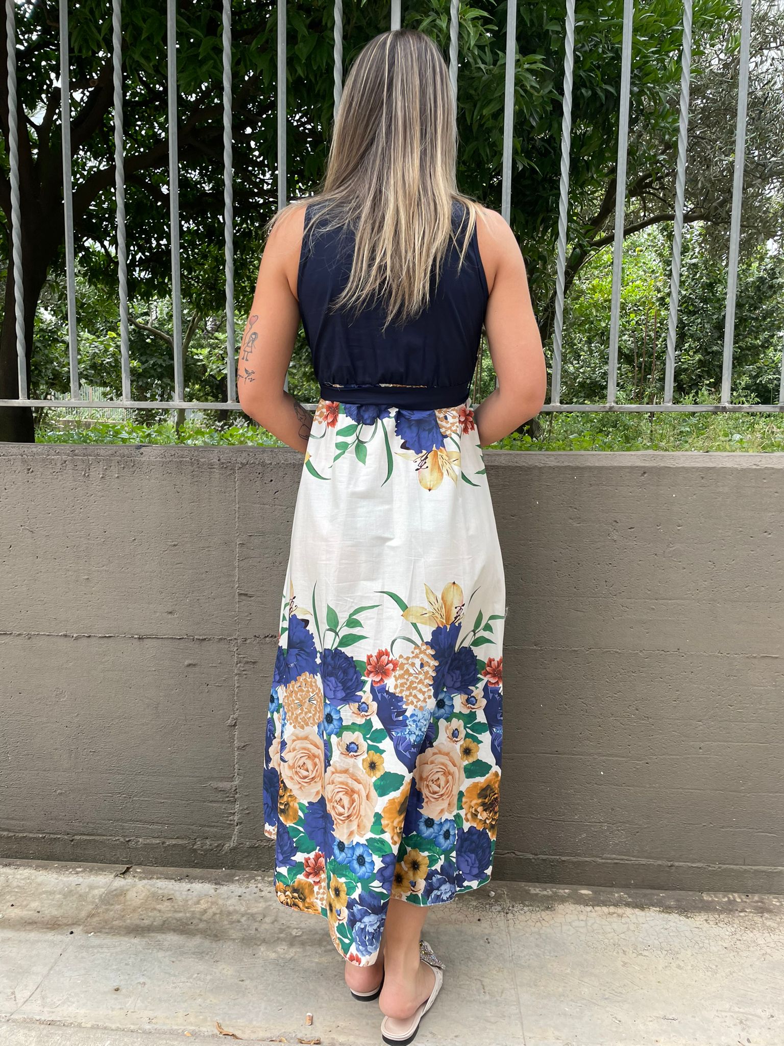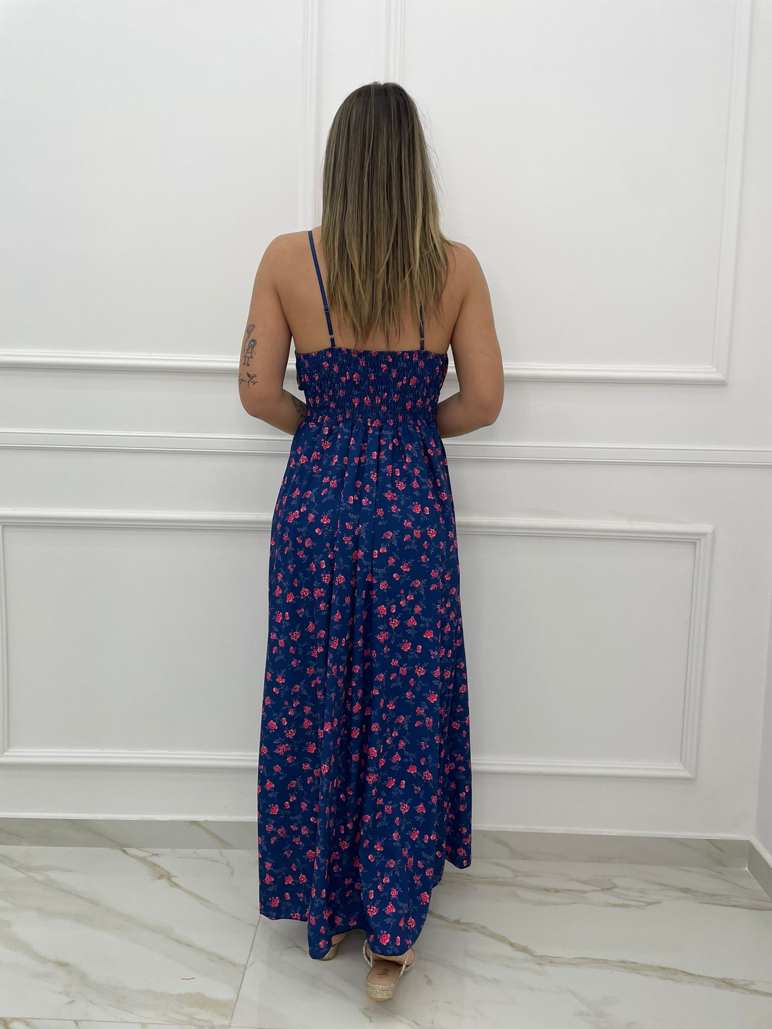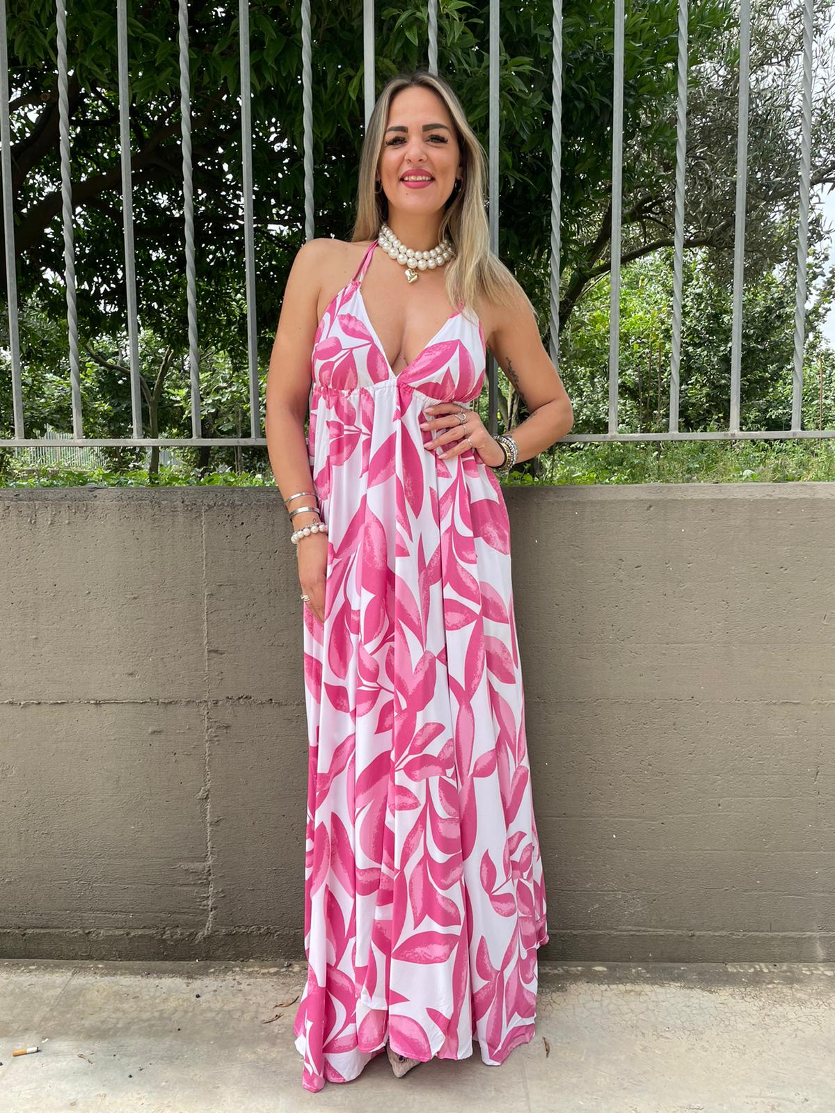 Vestito midi fantasia fiori scampanato con laccetti alle spalle