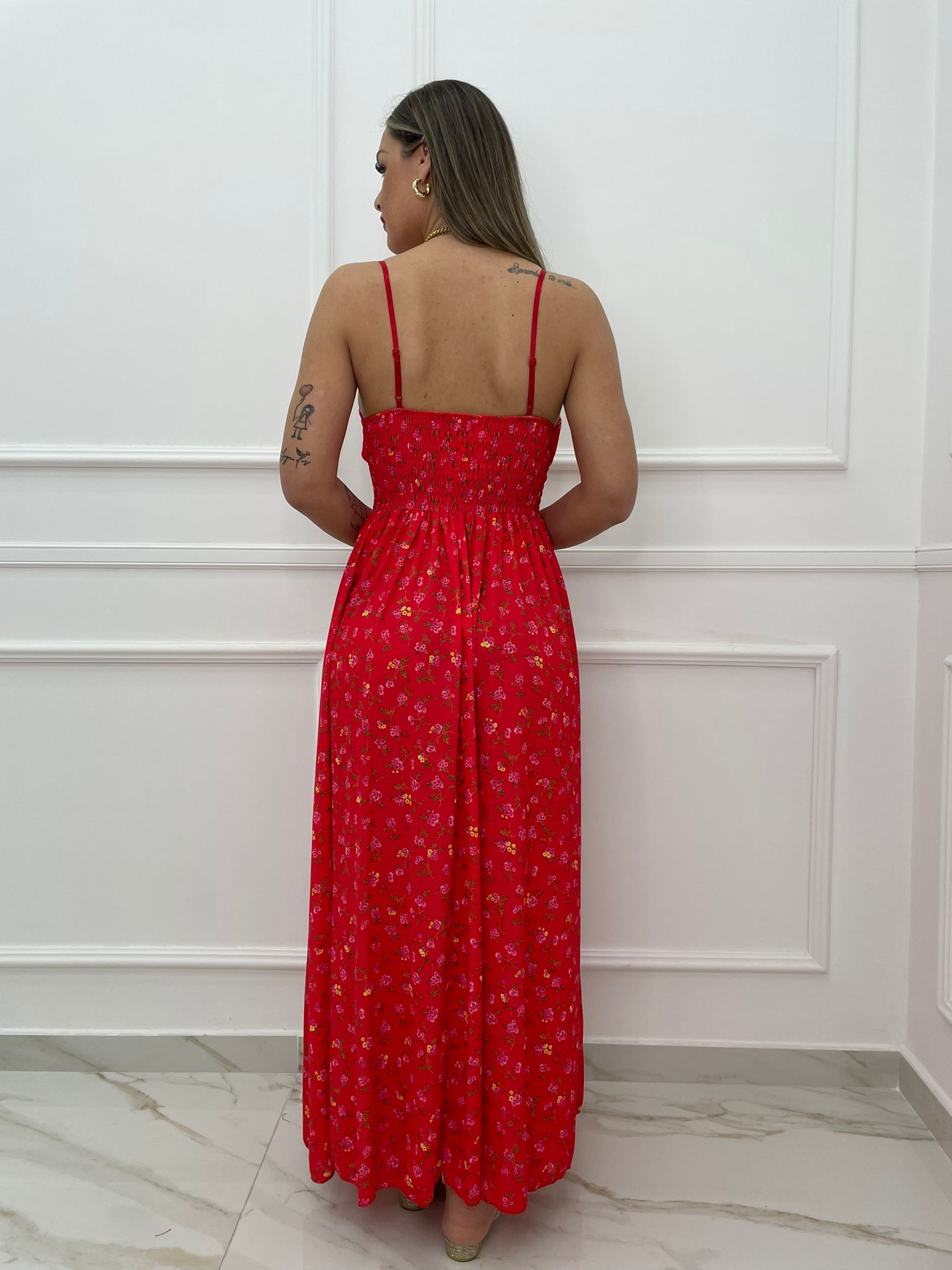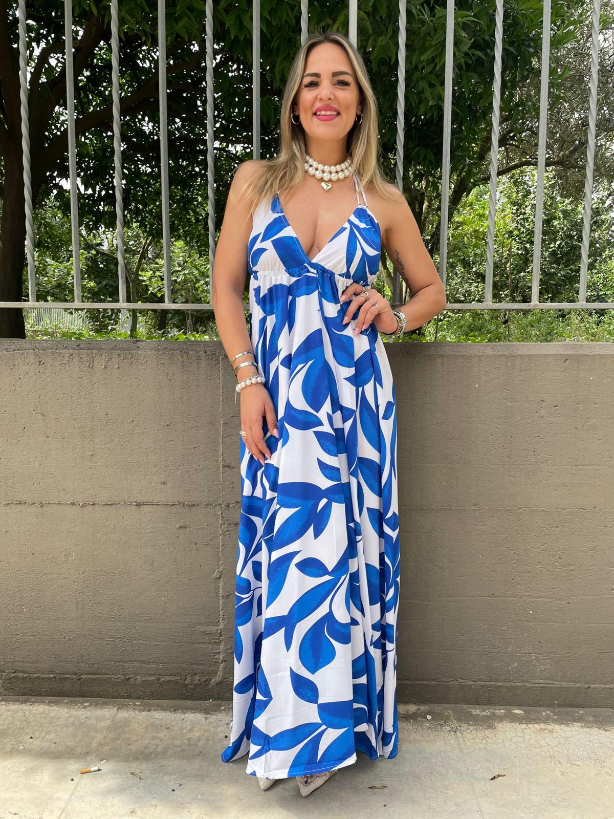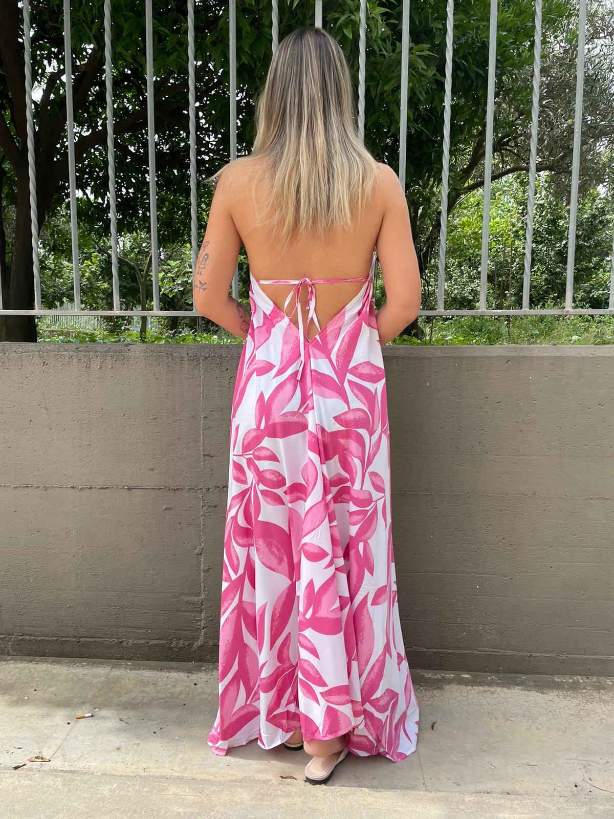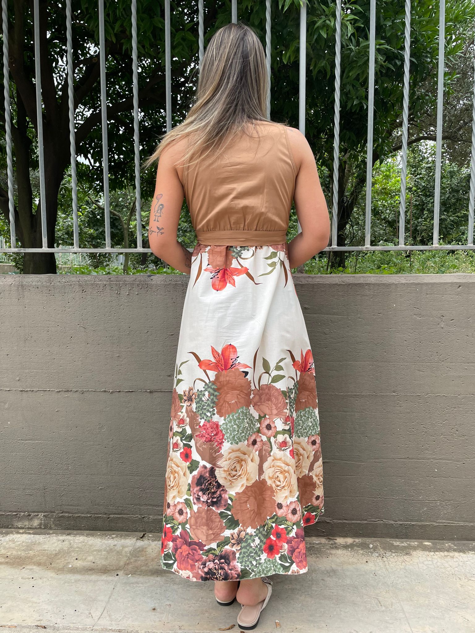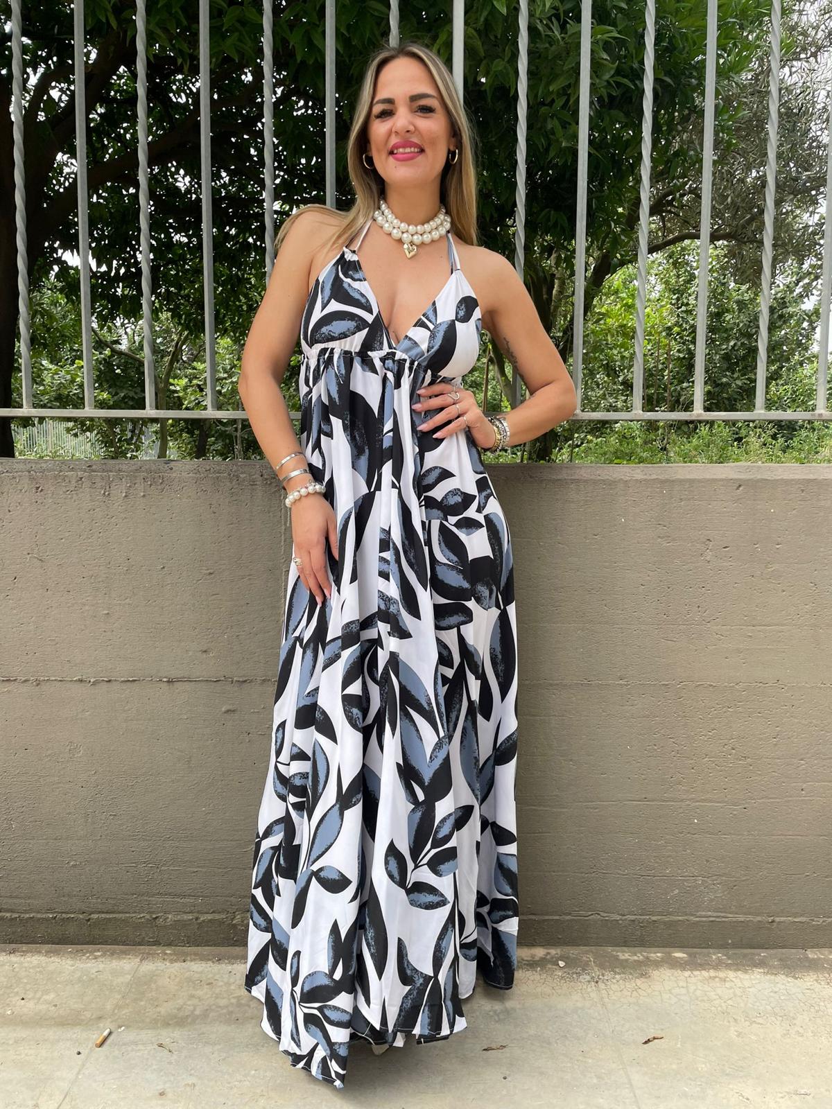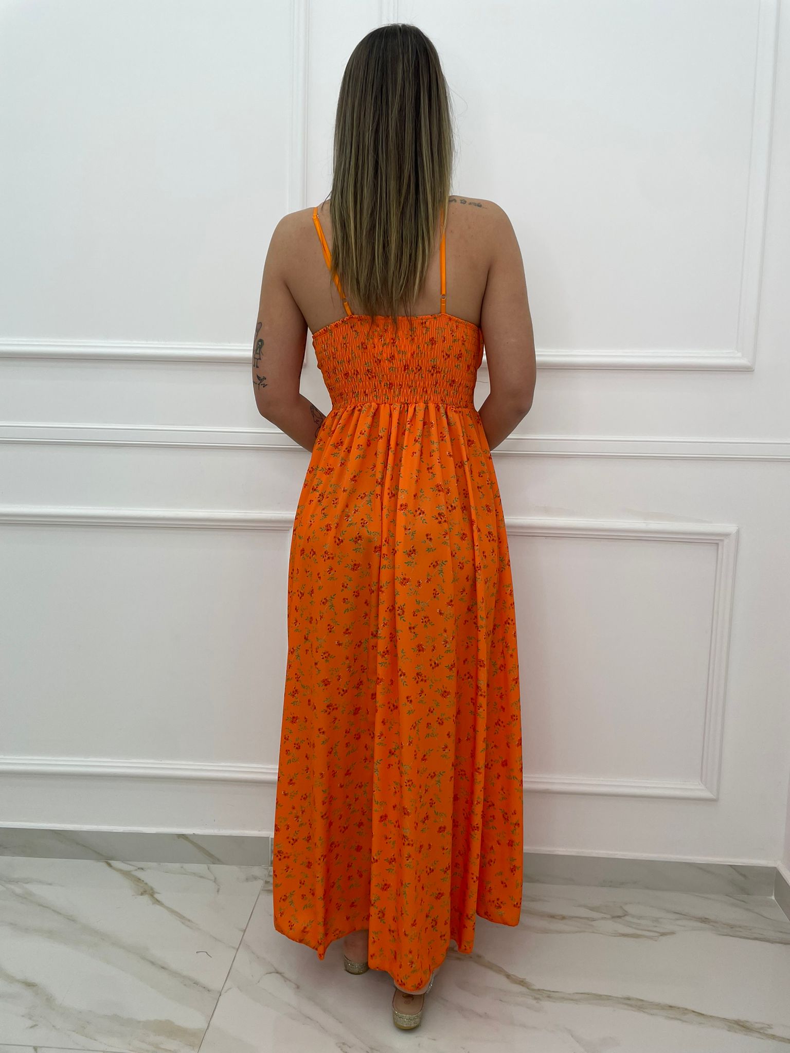 Vestito midi fantasia fiori scampanato con laccetti alle spalle