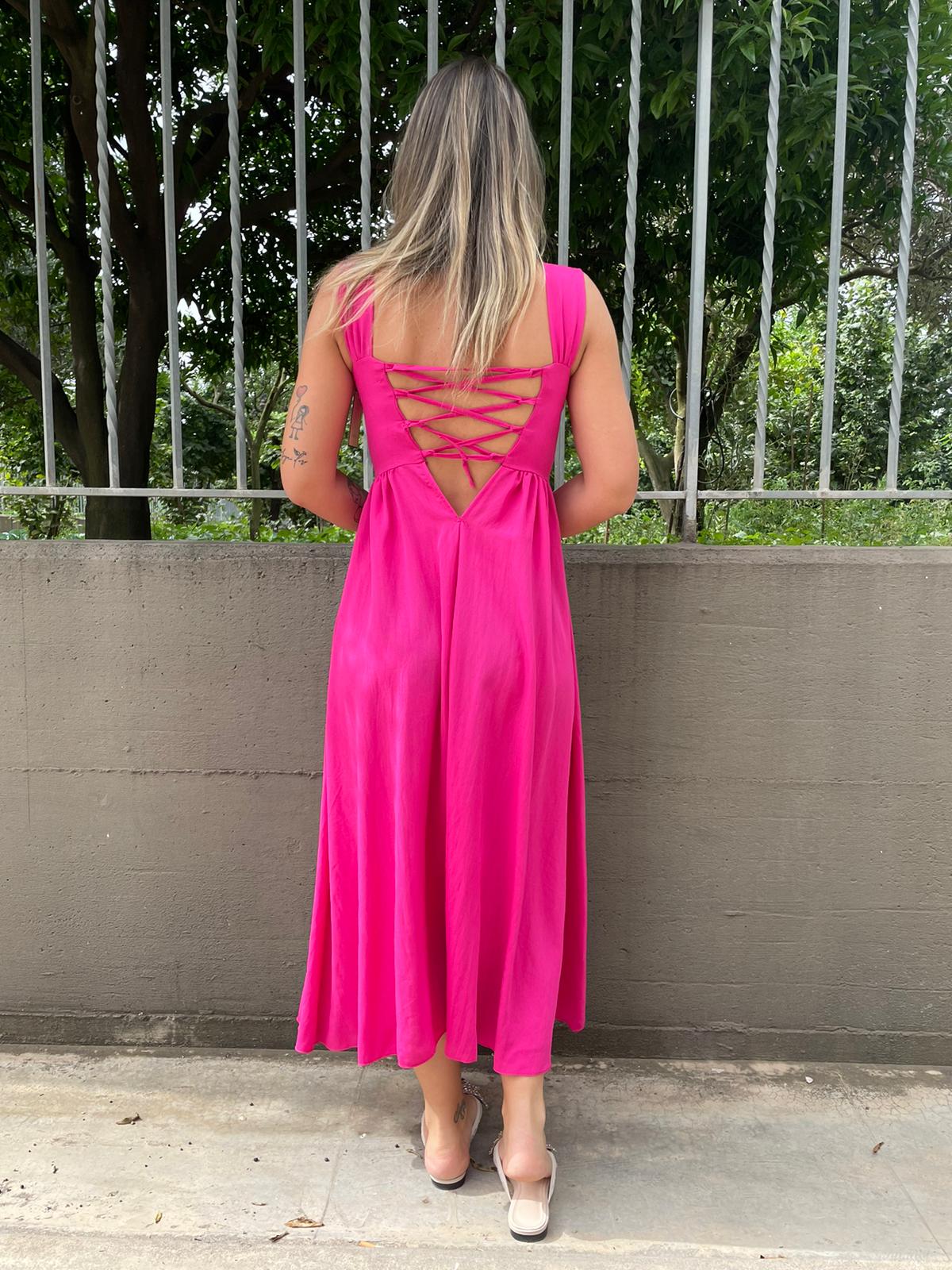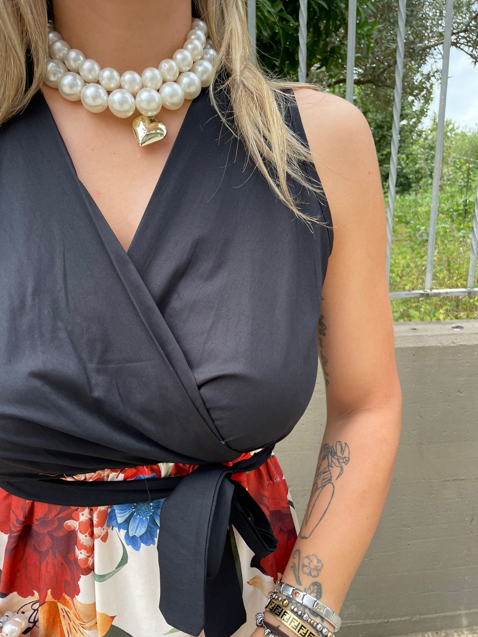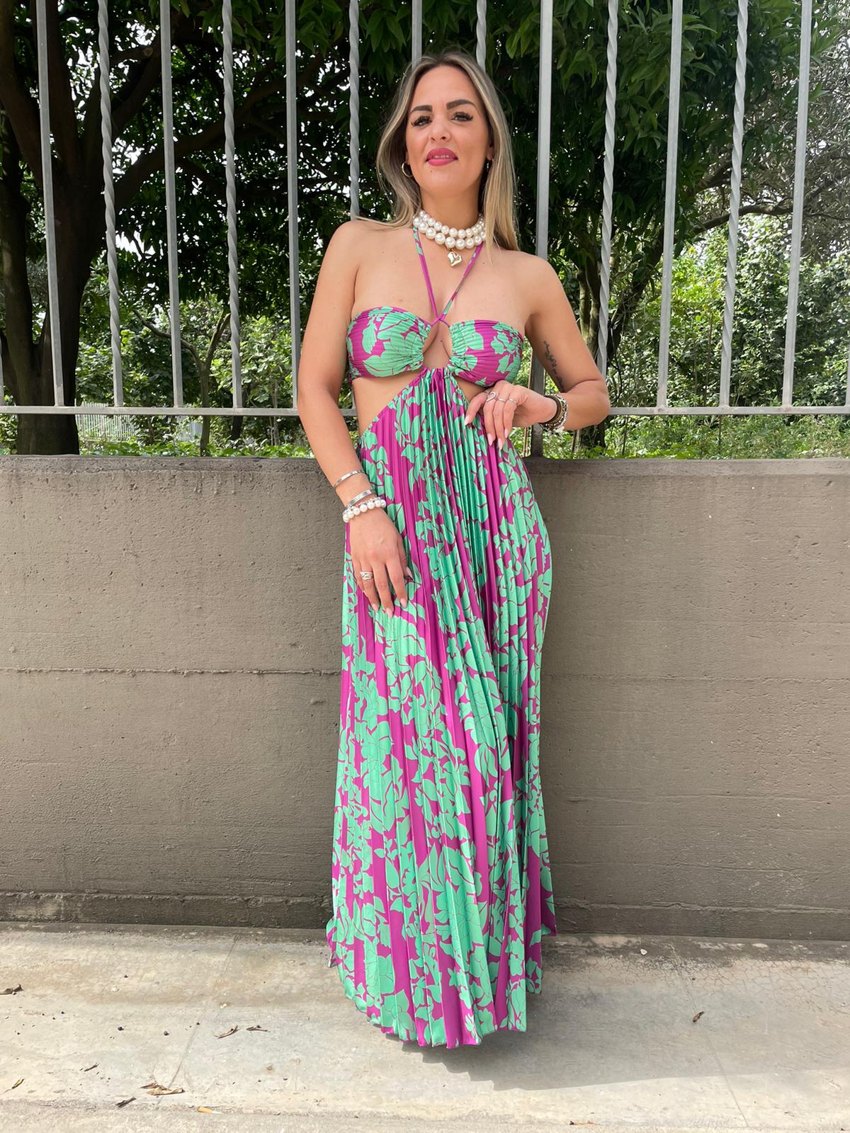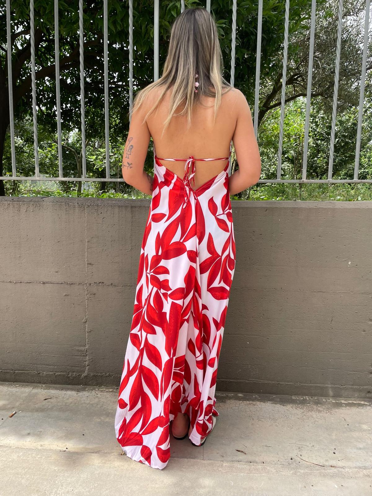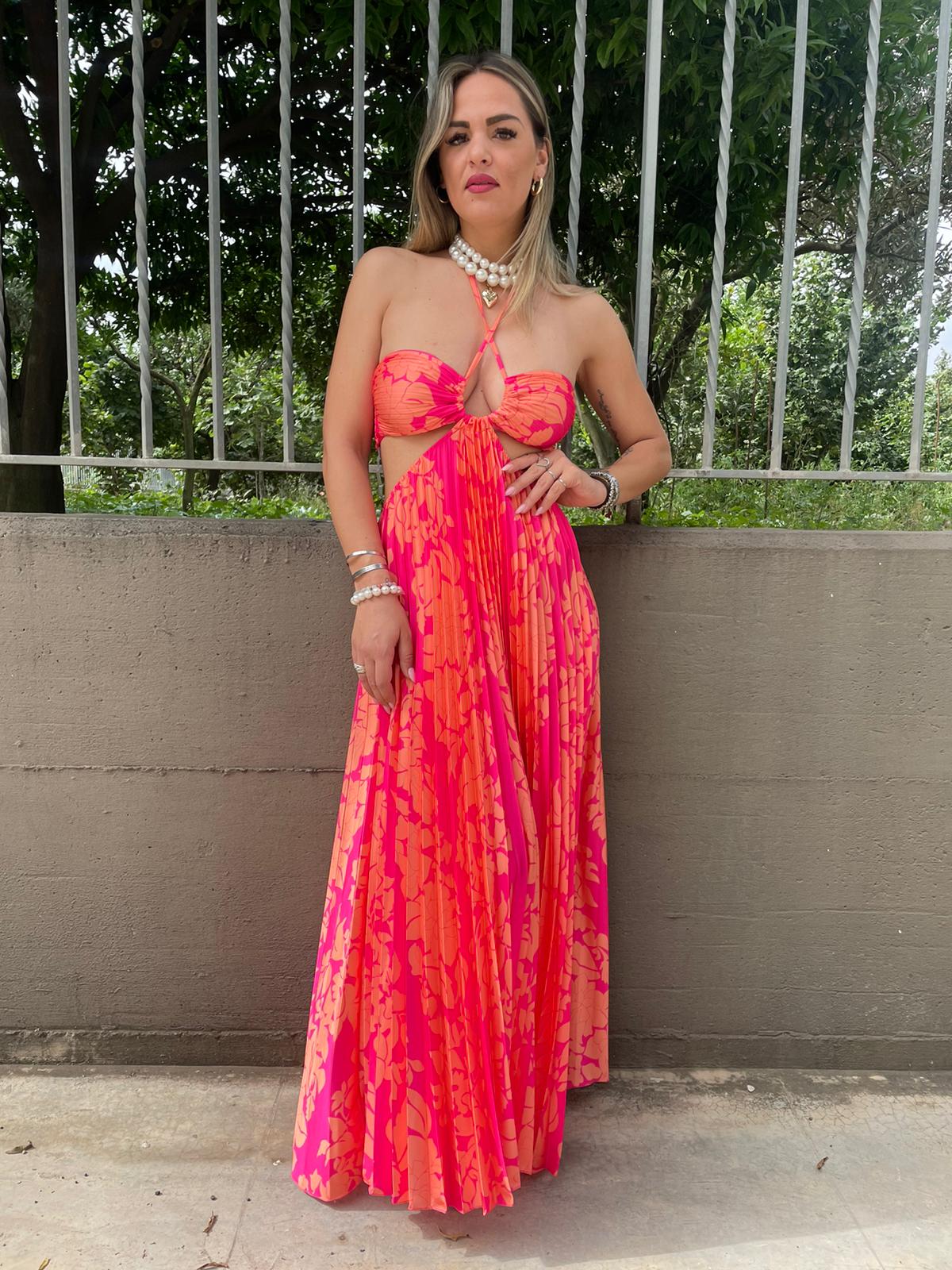 Vestito midi fantasia fiori scampanato con laccetti alle spalle