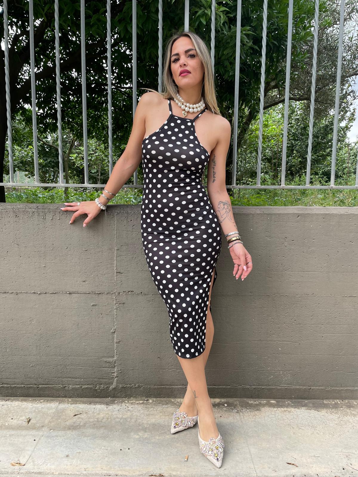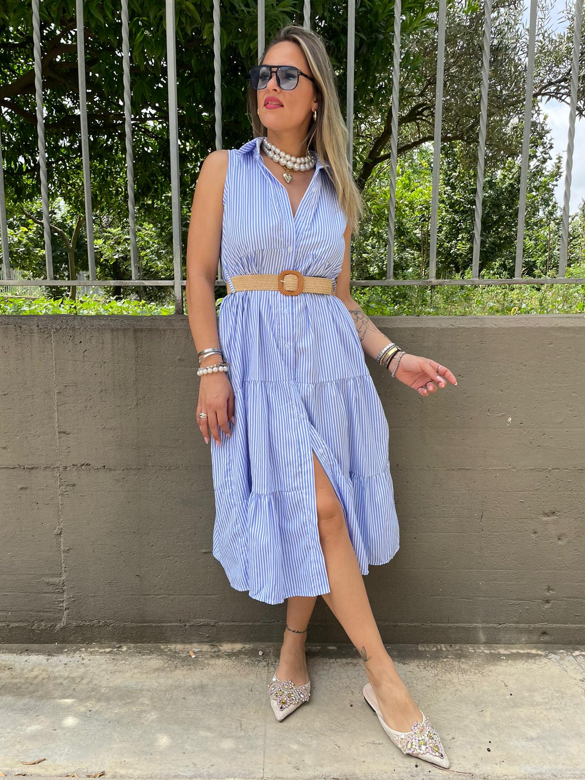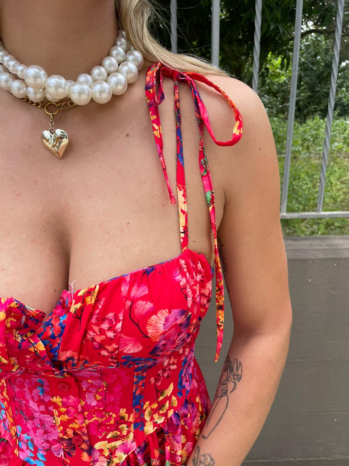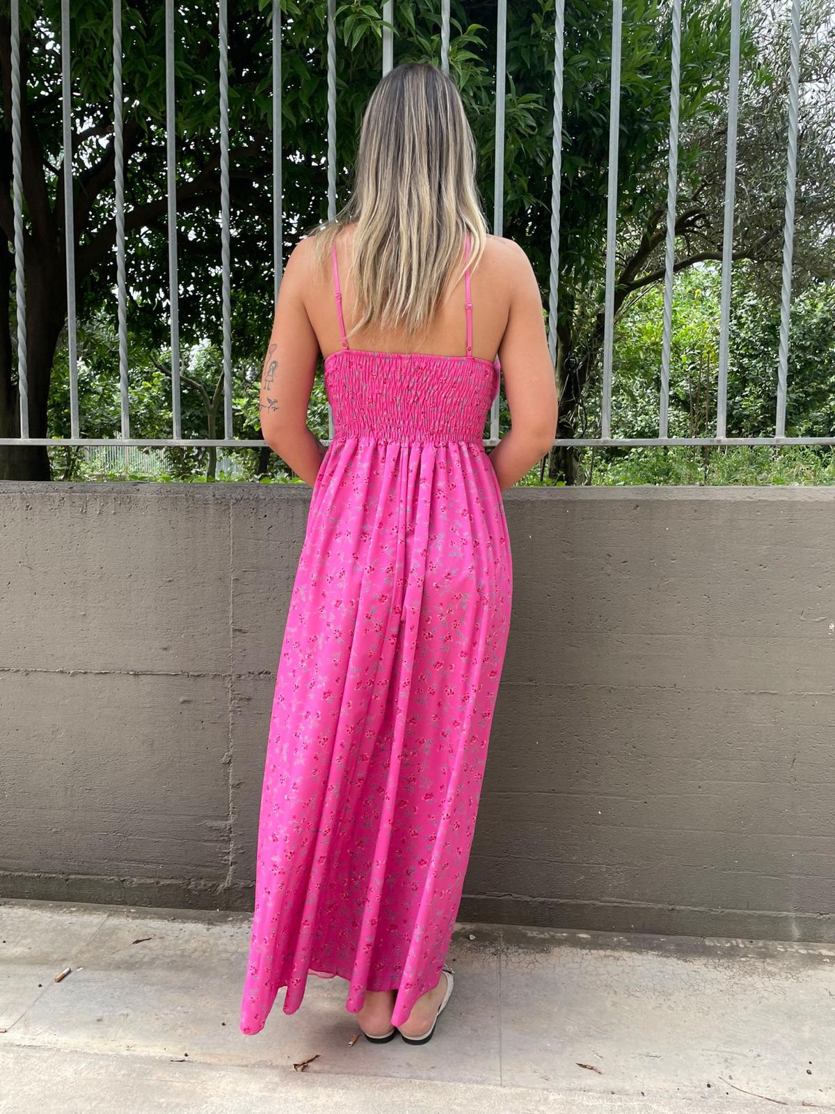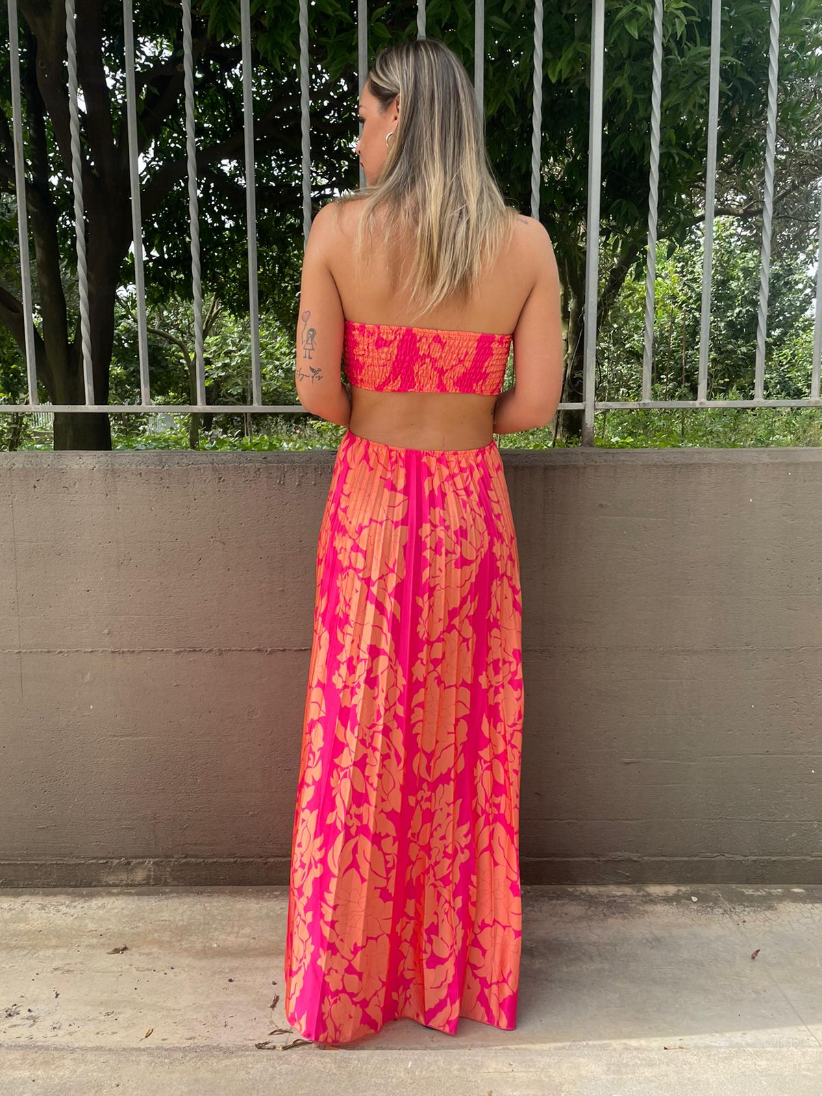 Vestito midi fantasia fiori scampanato con laccetti alle spalle