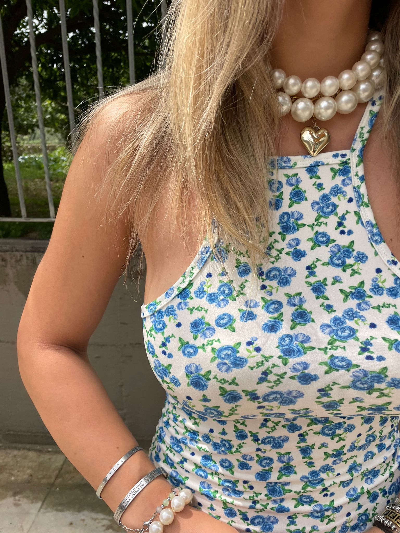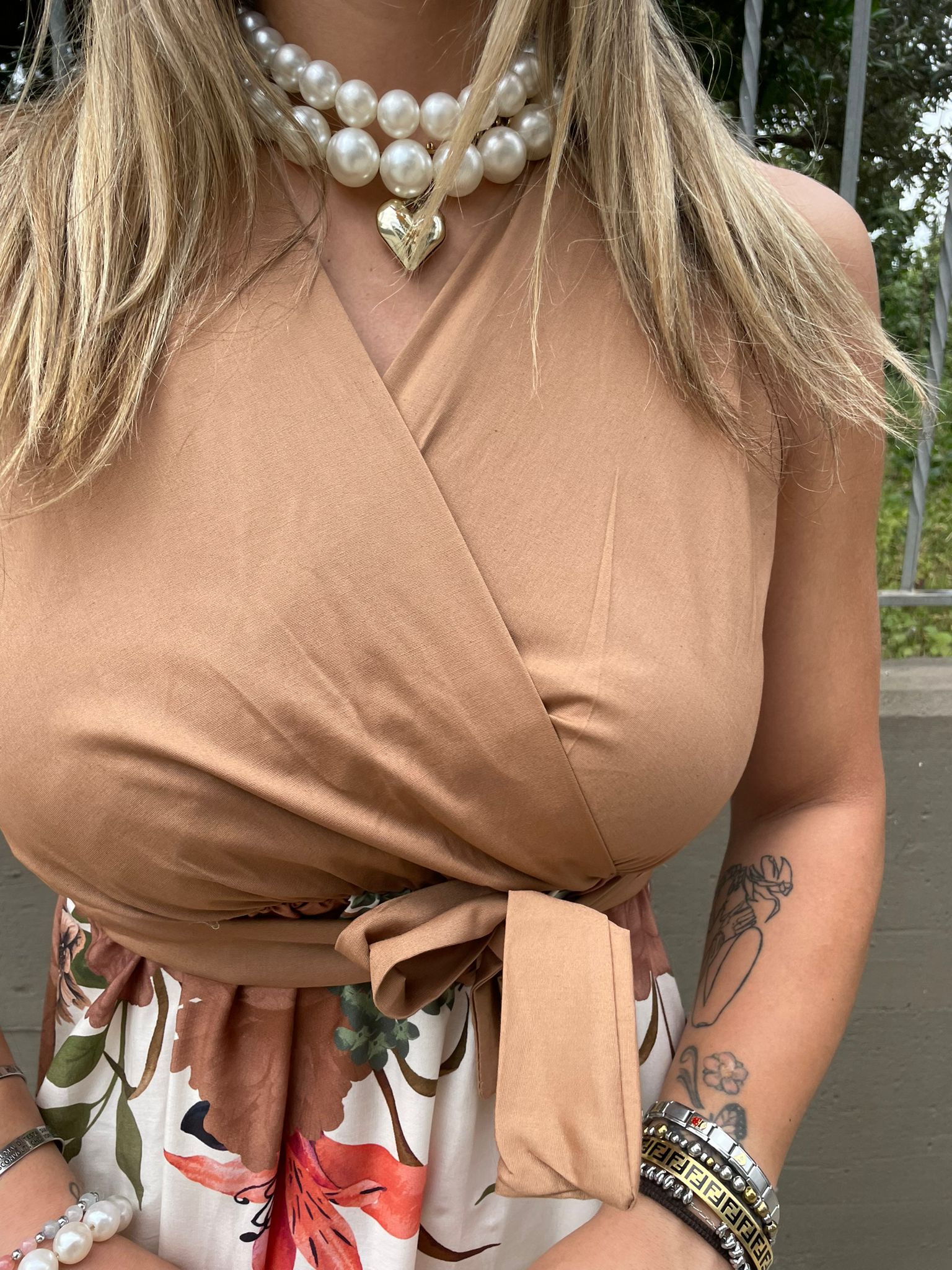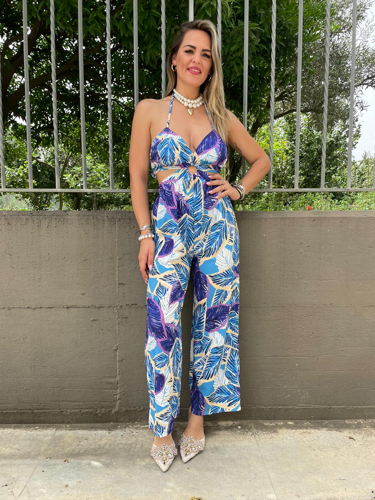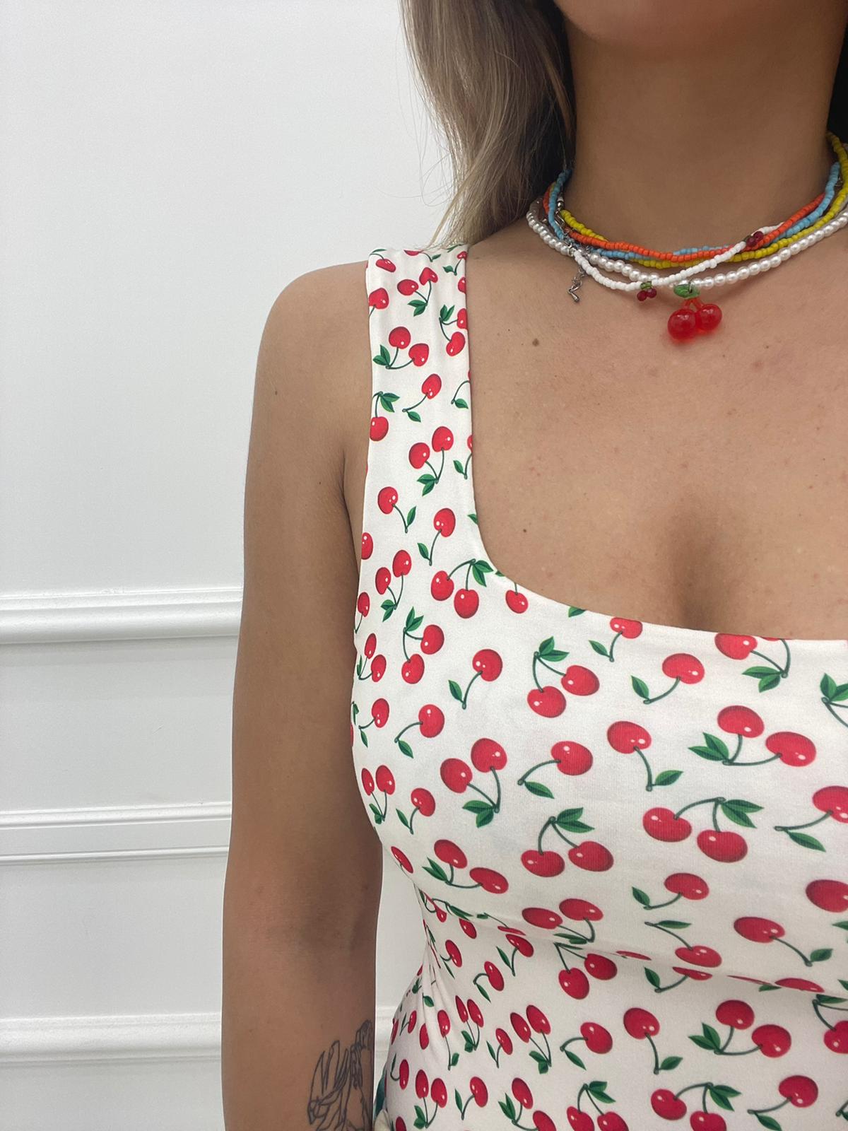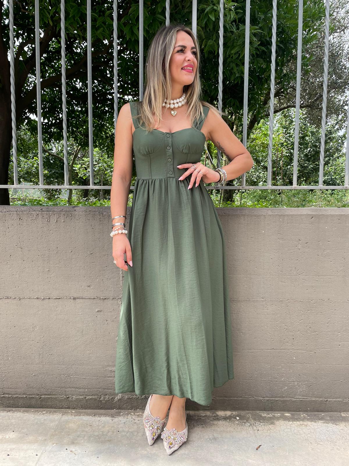 Vestito midi fantasia fiori scampanato con laccetti alle spalle