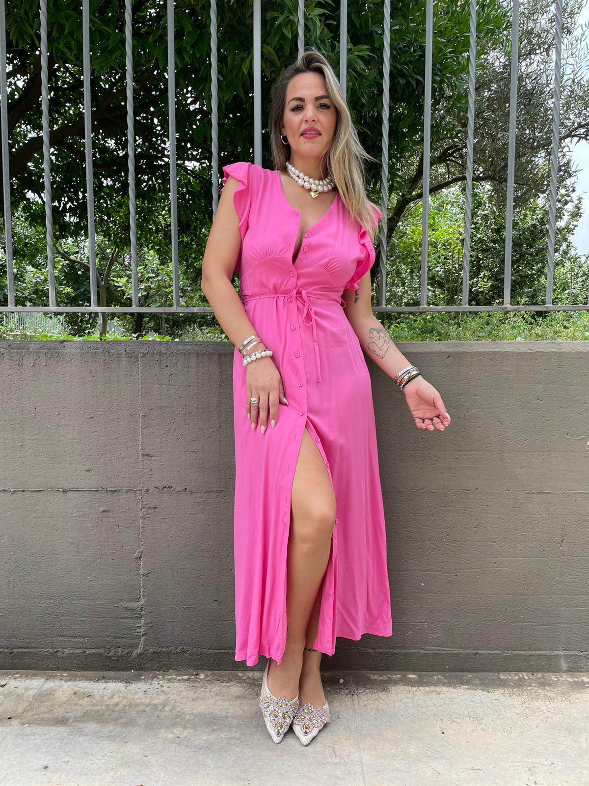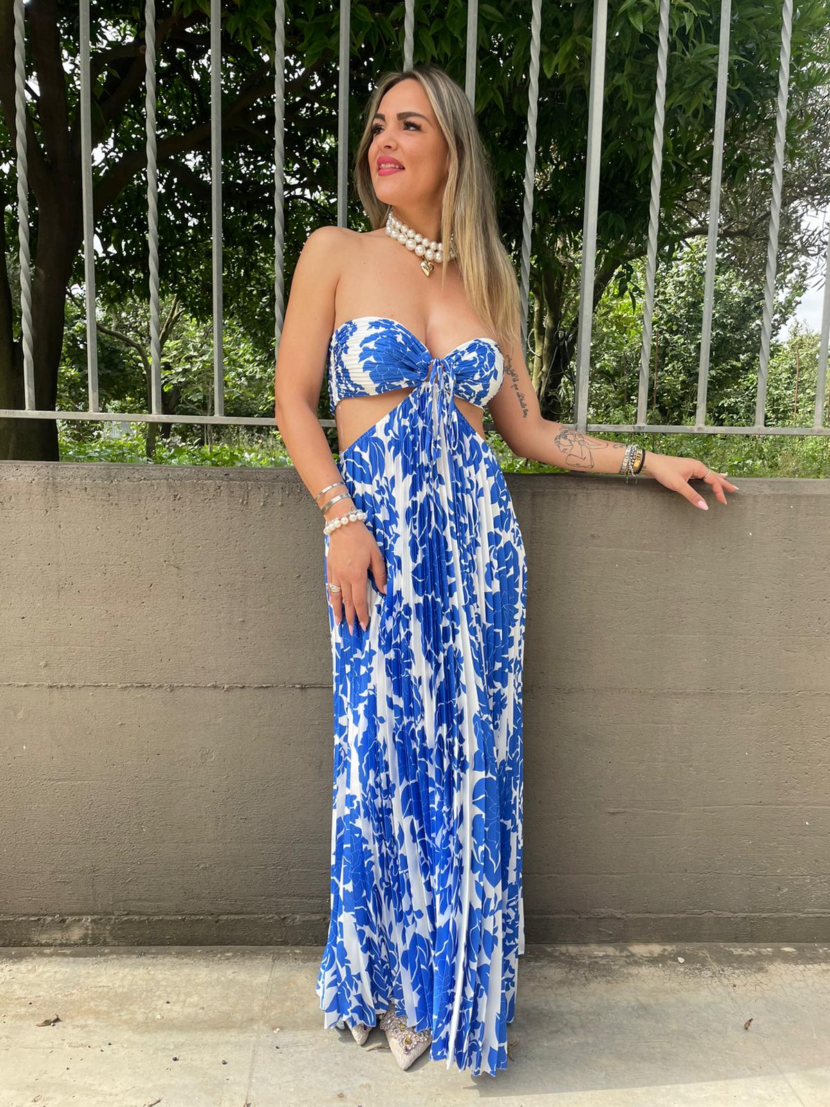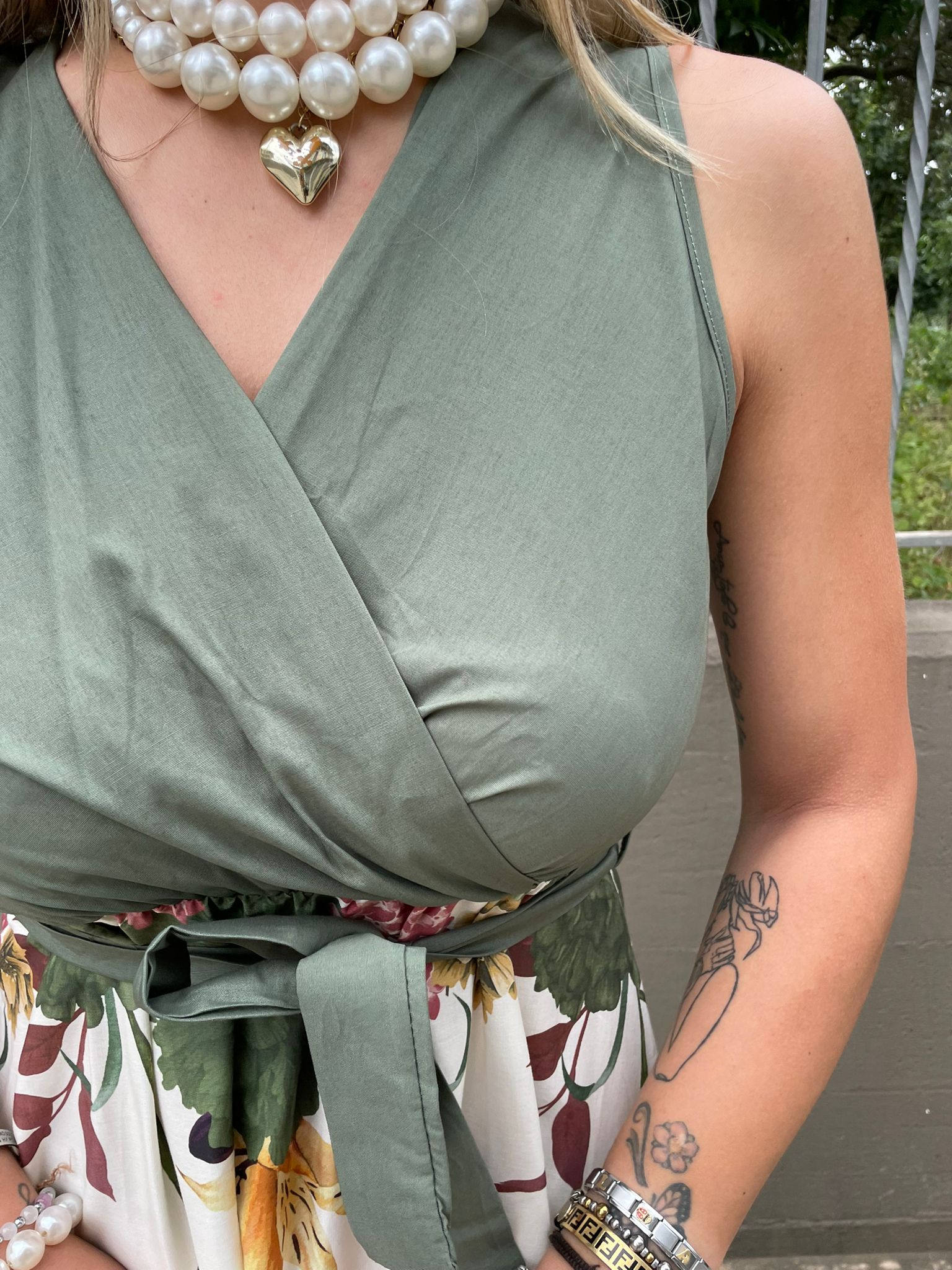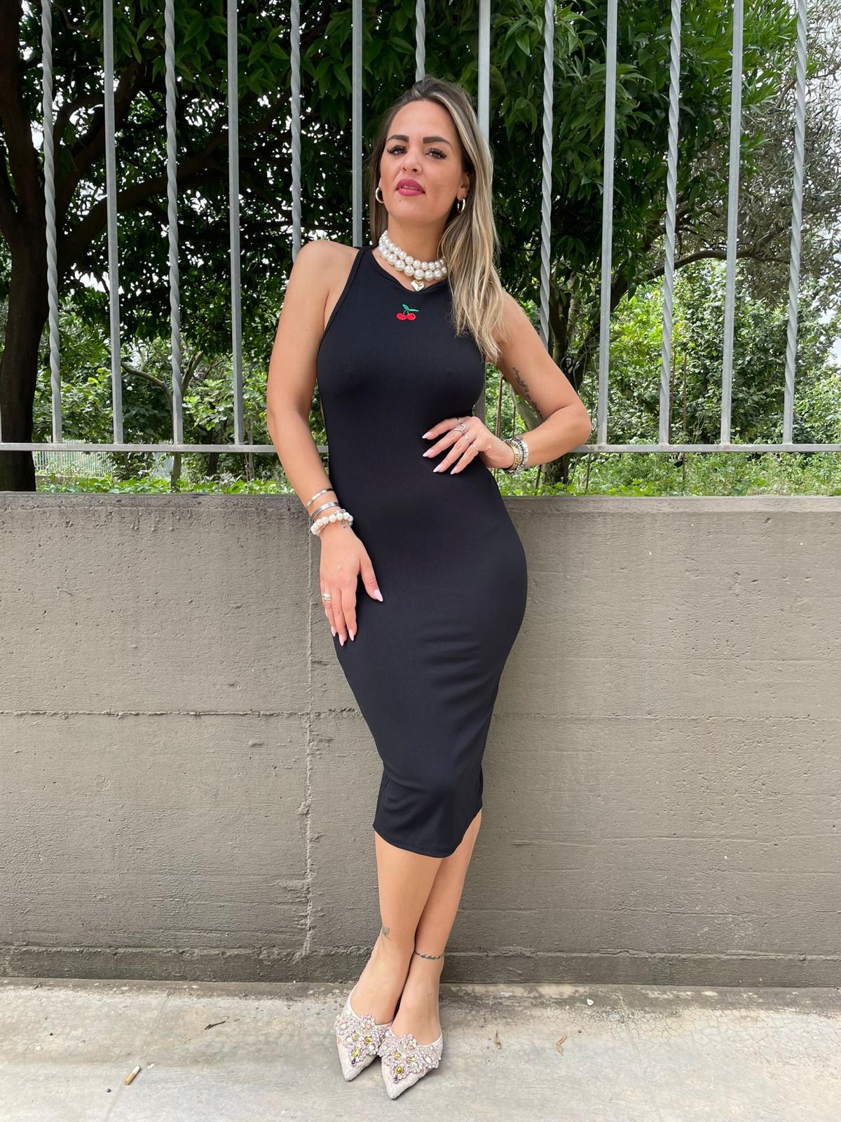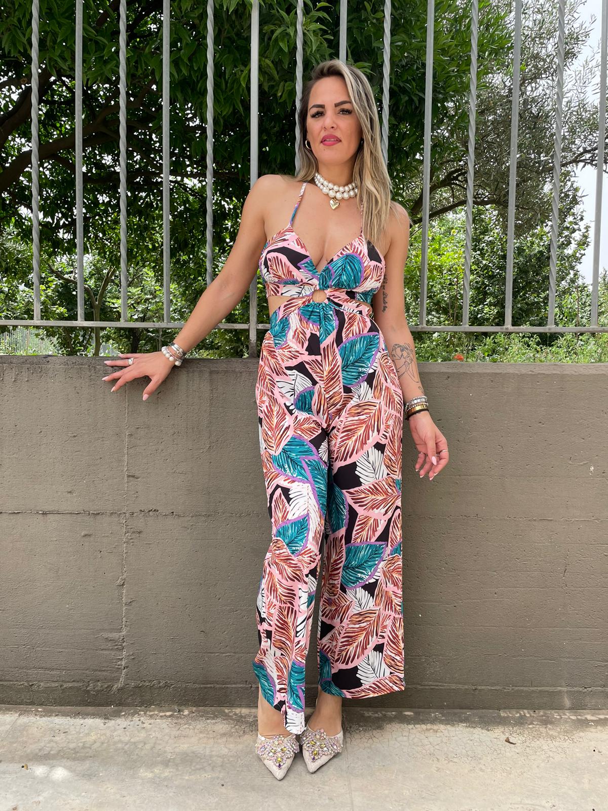 Vestito midi fantasia fiori scampanato con laccetti alle spalle