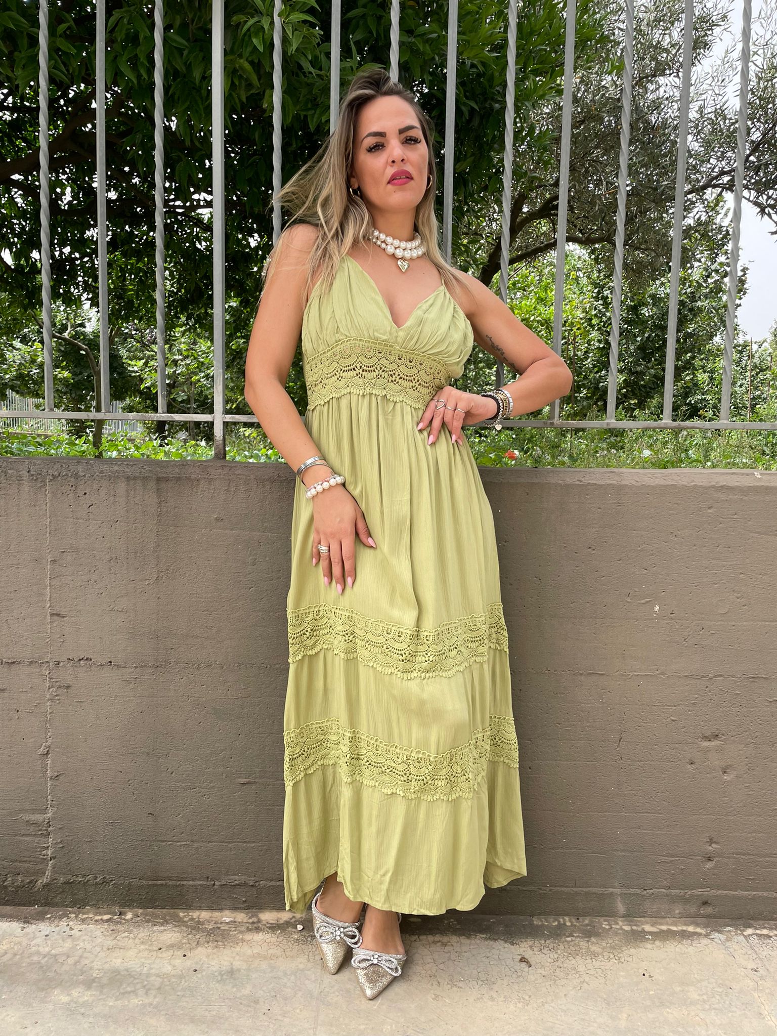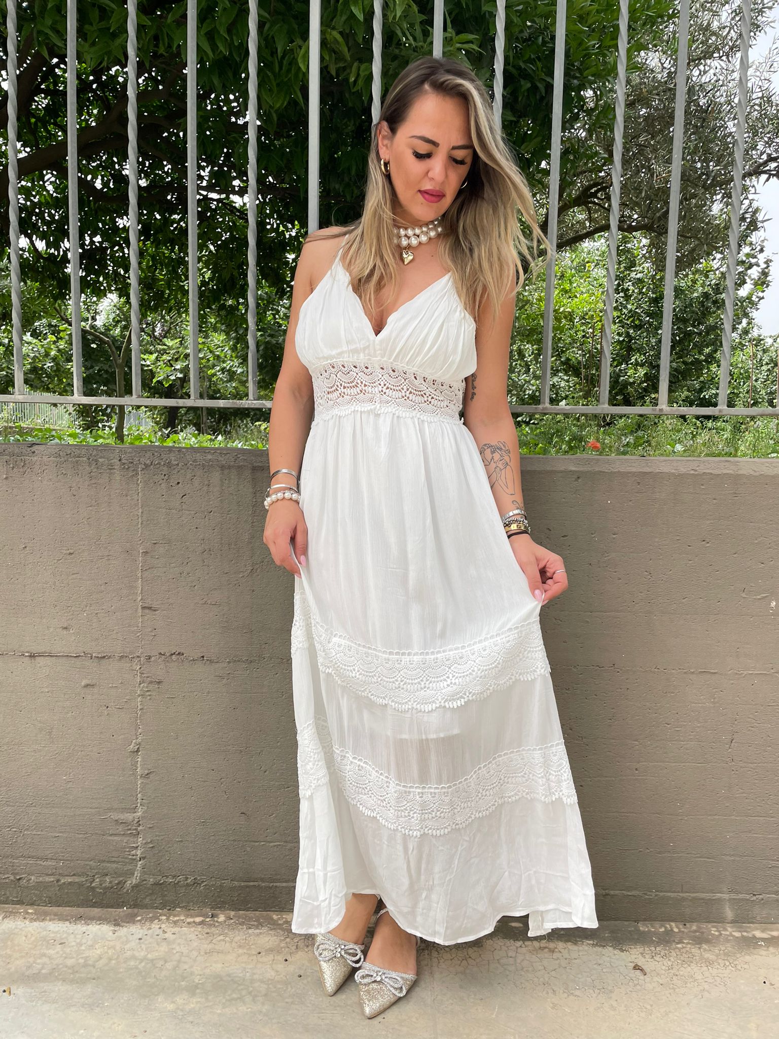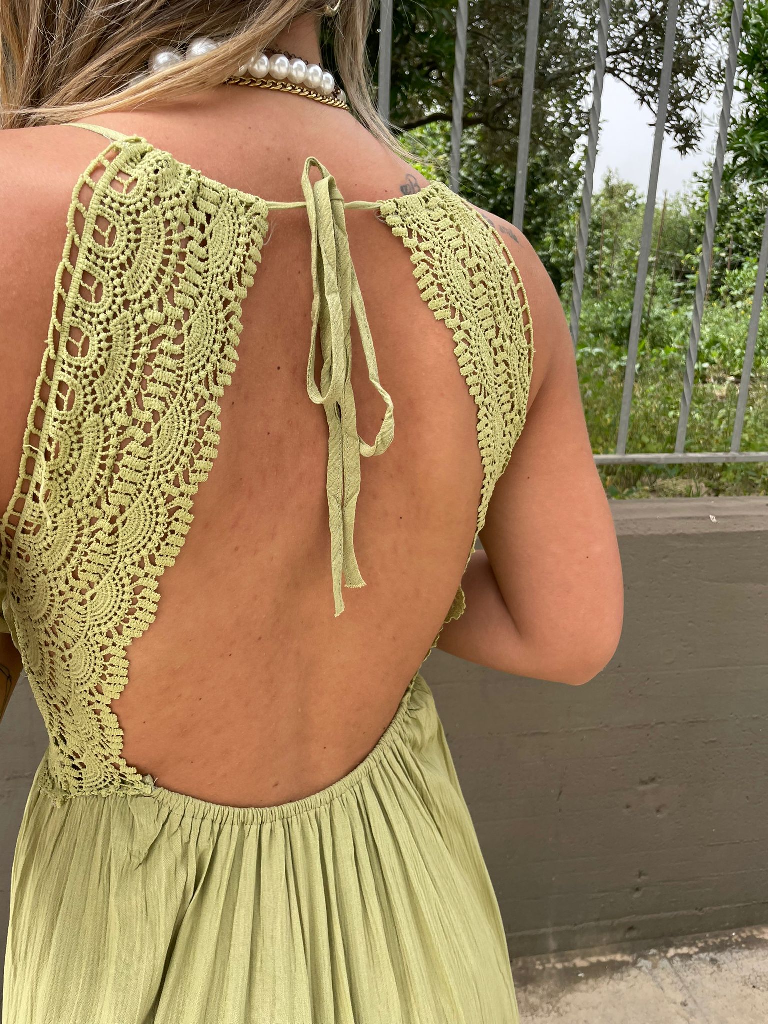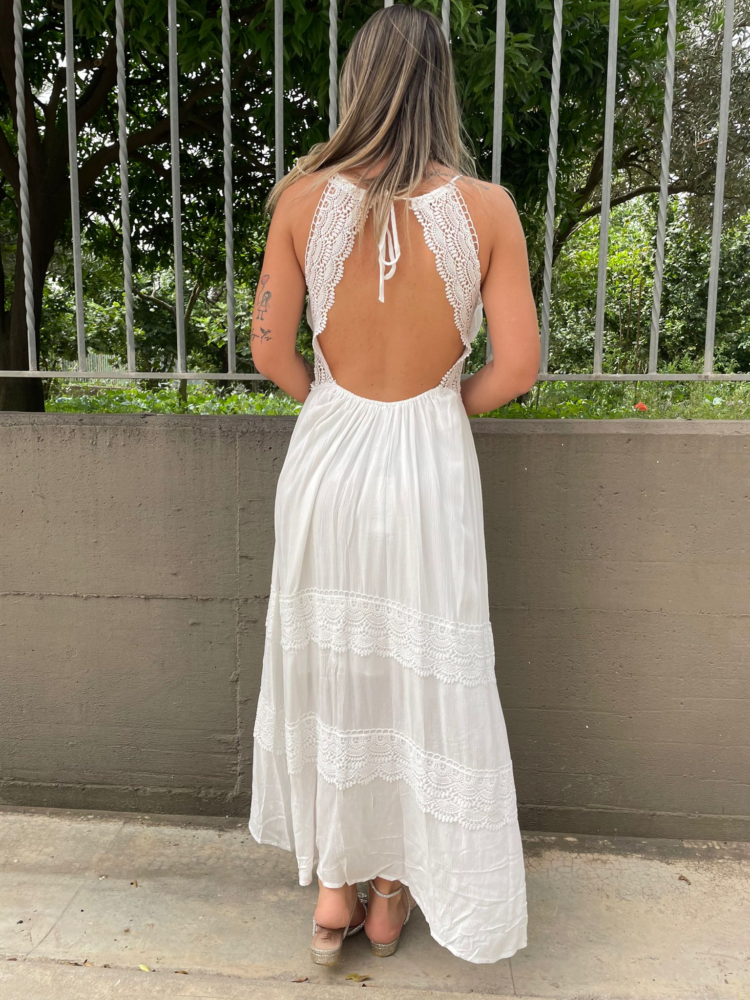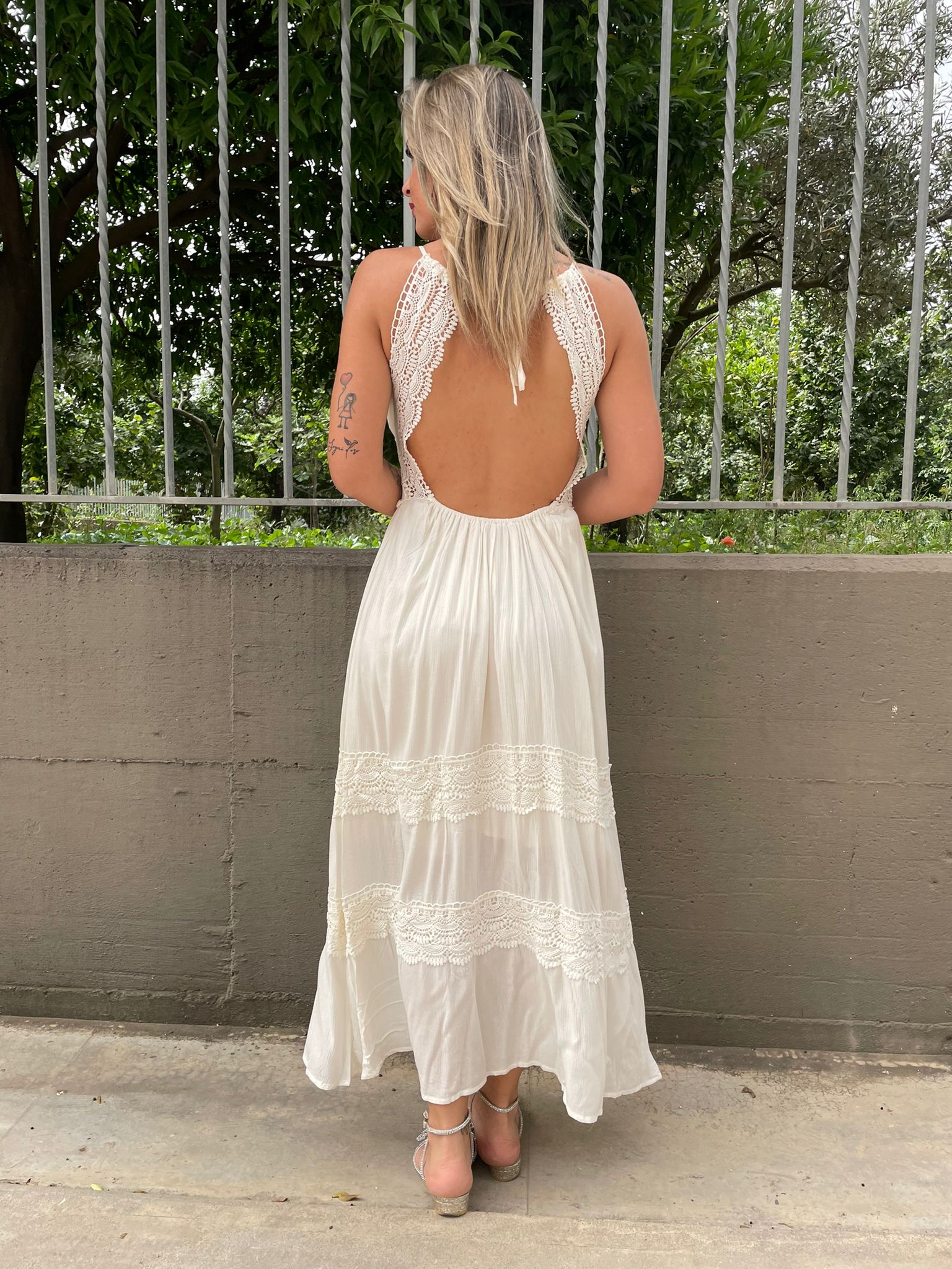 Vestito lungo effetto lino con parti ricamate e schiena scoperta