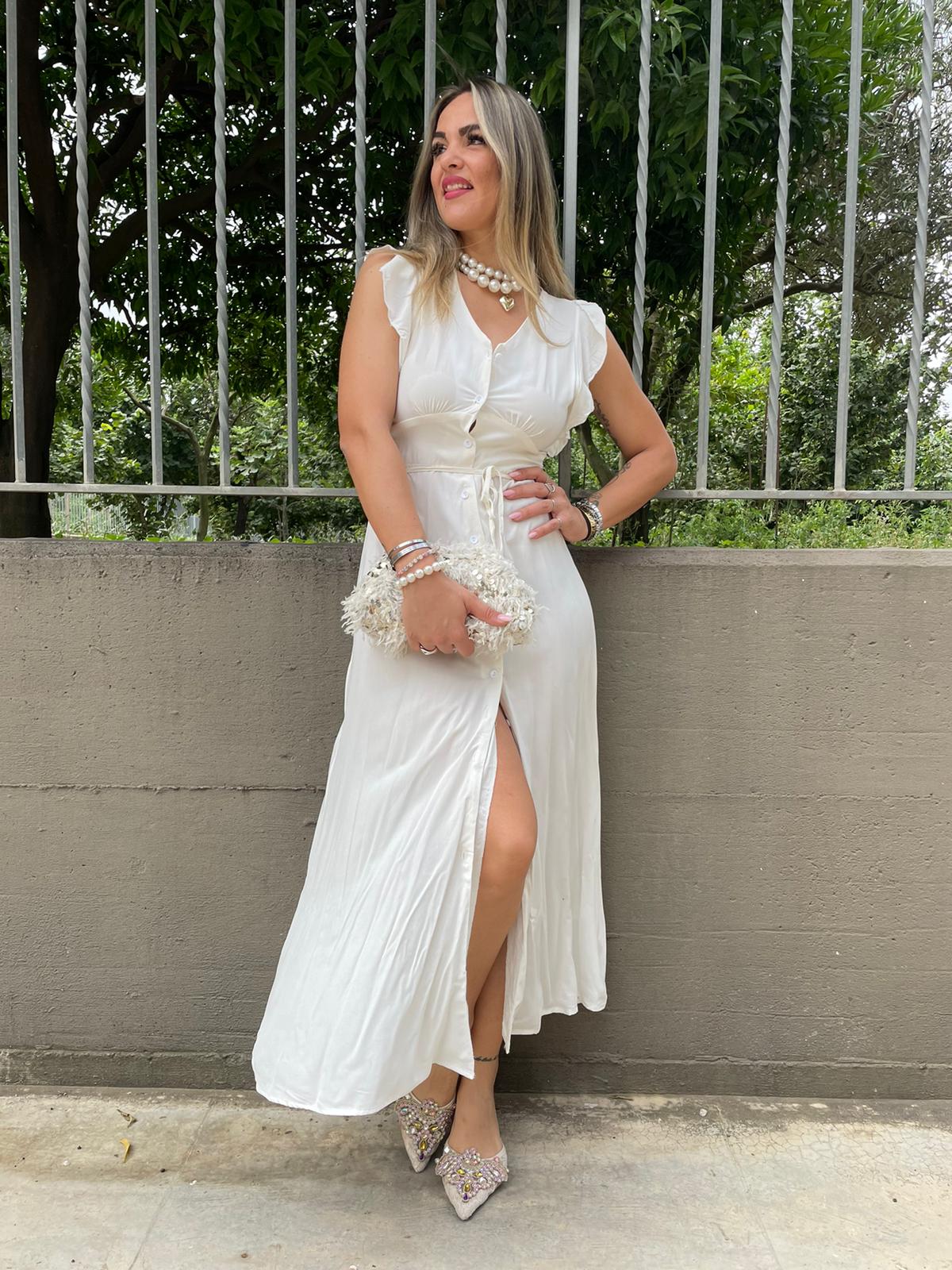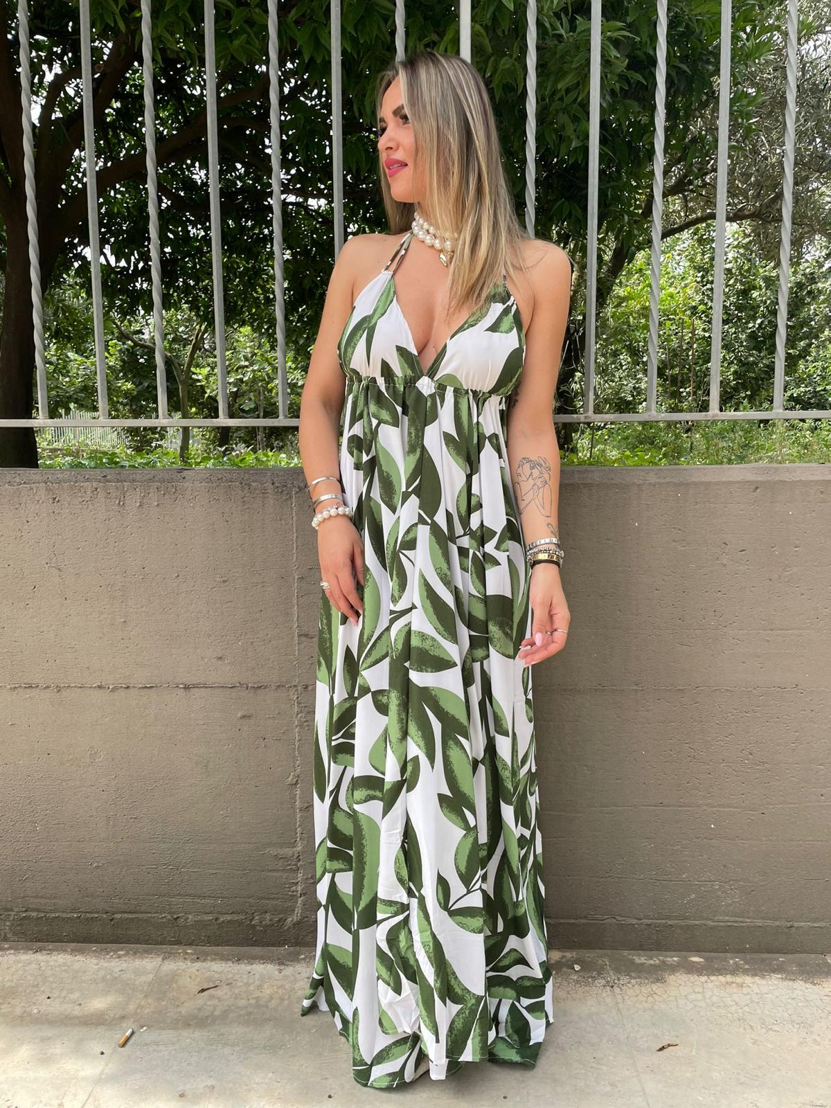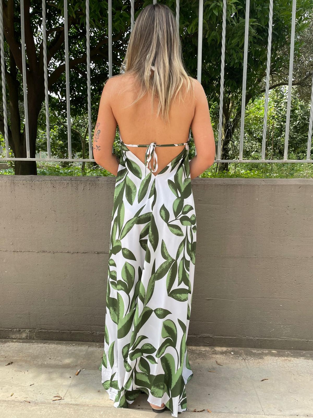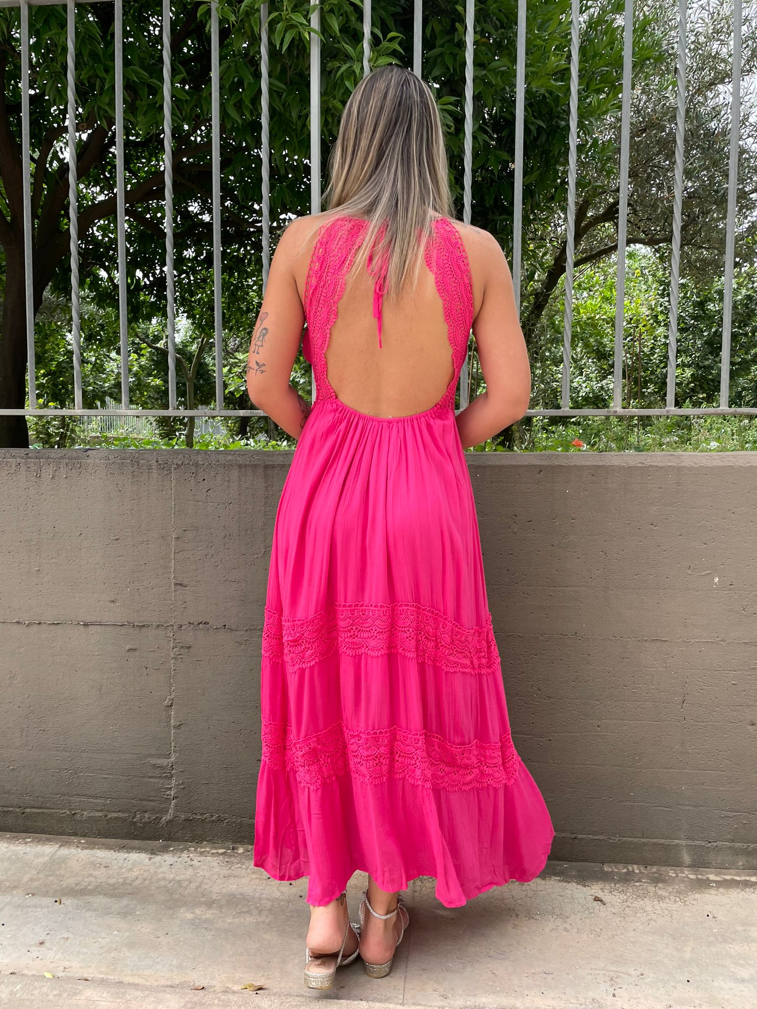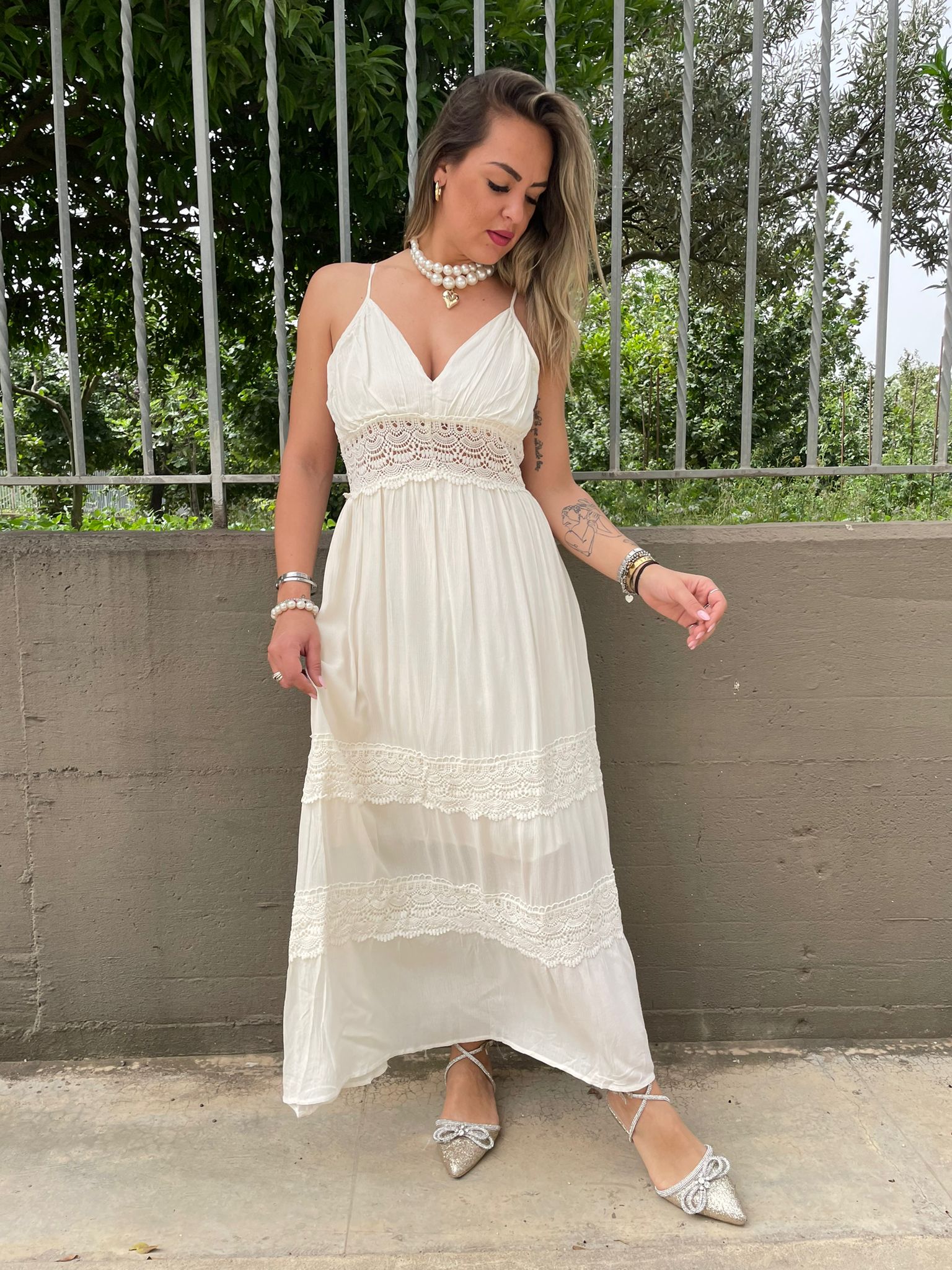Vestito lungo effetto lino con parti ricamate e schiena scoperta