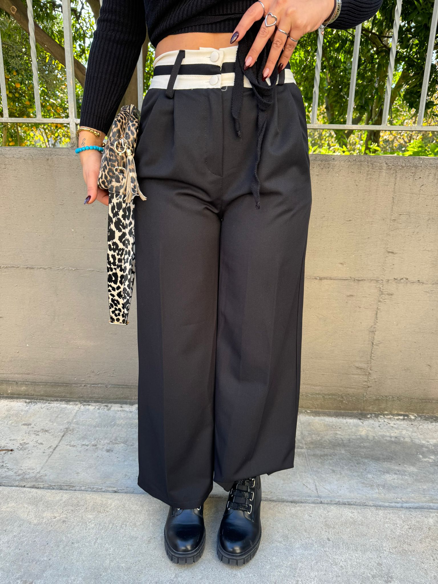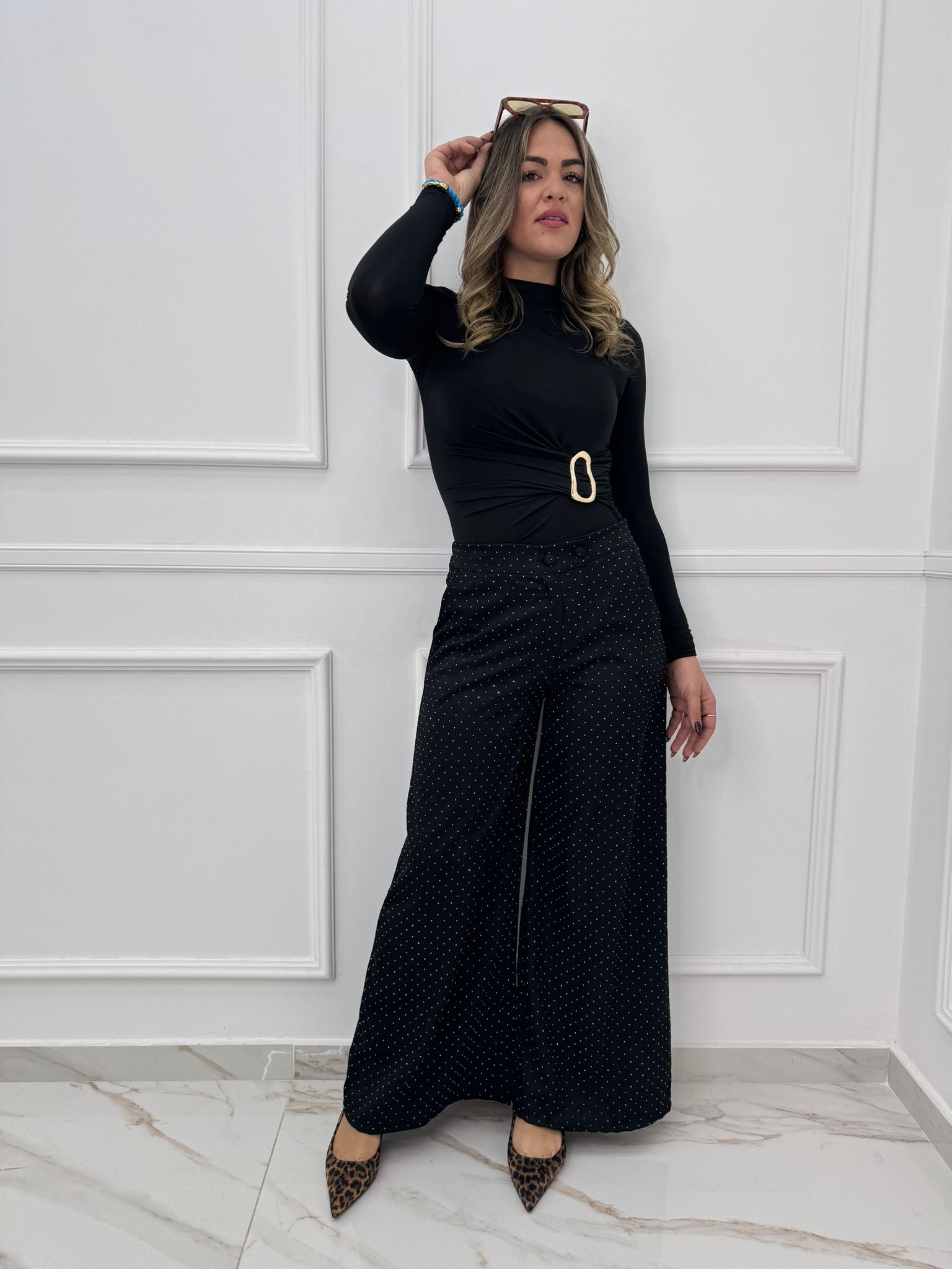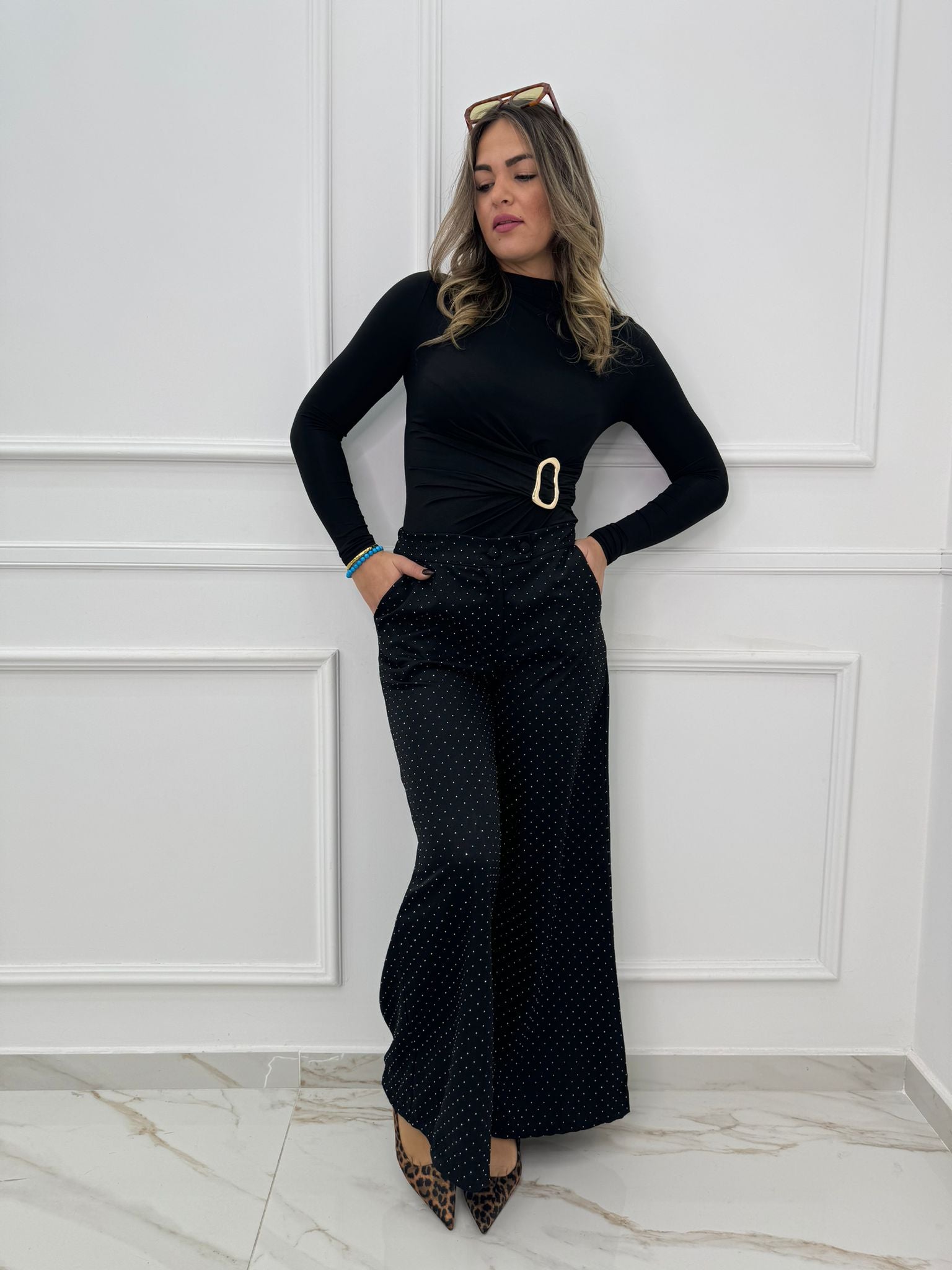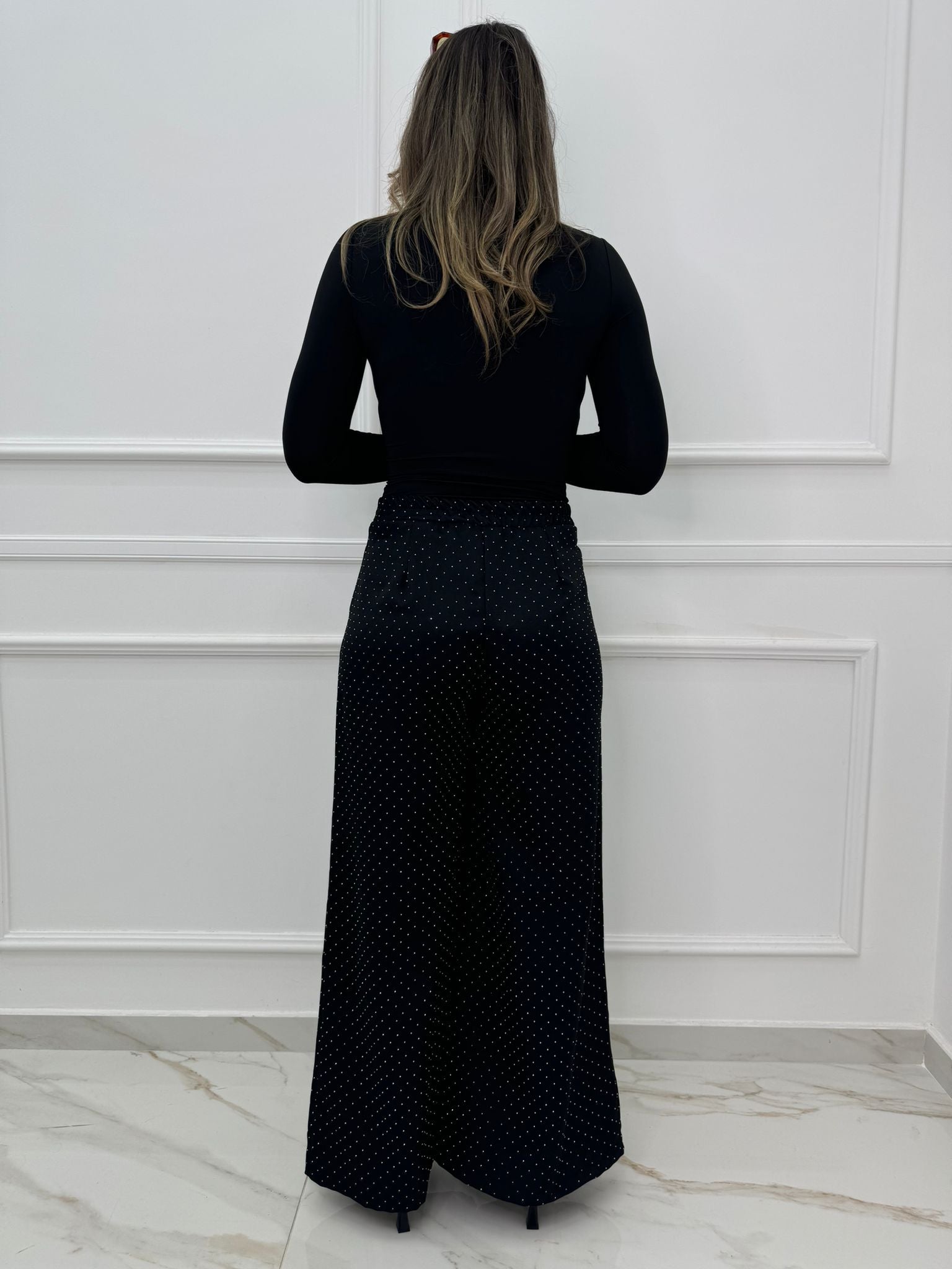 Pantalone nero palazzo con brillantini