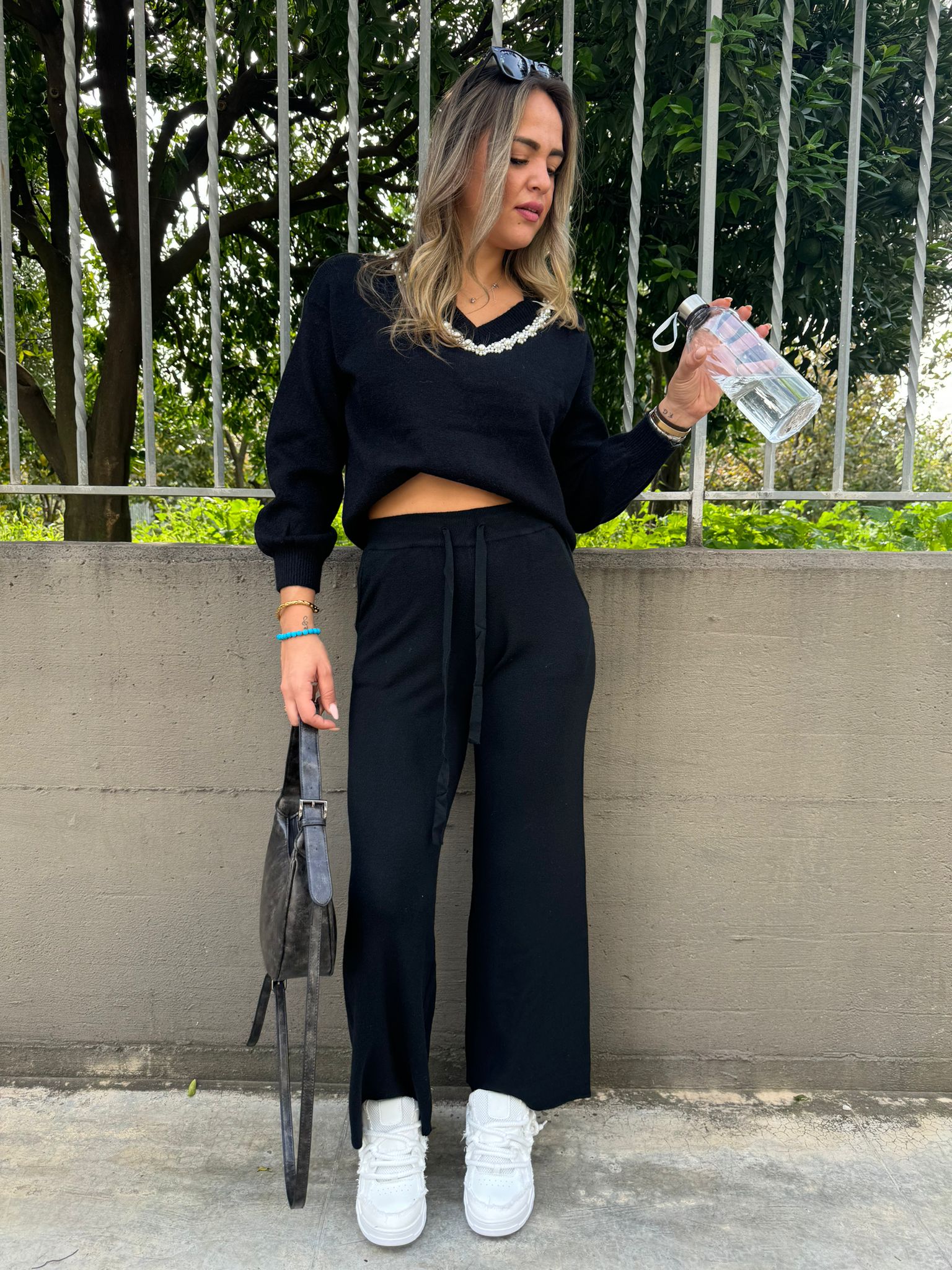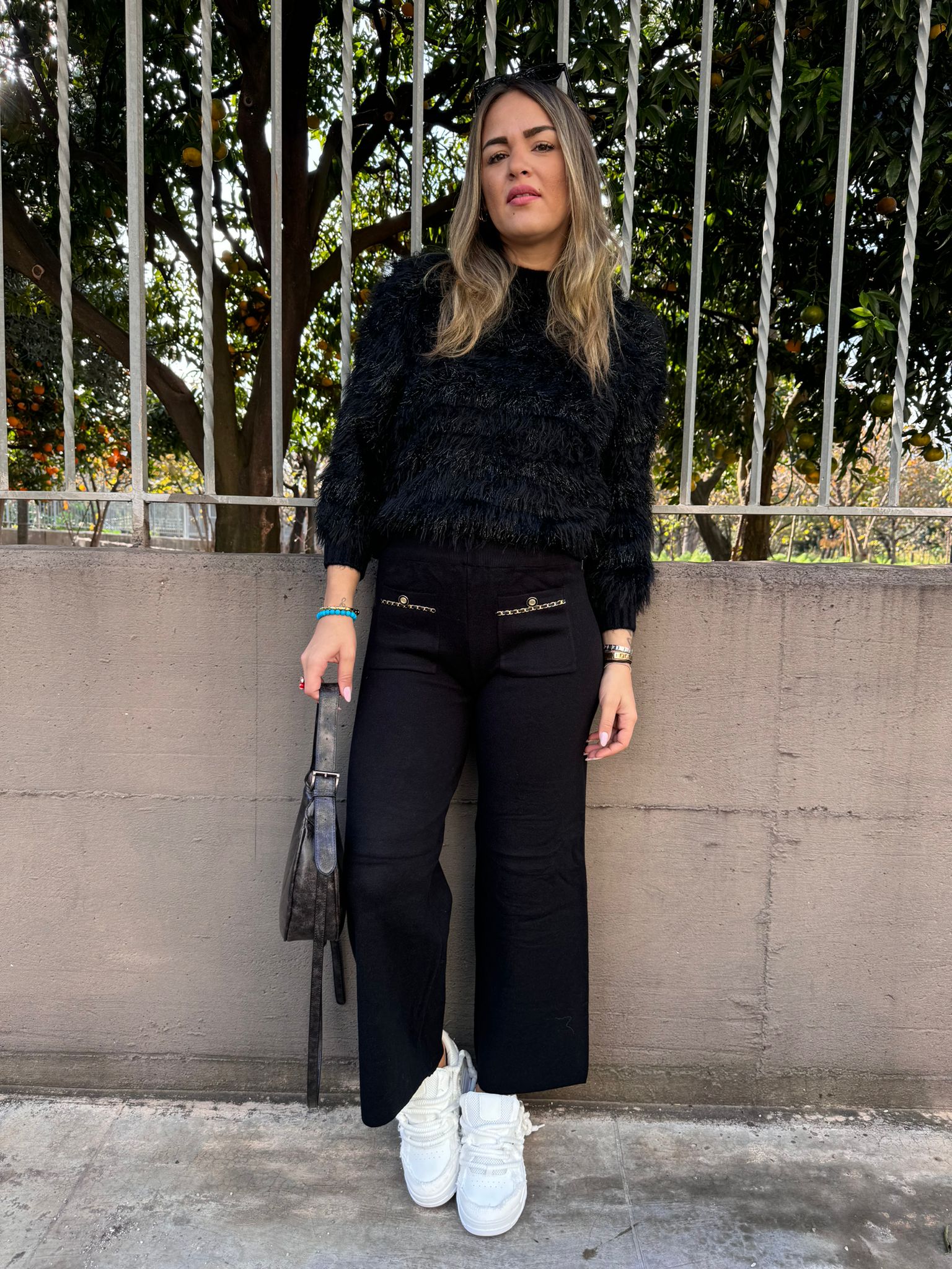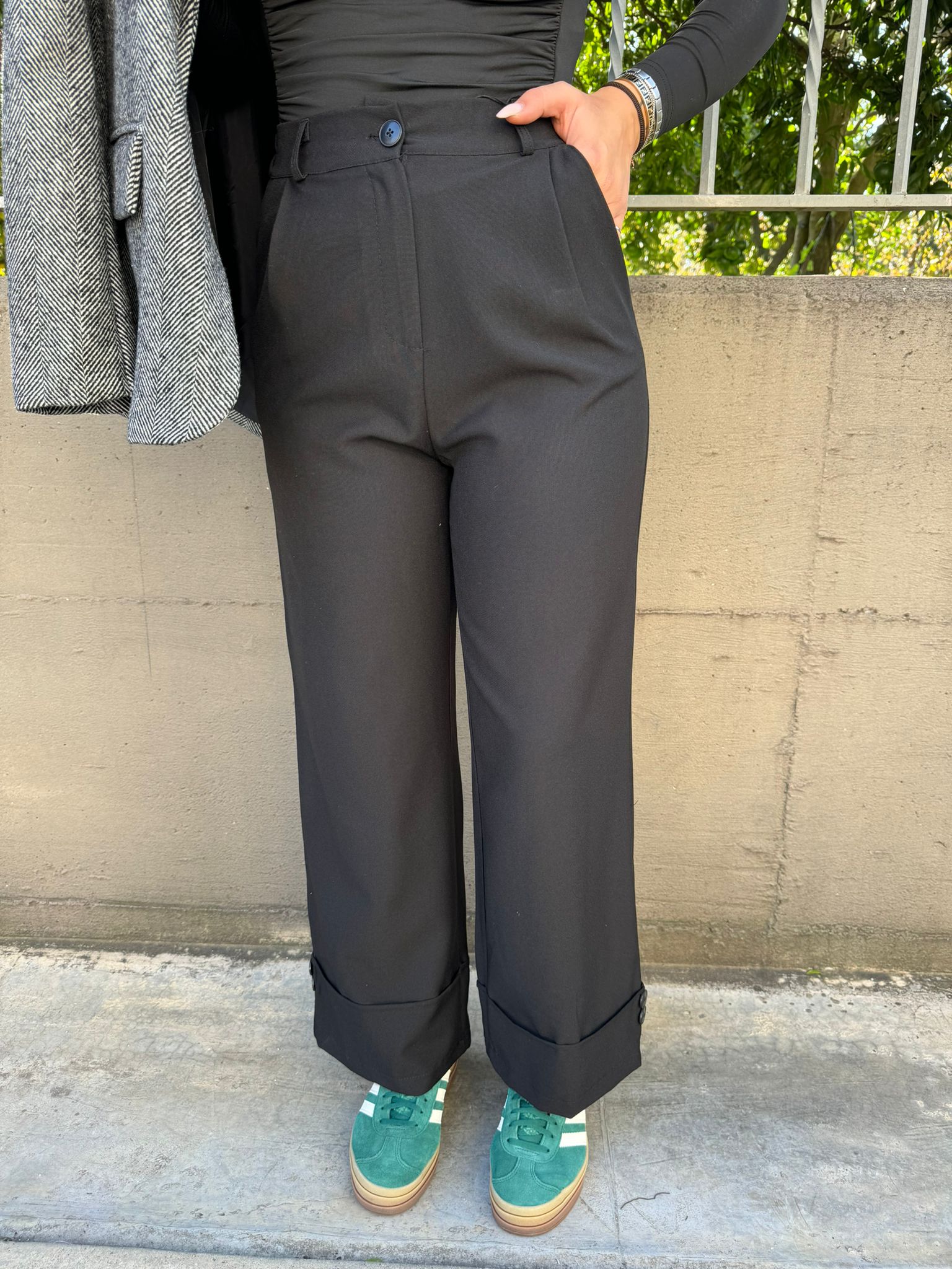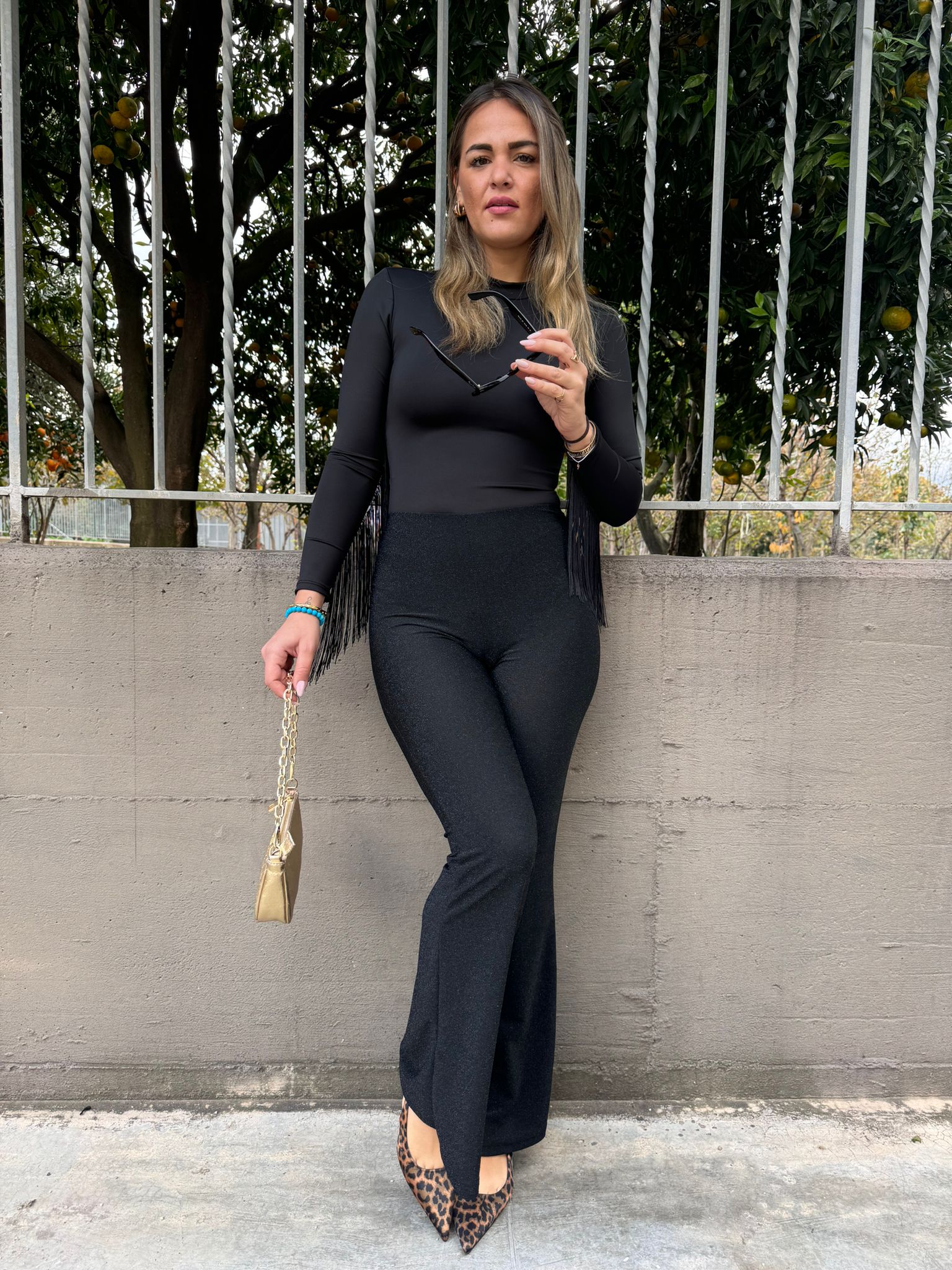 Pantalone nero palazzo con brillantini