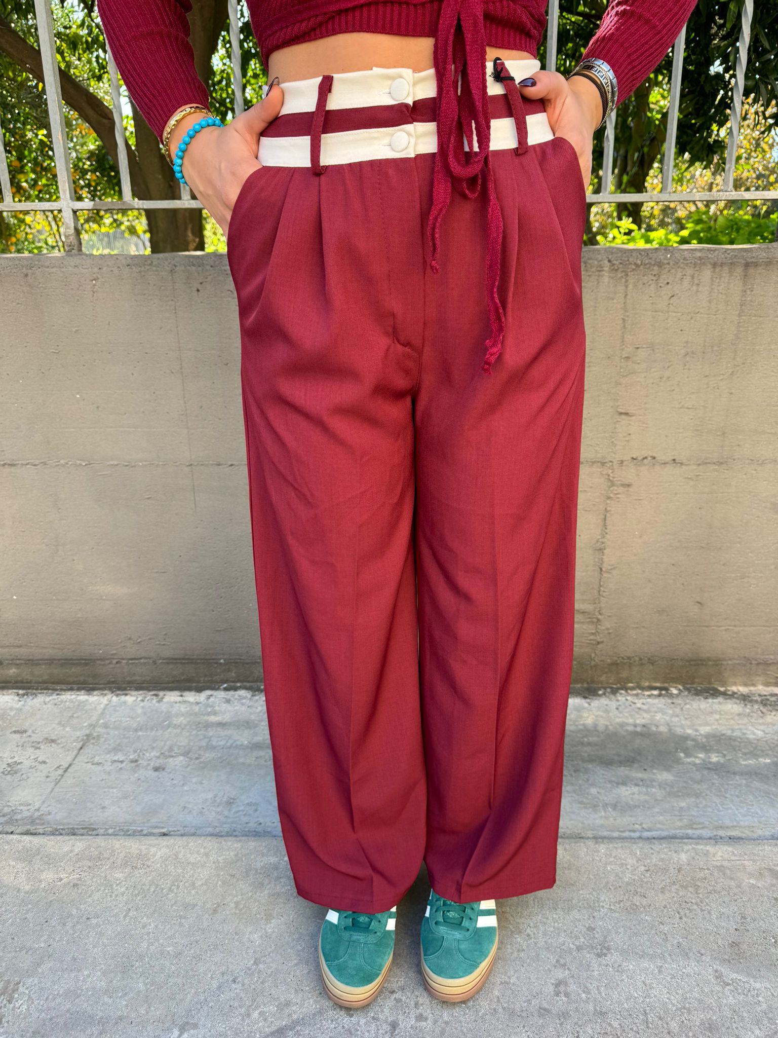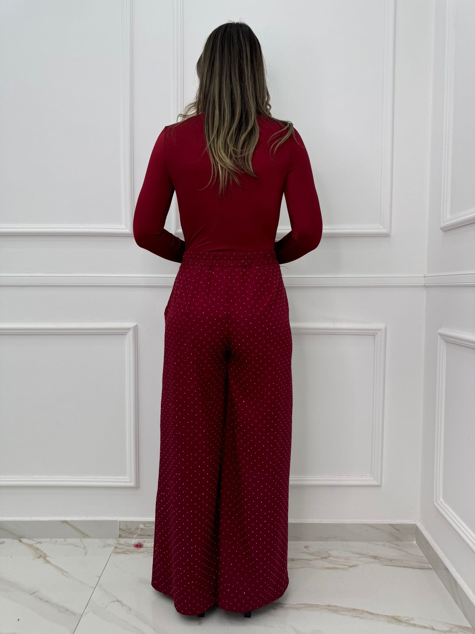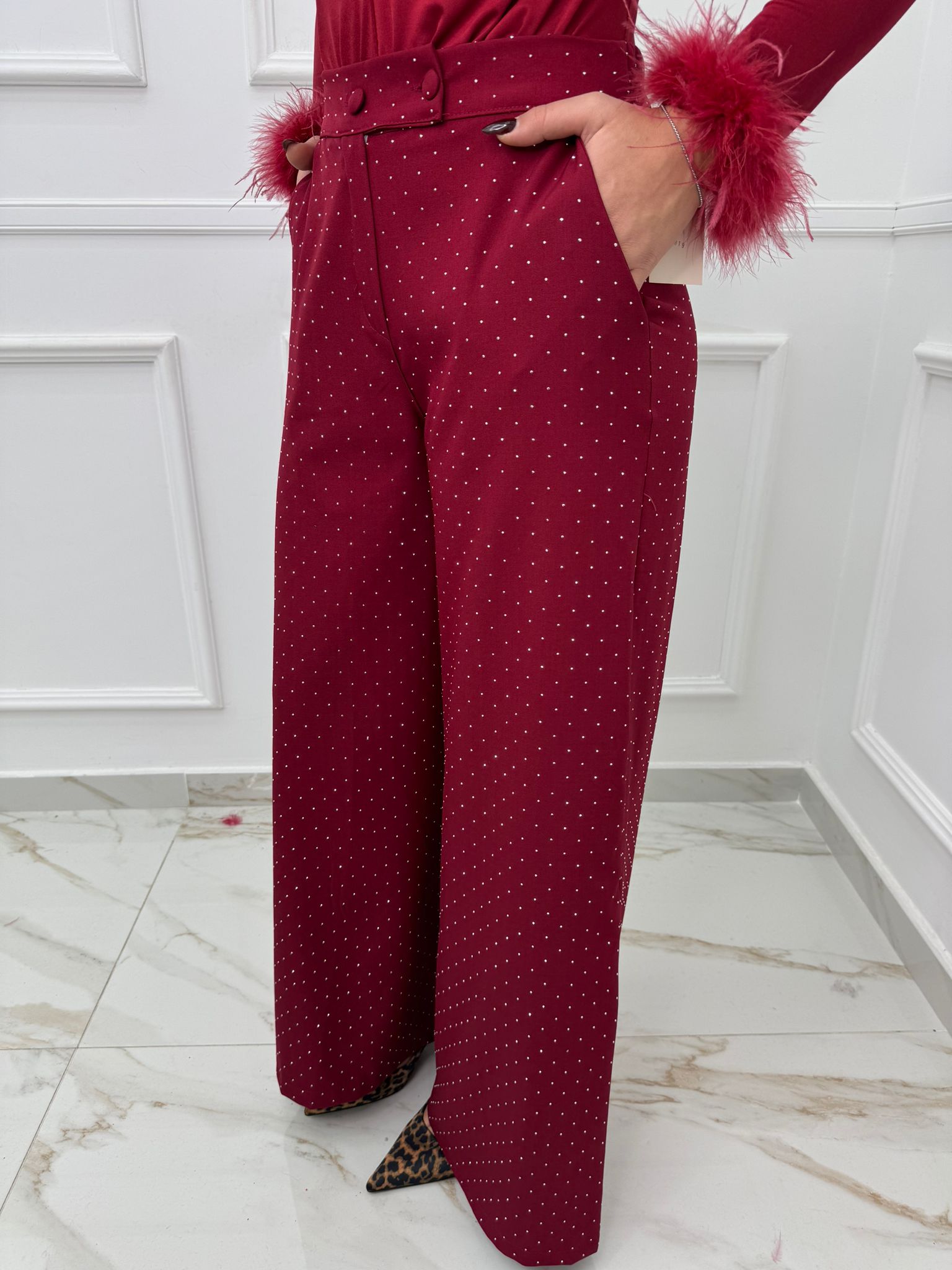 Pantalone bordeaux palazzo con brillantini