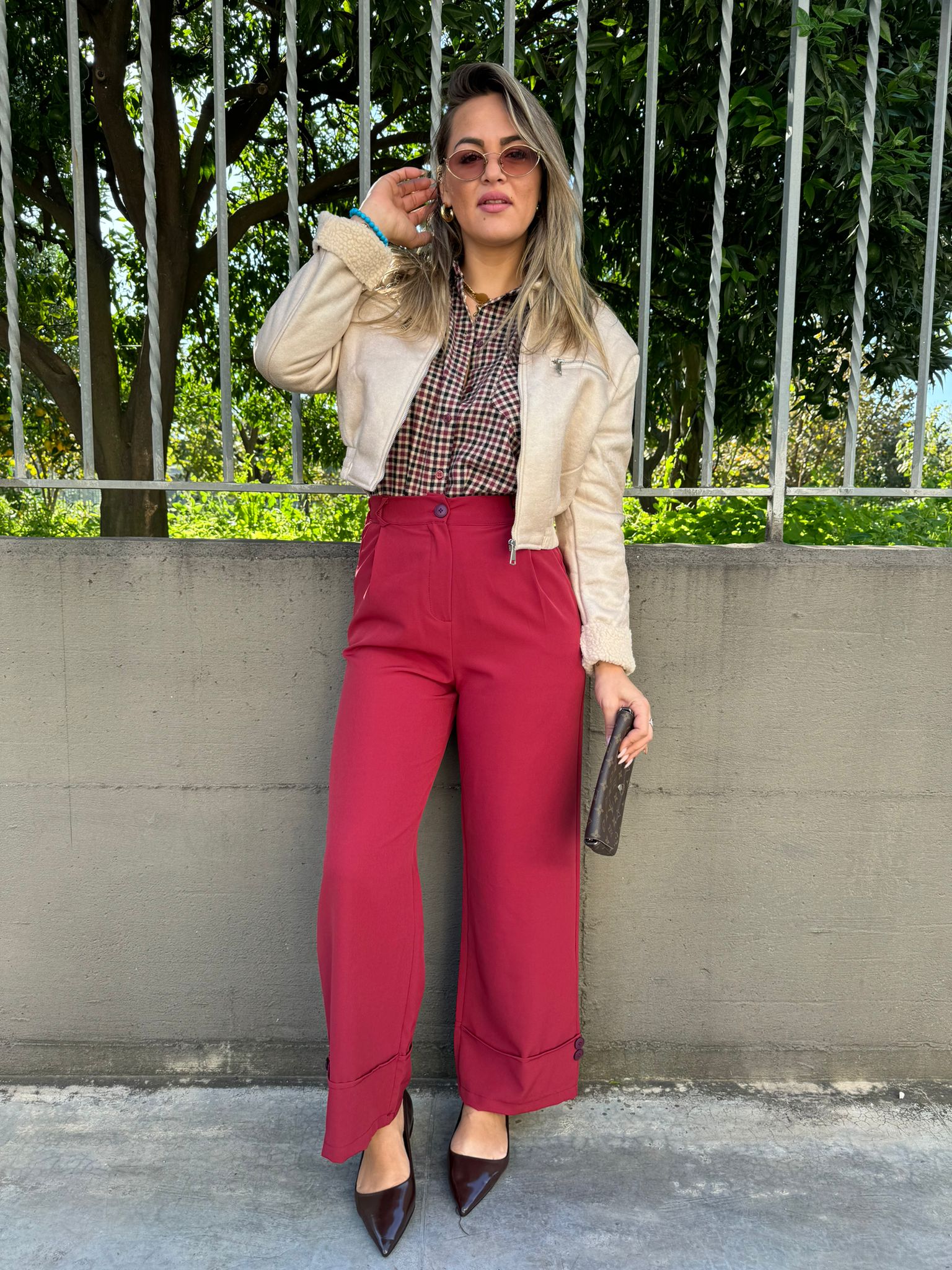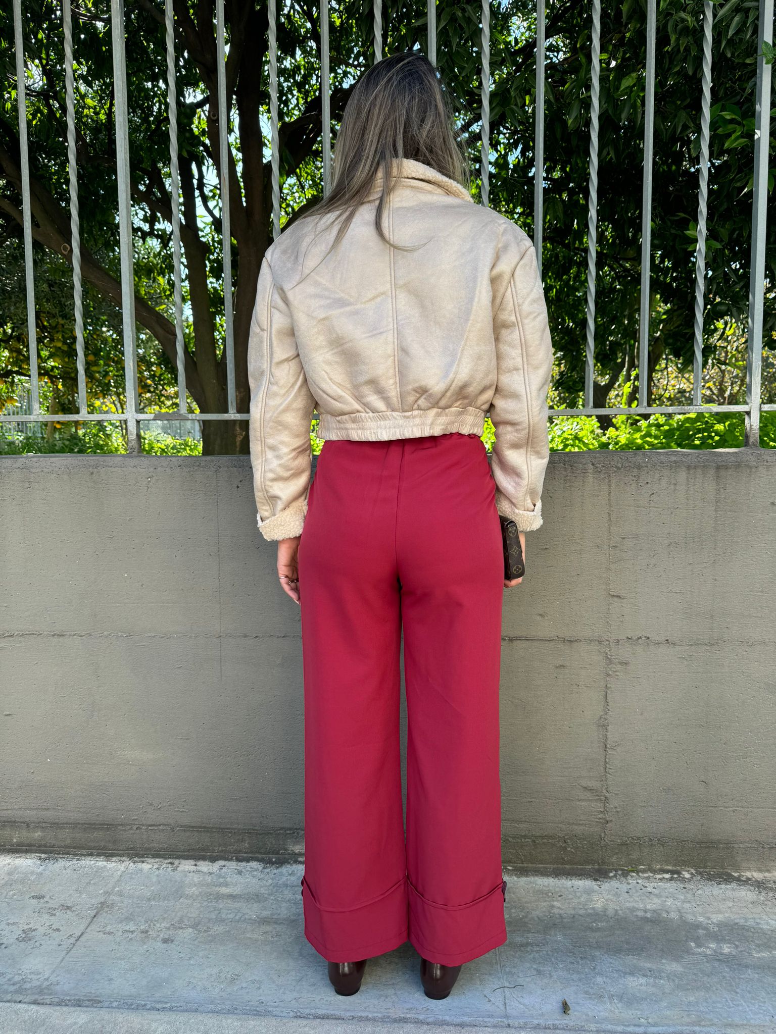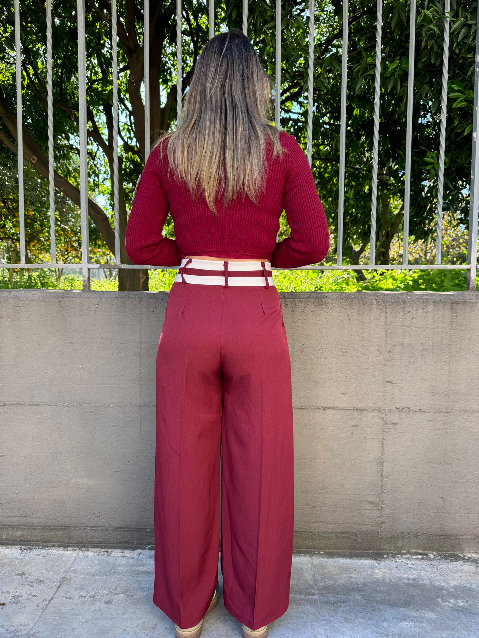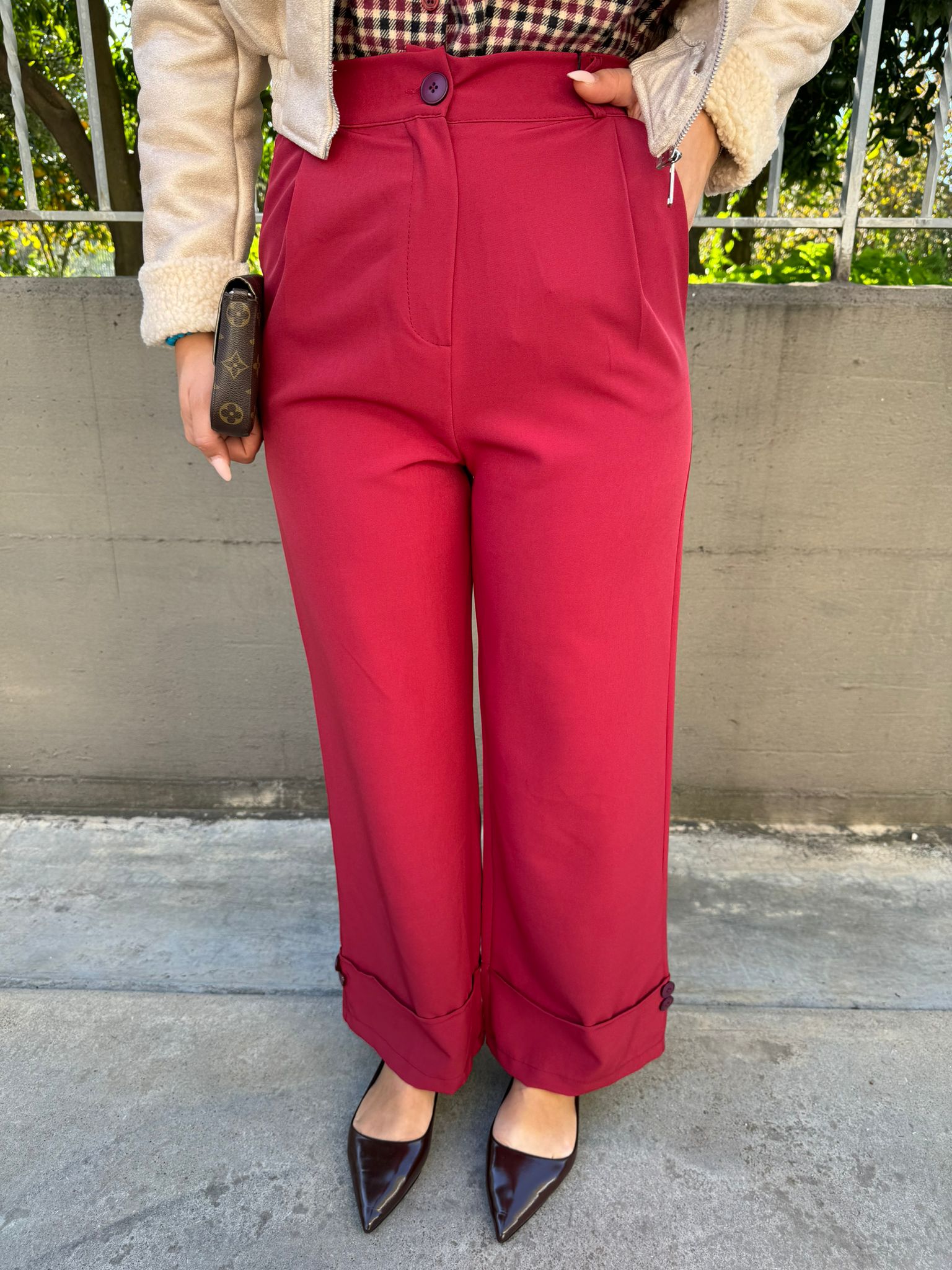 Pantalone bordeaux palazzo con brillantini