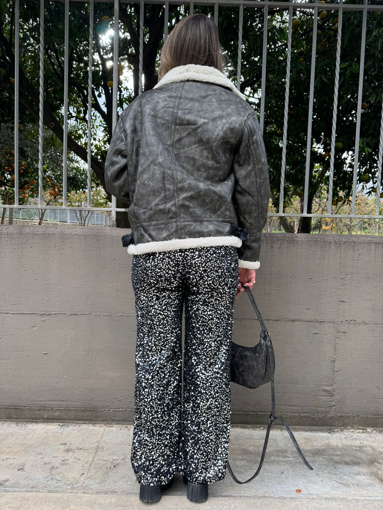 Pantalone nero in paillettes modello palazzo