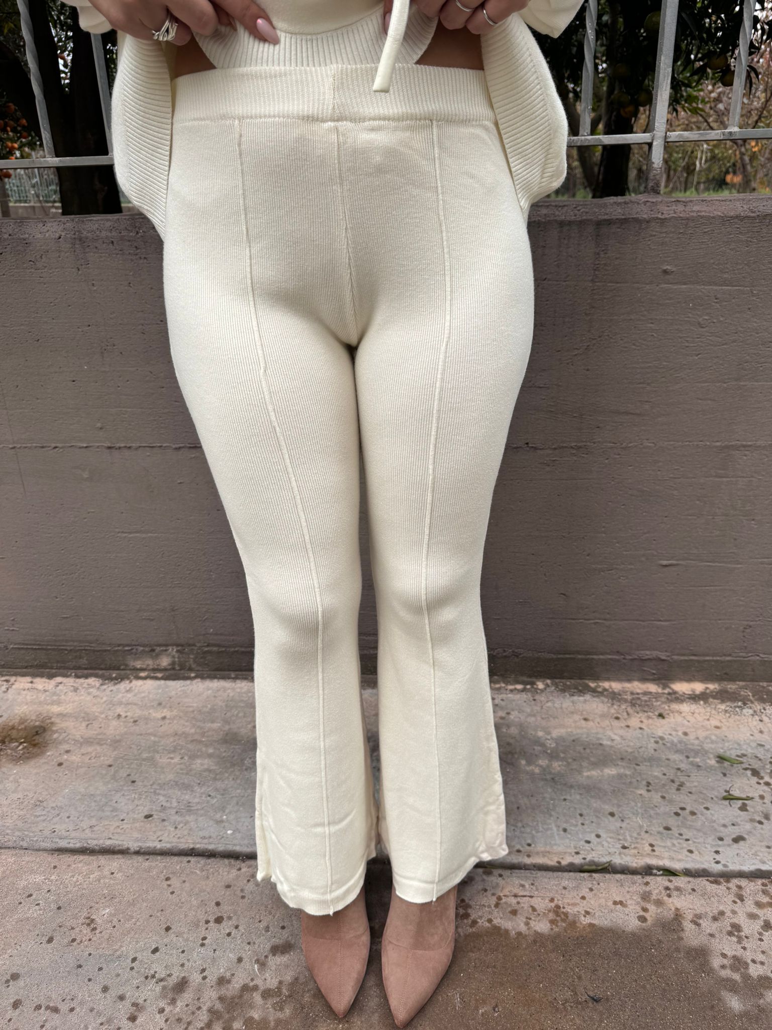 Pantalone in simil lana modello a zampa con riga