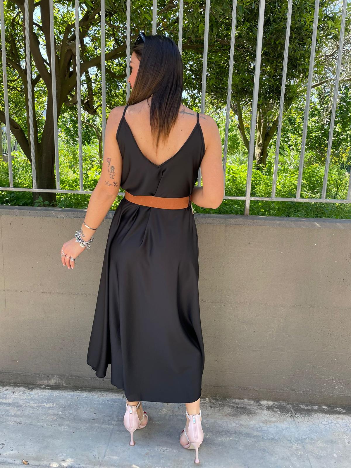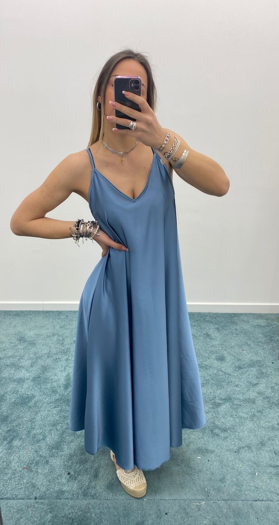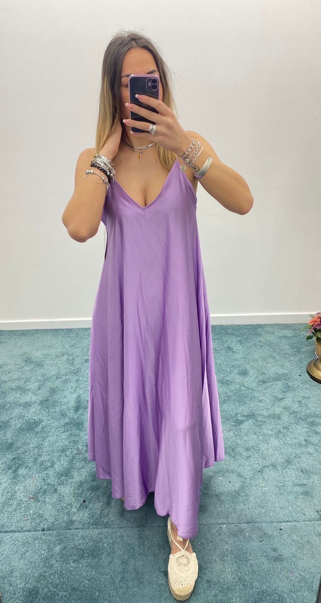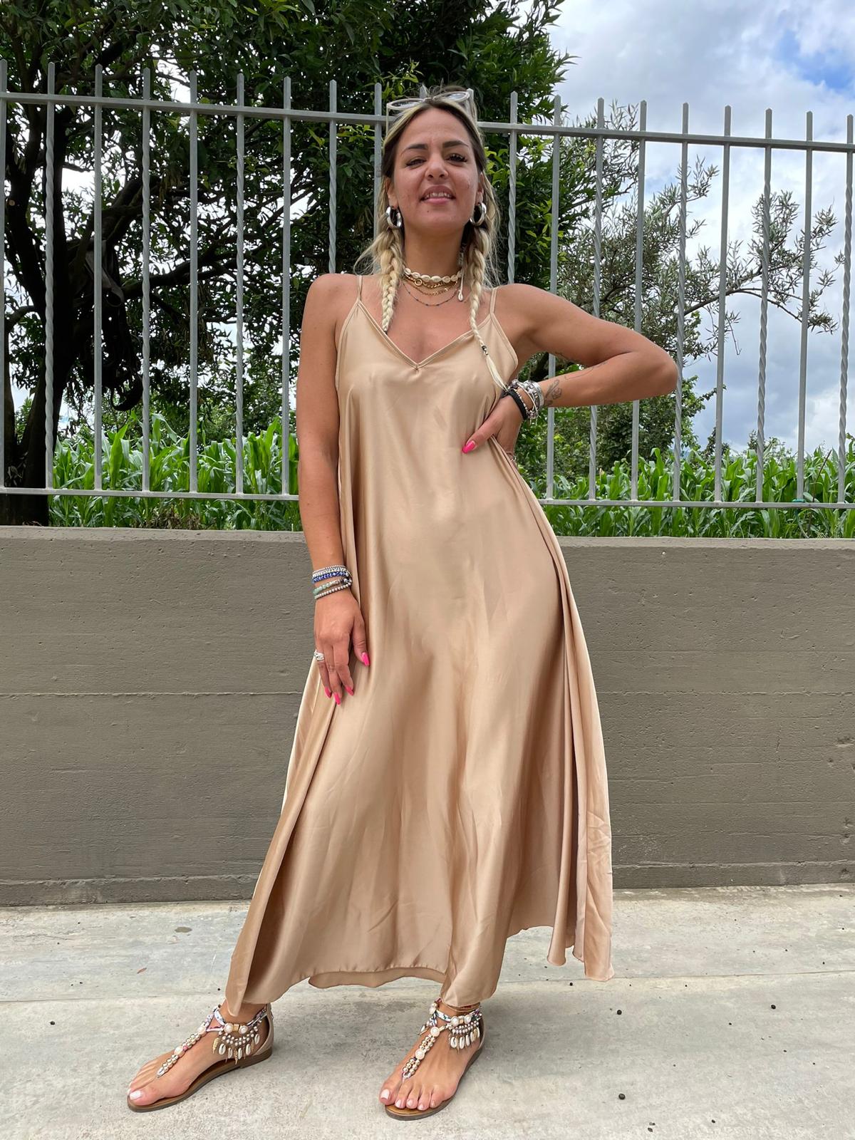 vestito lungo, effetto seta, modello semplice, scollato dietro, disponibile in diversi colori, taglia unica, veste tranquillamente fino ad unta taglia "L", la modella è alta 1.79