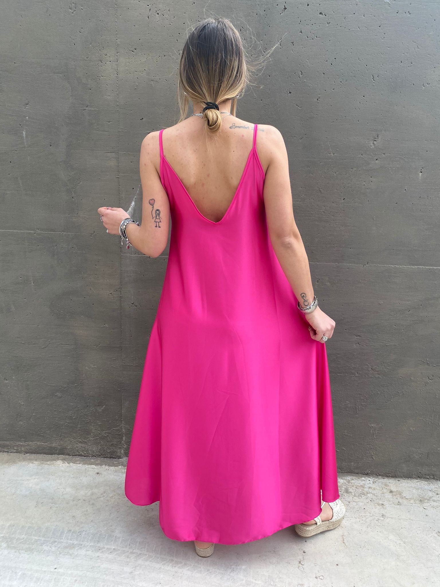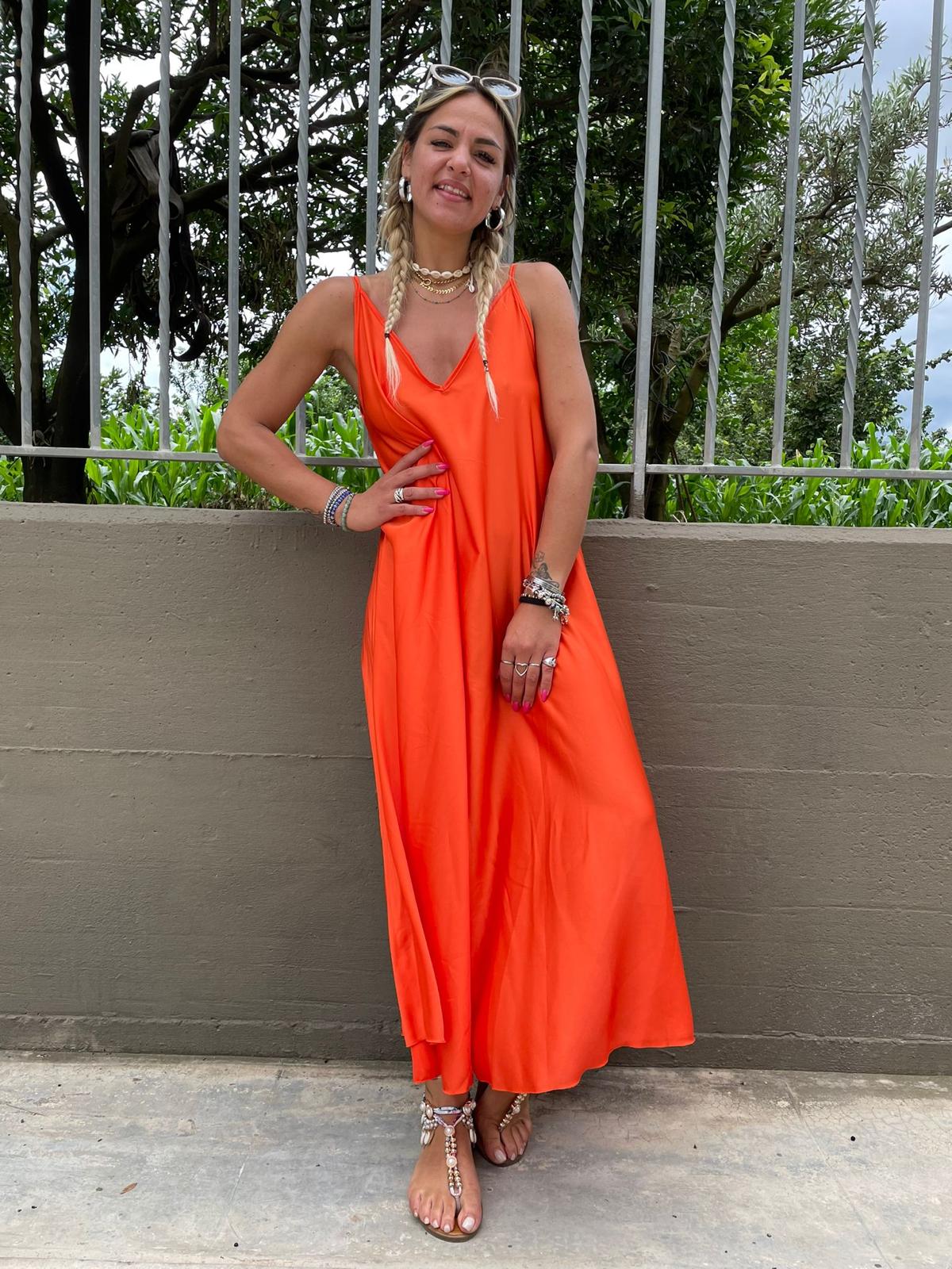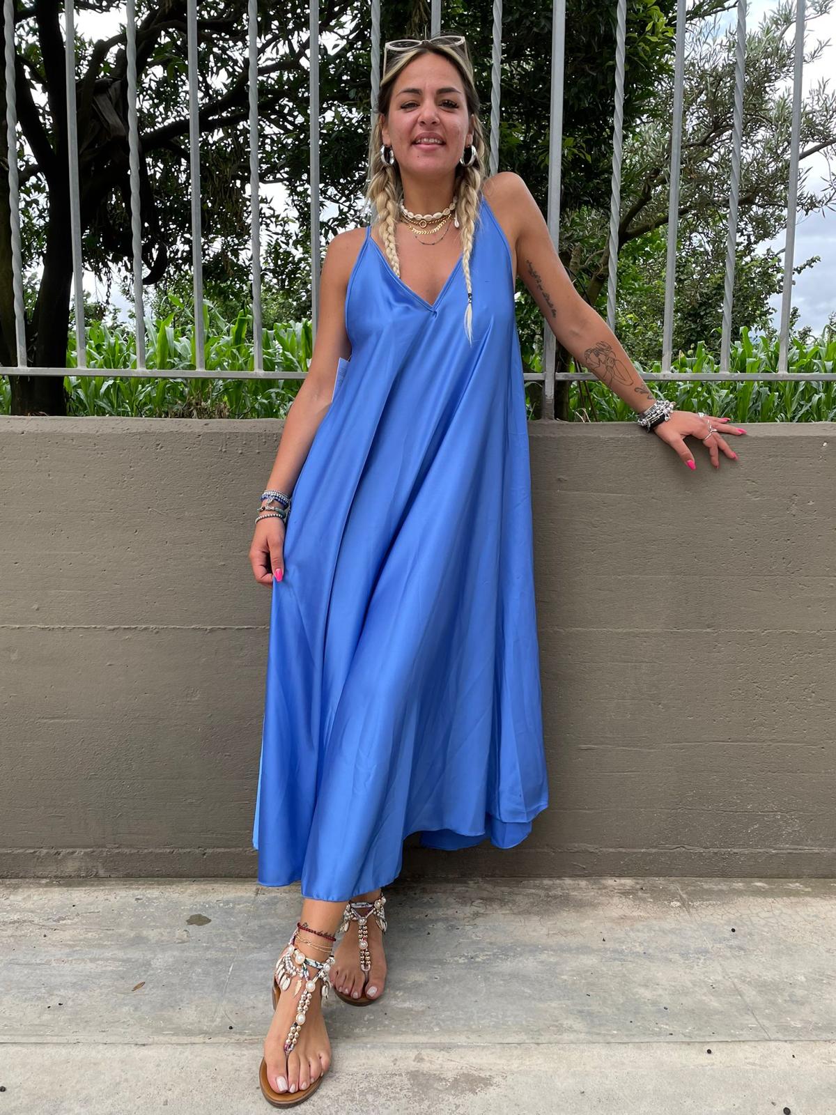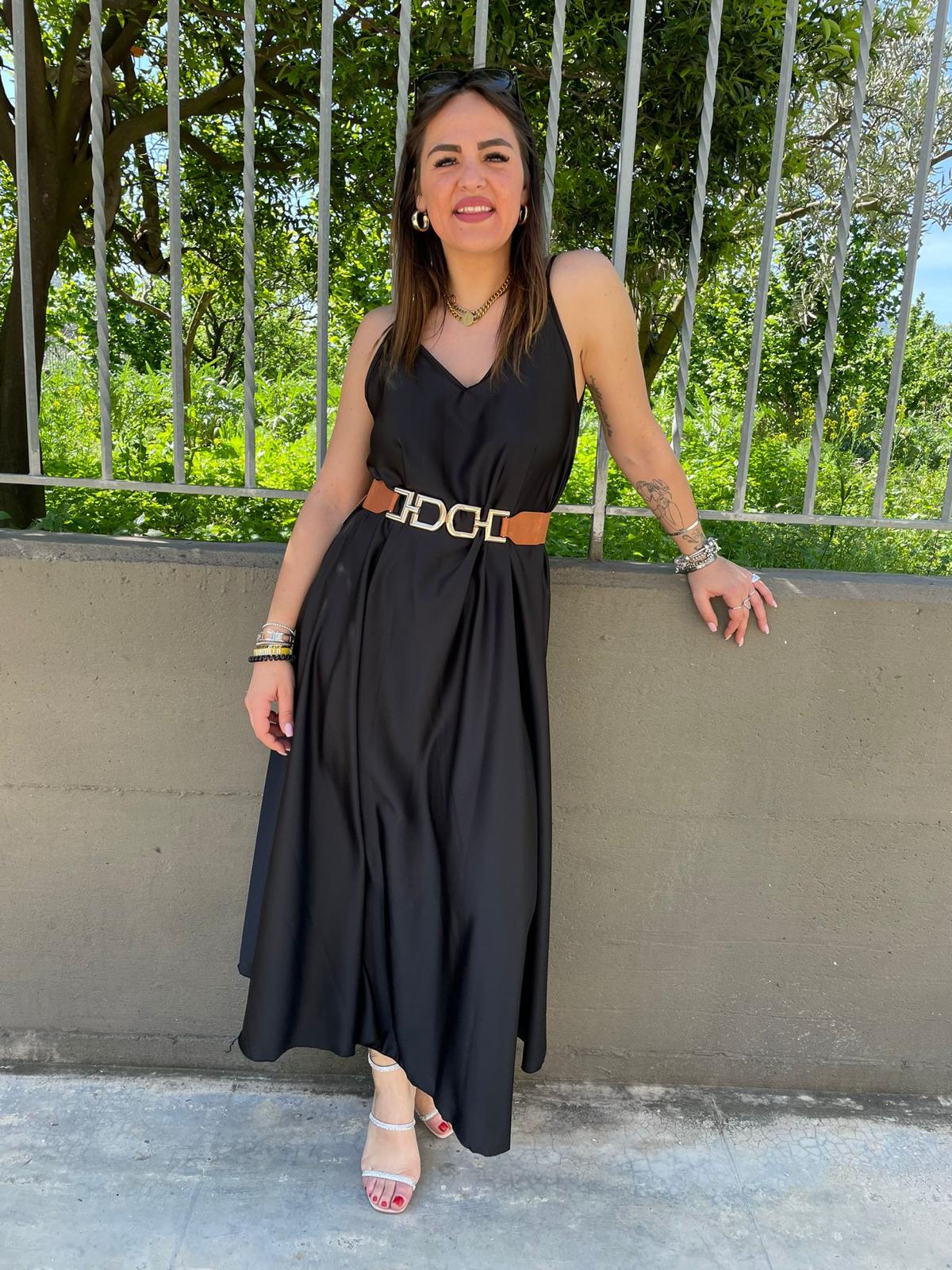 vestito lungo, effetto seta, modello semplice, scollato dietro, disponibile in diversi colori, taglia unica, veste tranquillamente fino ad unta taglia "L", la modella è alta 1.79